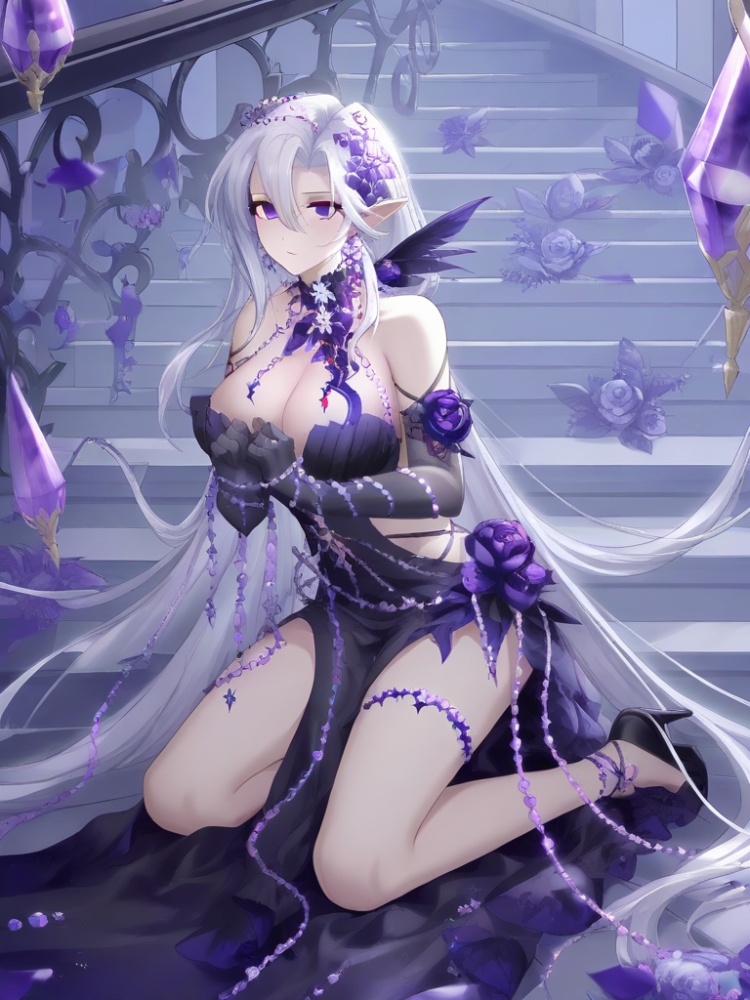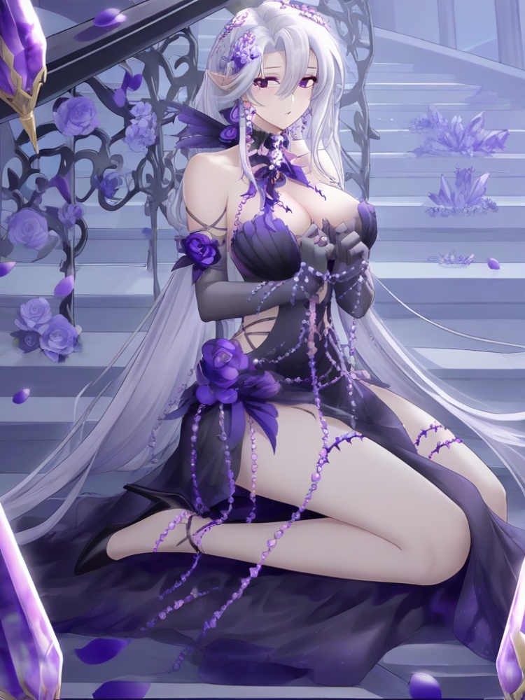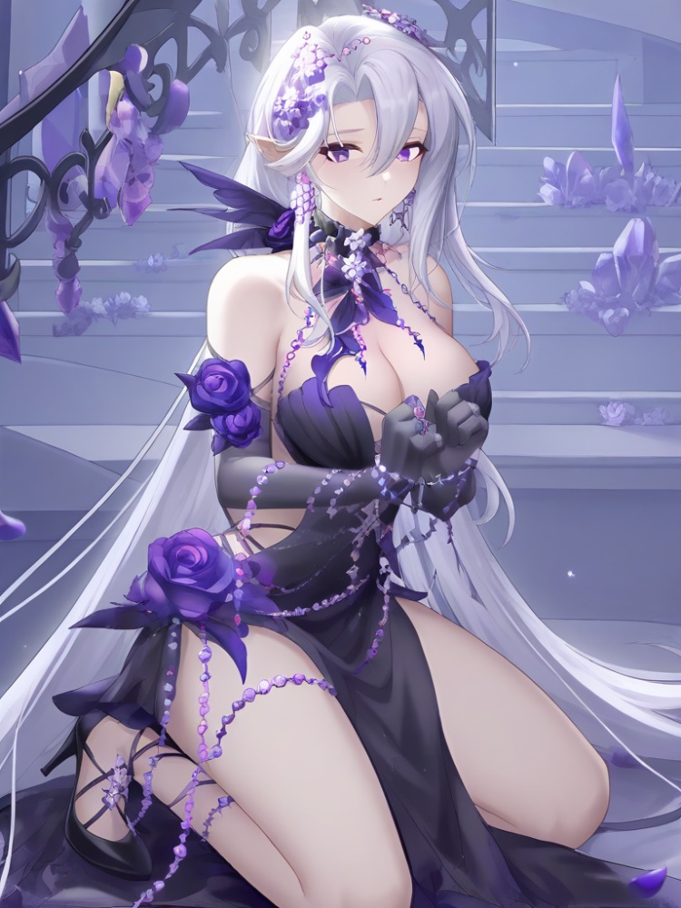 yinhe,solo,long hair,breasts,bangs,large breasts,hair ornament,cleavage,hair between eyes,bare shoulders,jewelry,very long hair,purple eyes,white hair,black gloves,elbow gloves,black footwear,black dress,high heels,petals,side slit,purple ribbon,purple rose,purple gemstone,Evening gown,halterneck dress,arm flower,beads,neck ornament,purple gemstone ring,waist flower,choker,1girl,pointy ears,earrings,thighlet,clothing cutout,