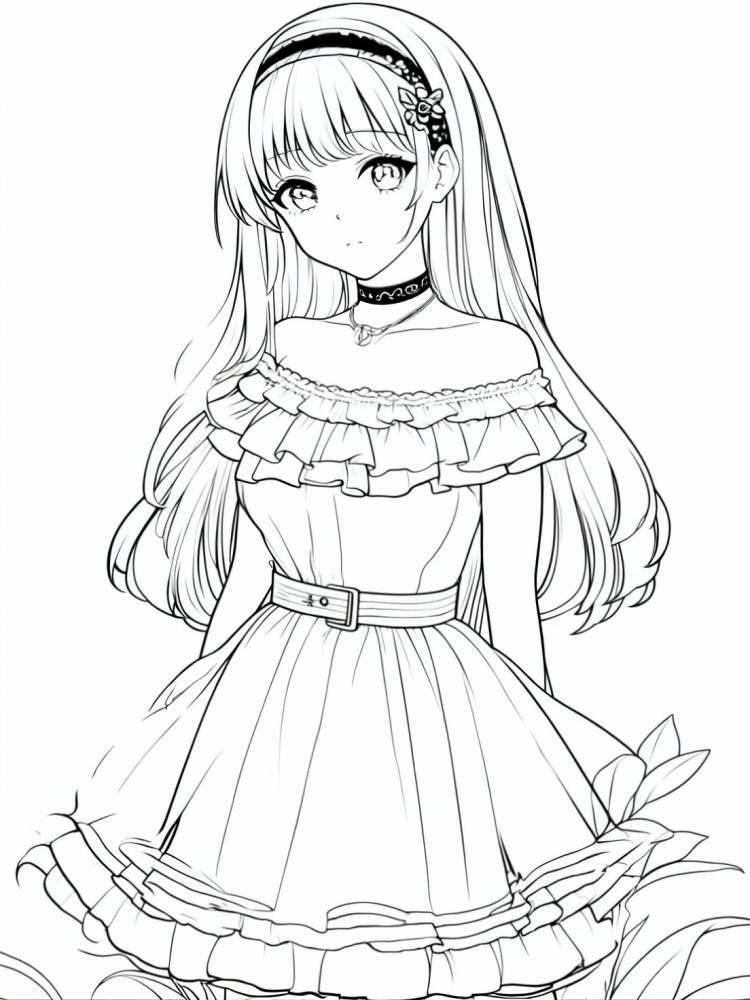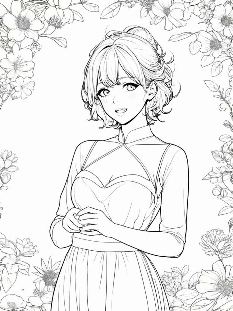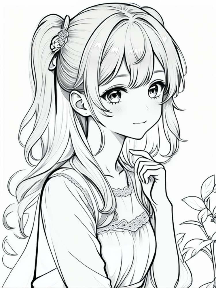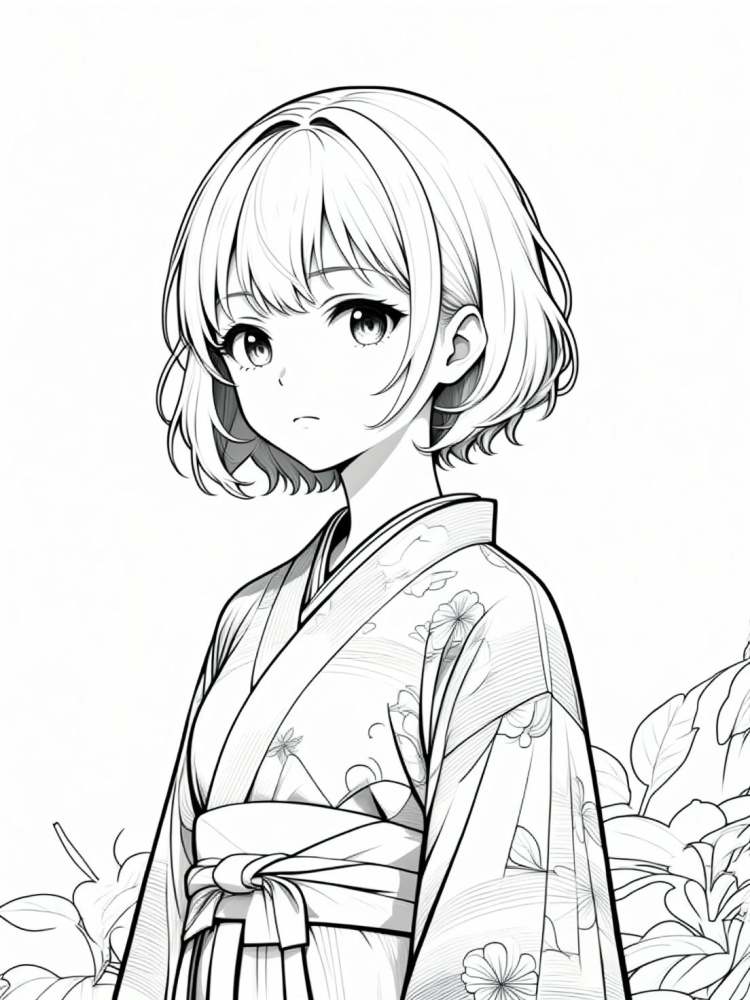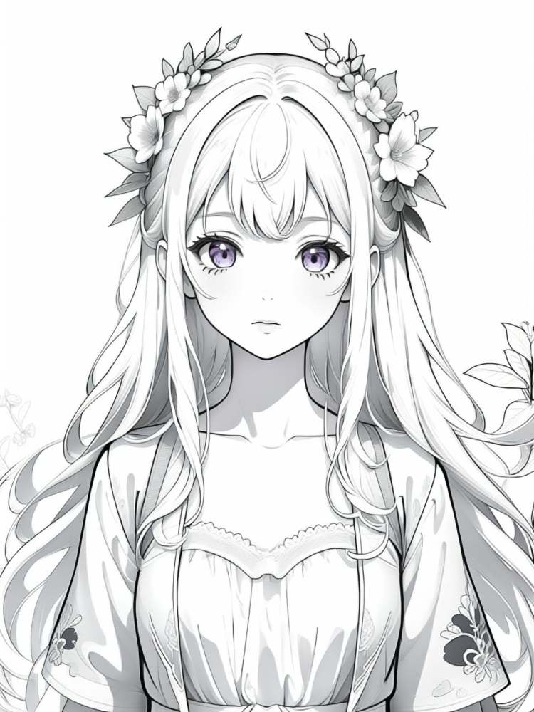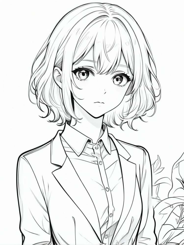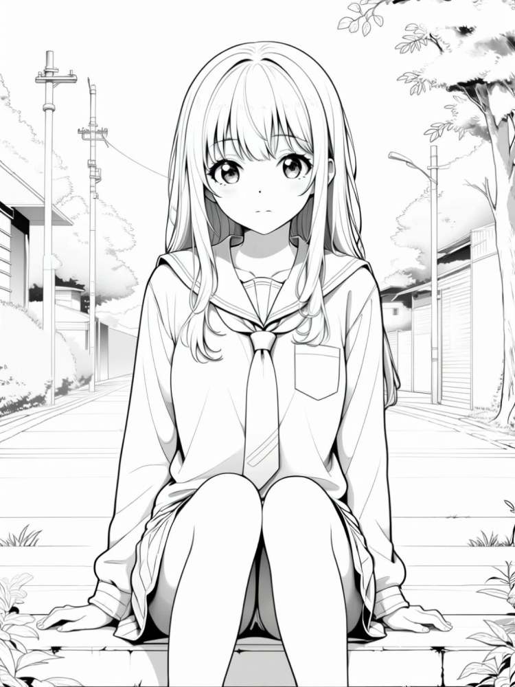 A black and white anime-style drawing of a young girl sitting on a set of stairs in a serene outdoor setting. the girl, who appears to be in her early twenties, has long, straight, blonde hair with bangs and large, expressive brown eyes that are looking directly at the viewer. she is wearing a school uniform with a necktie and a long-sleeved shirt with a pocket, and her legs are crossed in front of her. her expression is neutral, and she is sitting with her hands resting on the stairs. the background features a quiet, suburban street with trees and buildings on either side, and a few utility poles in the distance. the overall style is reminiscent of japanese manga and anime art, with a focus on soft shading and detailed lines. flower, simple background, white background, flower, leaf, plant, line drawing, plant outline