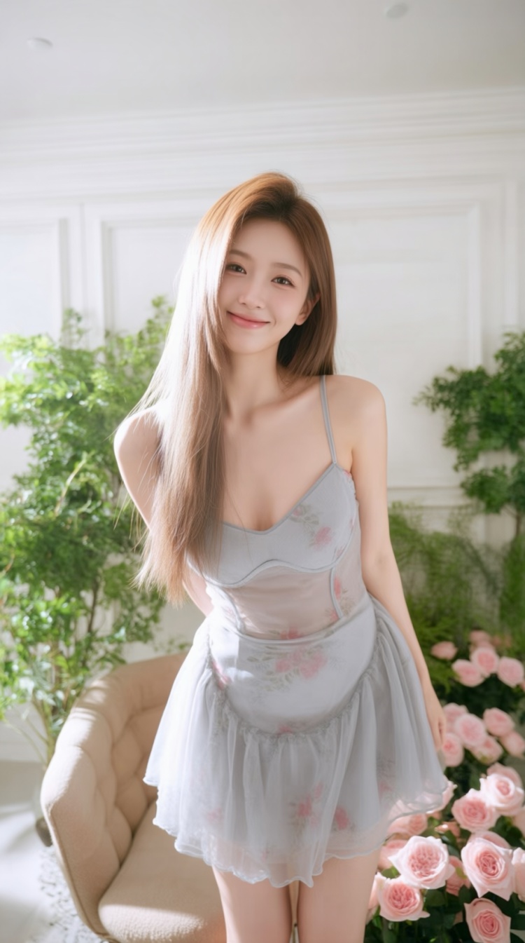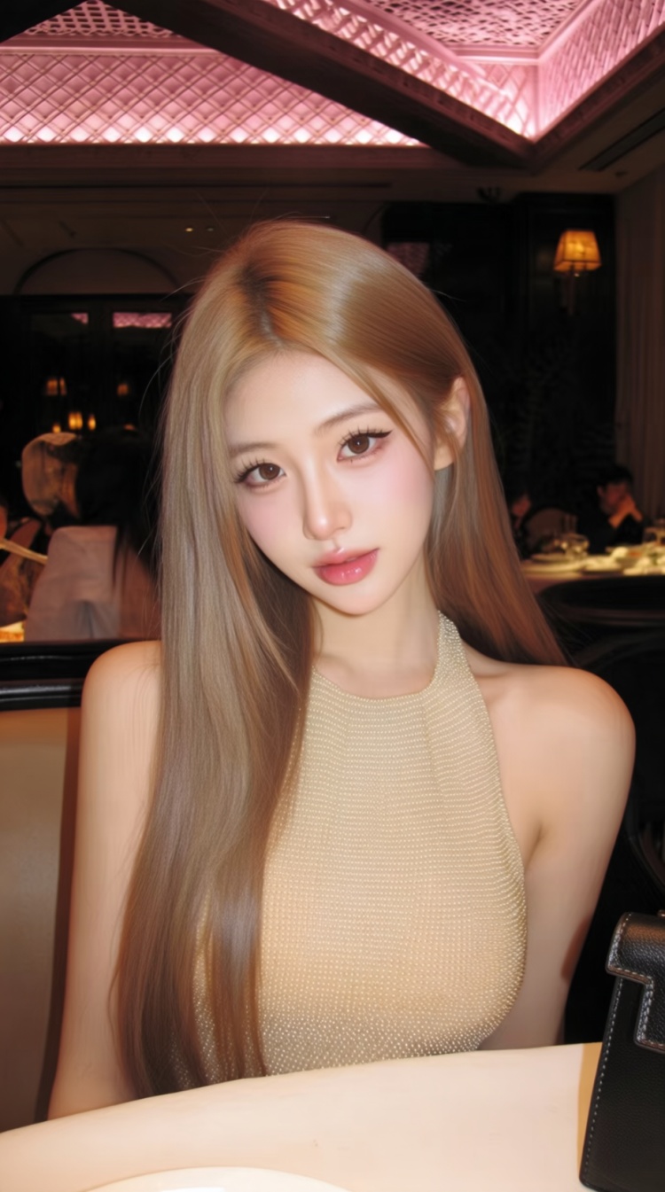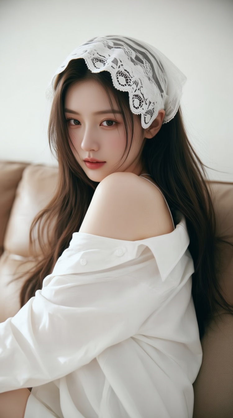 photograph of an asian woman with fair skin and black hair in a low bun, seated in a car, she has a slender build with small to medium-sized breasts, and is wearing a black lace top with floral patterns, revealing a hint of cleavage, her makeup is subtle, with pinkish-red lipstick and light eye makeup, the car interior is gray and black, with a visible headrest and window in the background, the lighting is natural, coming from the car window, creating a soft, even light on her face, the overall mood is calm and slightly seductive