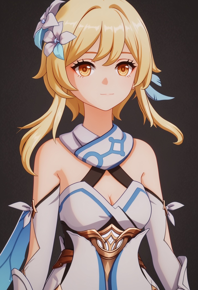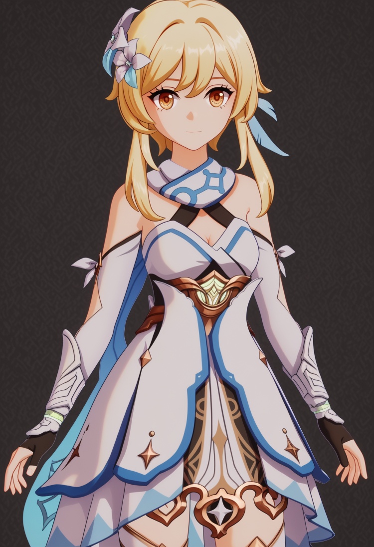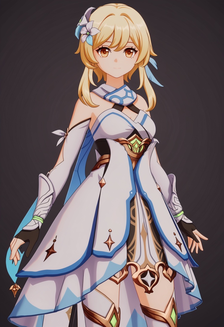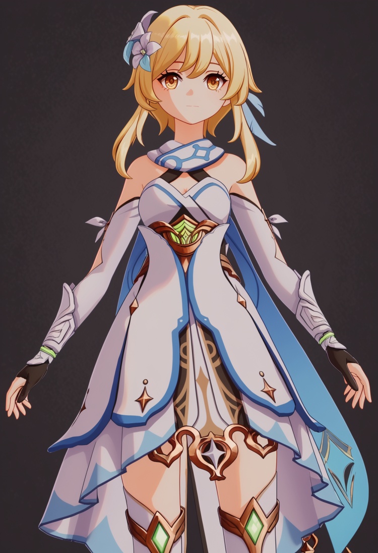 <lora:YQ_pony_ying_V4:0.8>,q1528437228,1girl,solo,lumine (genshin impact),blonde hair,hair ornament,dress,hair flower,white dress,short hair with long locks,detached sleeves,yellow eyes,scarf,sidelocks,feather hair ornament,gloves,white thighhighs,boots,