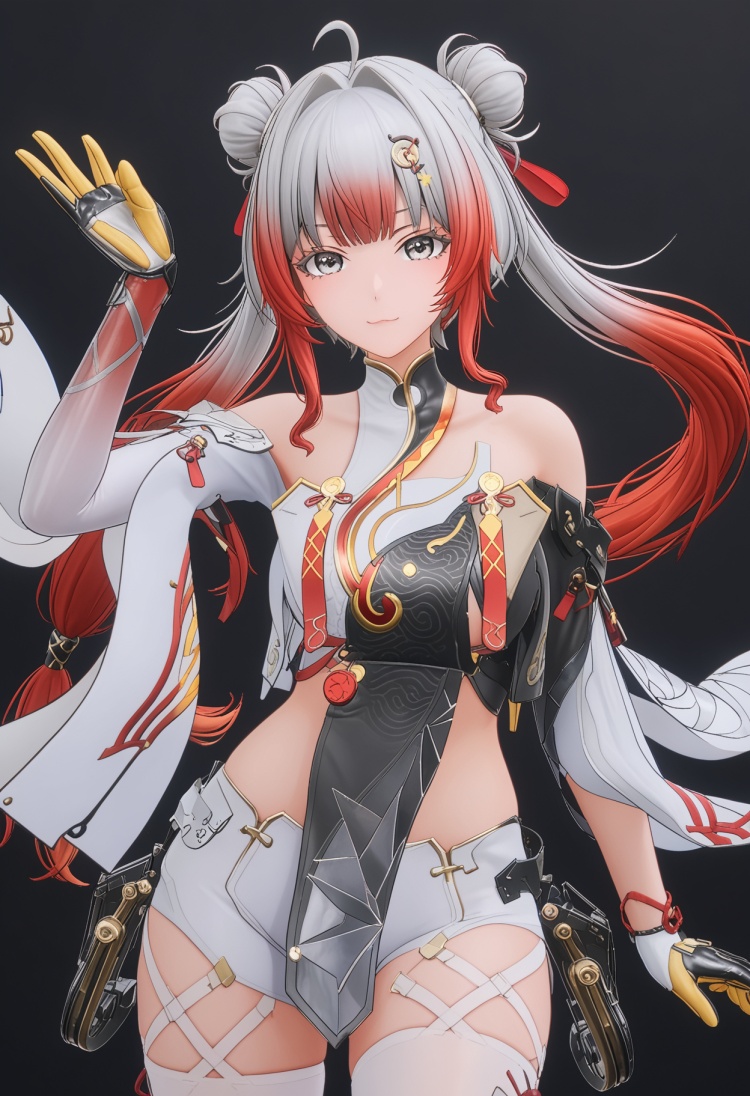 <lora:YQ_pony_bubu_V4:0.8>,q1528437228,1girl,solo,red hair,multicolored hair,grey hair,long hair,hair ornament,gradient hair,hair bun,double bun,chinese clothes,twintails,grey eyes,dress,detached sleeves,gloves,hair intakes,thighhighs,white pantyhose,white thighhighs,shorts,high heels,two-tone hair,pelvic curtain,thighs,white shorts,