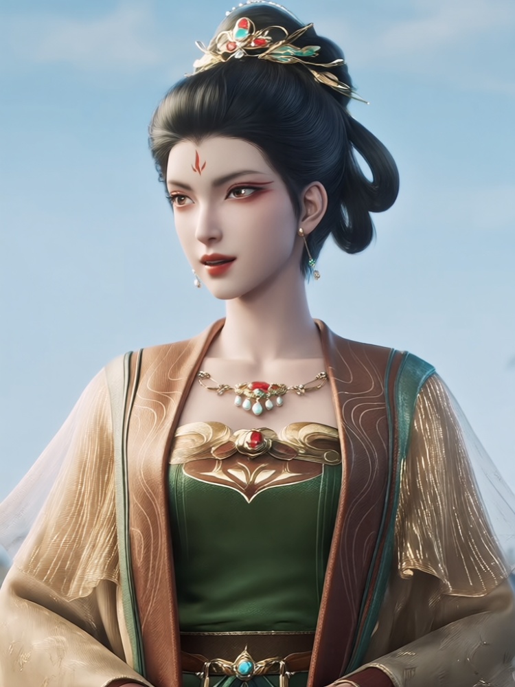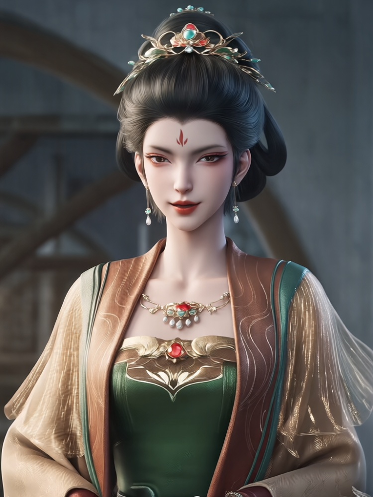 这是一幅极其精细的数字艺术作品,描绘的是一位东亚女性的形象。她皮肤白皙,头发乌黑且样式复杂,还戴着一顶镶嵌珠宝的头饰。她的嘴唇涂成红色,额头上有淡淡的红色妆容。她身着一件绿色的贴身连衣裙,带有金色和棕色的装饰元素,还披着一条透明的、镶有金色边饰的披肩。她佩戴着一条红色宝石项链和一对相配的耳环。