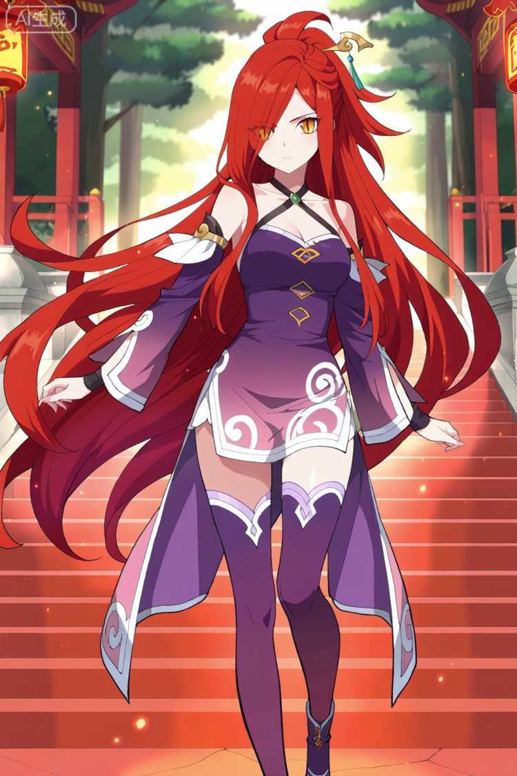 彩灵,masterpiece,best quality,official art,extremely detailed CG unity 8k wallpaper,1girl, solo, slit pupils, yellow eyes, orange eyes, very long hair, red hair, ponytail, hair over one eye, eyes visible through hair,purple dress, detached sleeves, purple thighhighs, toeless legwear, bare shoulders, cleavage, criss-cross halter, collarbone,chinese clothes, dress, detached sleeves, bare shoulders, hair ornament, purple thighhighs, purple boots