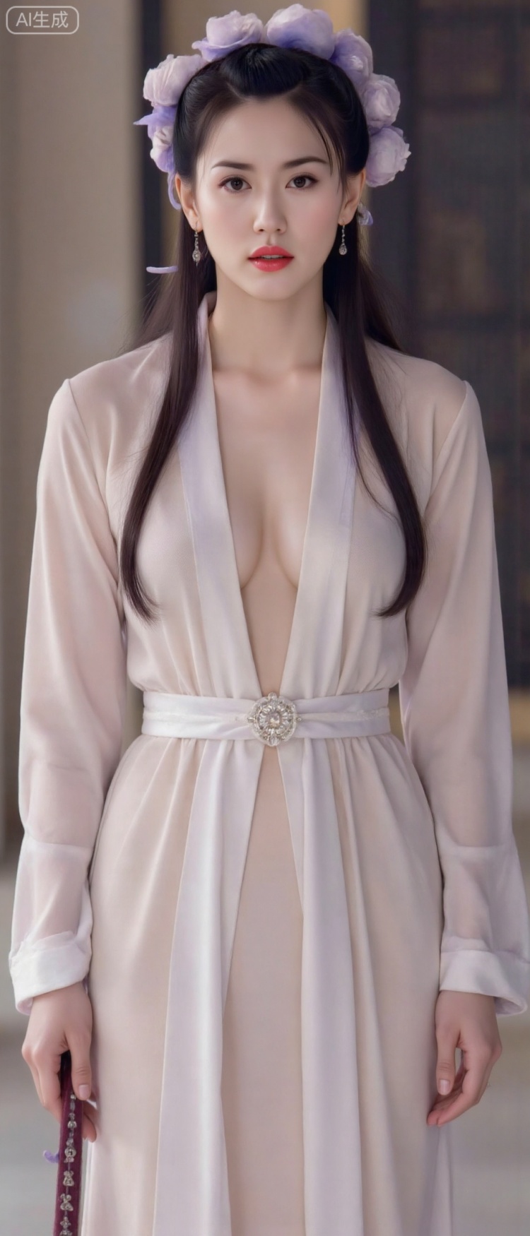Create an ultra-detailed illustration in the style of masutepiece, featuring a character with perfect 8K wallpaper quality and best quality aesthetics. The character has beautiful, naturally water-ringed skin with a youthful glow, and flawless, smooth skin texture. She possesses an excellent body proportion with a full and well-defined chest, big and rounded breasts with a subtle cleavage. The composition is dynamic and natural, highlighting her full body with a navel-baring pose and crossed legs.