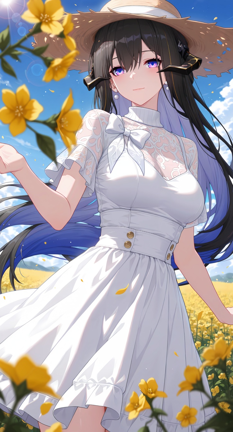 训练标签:dalihua_honkai, 1girl, white headwear, large_hat, breasts, solo, full body, cleavage, white dress, large breasts, long hair, standing, white footwear, looking at viewer, white background, white_gloves, closed mouth, puffy sleeves, hat flower, black elbow_gloves, high heels, cleavage cutout, side slit, mole, big breasts, front view, black_flower, pearl_necklace, black neck_ruff。 稍微有些过拟合到游戏服装上,换其他衣服会带一些游戏服装的花纹和配件,可以把数据集的服装标签放到负面提示词并提高权重。