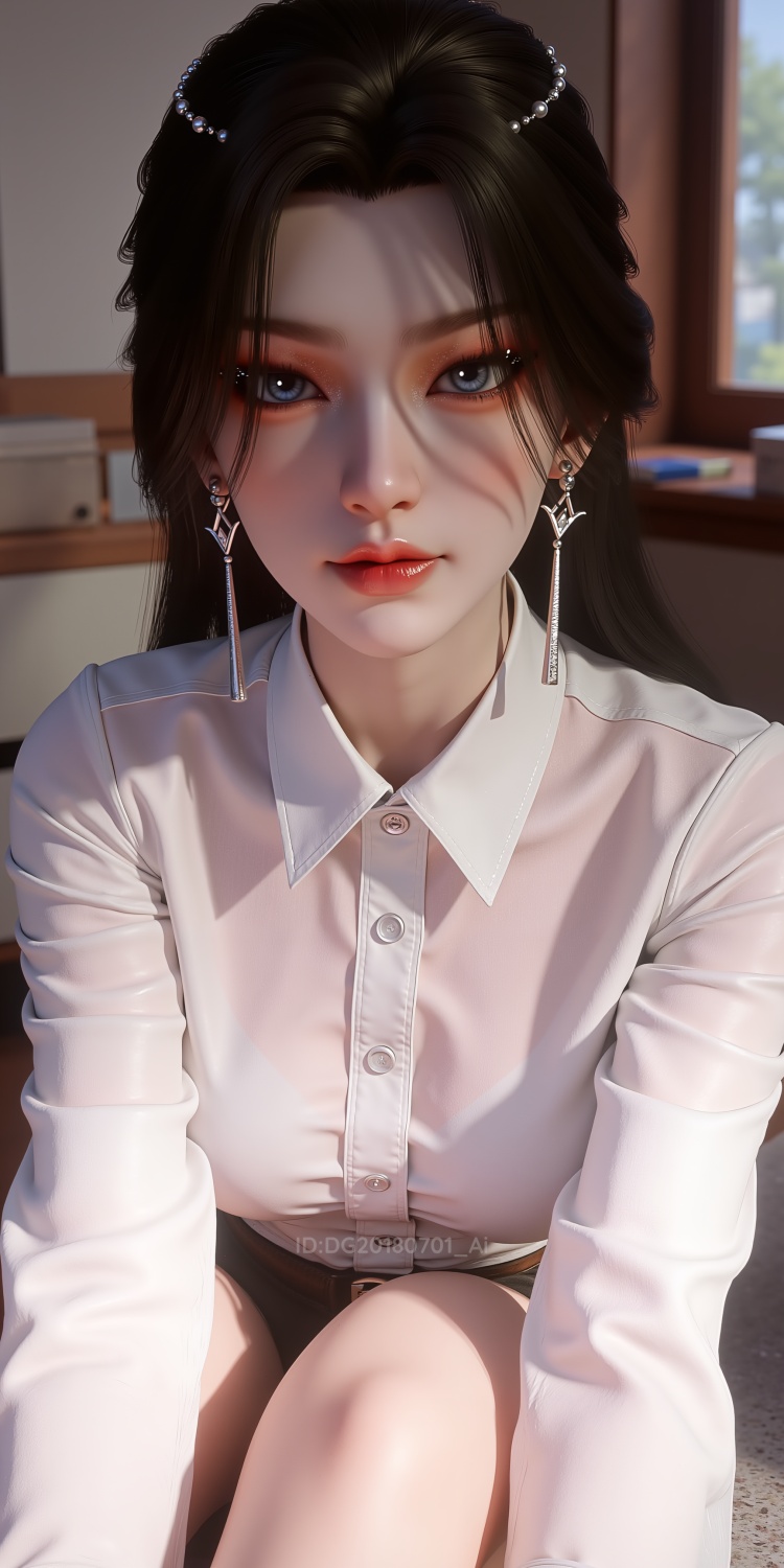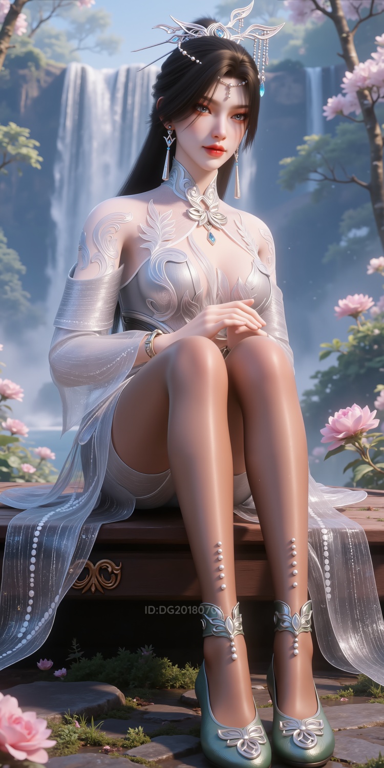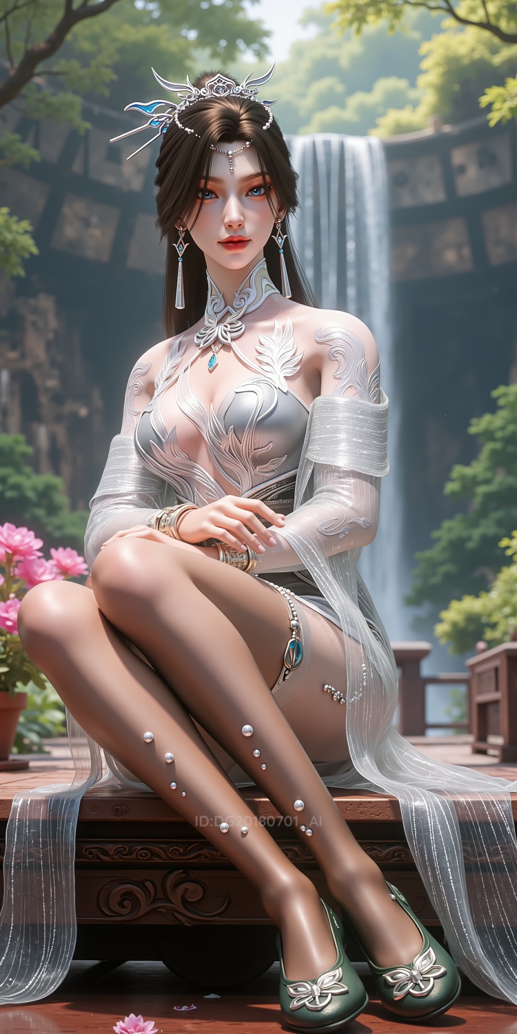 Ultra HD, masterpiece, more details, vivid colors, standard colors, a girl, solo, long black hair,silver white headgear,Makeup, eyeshadow, silver glitter, lipstick, Silver earrings, necklace,Her lips are full and slightly parted, showing a subtle, enigmatic smile. white dress, A gray-black undergarment, dark green satin ballet flats with delicate floral embellishments on the toes. The shoes are worn over sheer flesh-colored stockings adorned with small, white pearl-like dots running vertically up the legs.The white and red skin is very beautiful, like the skin of a woman in heat.Her legs are adorned with sheer, Brown stockings are shiny and reflective.NangongXianer,