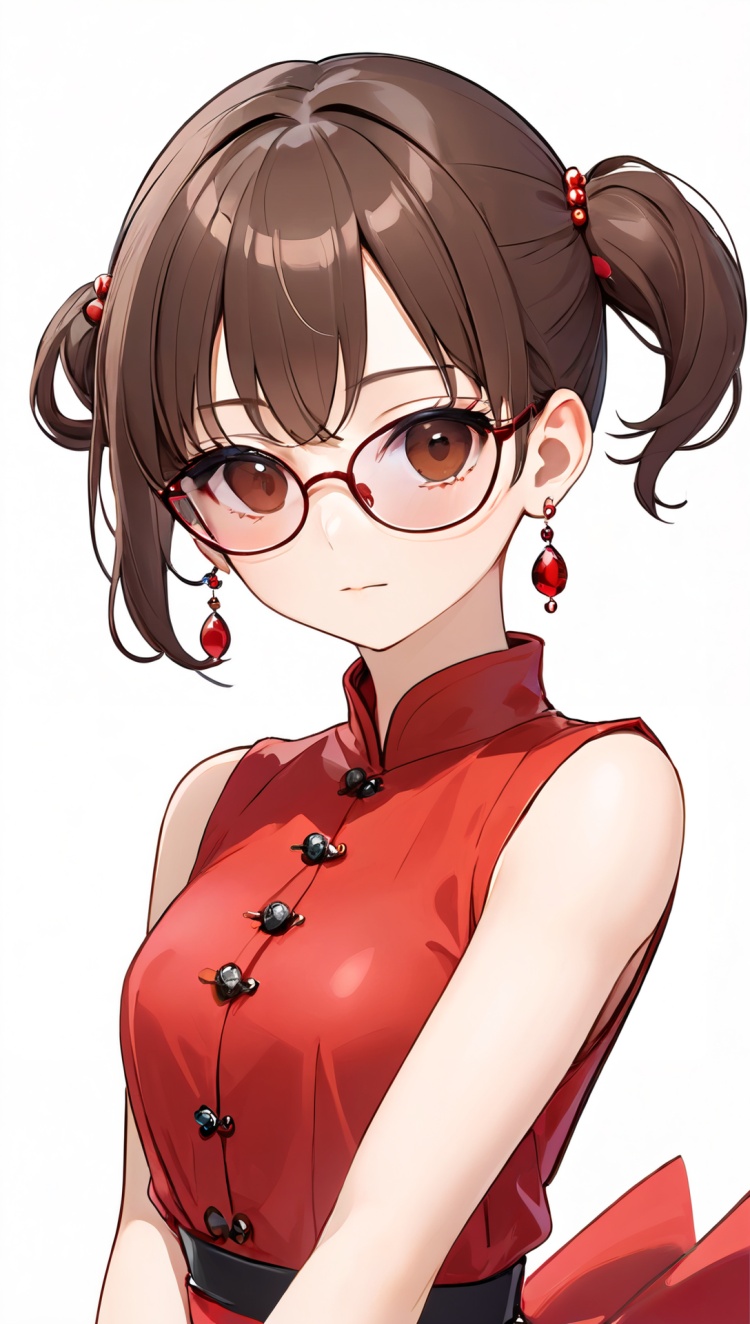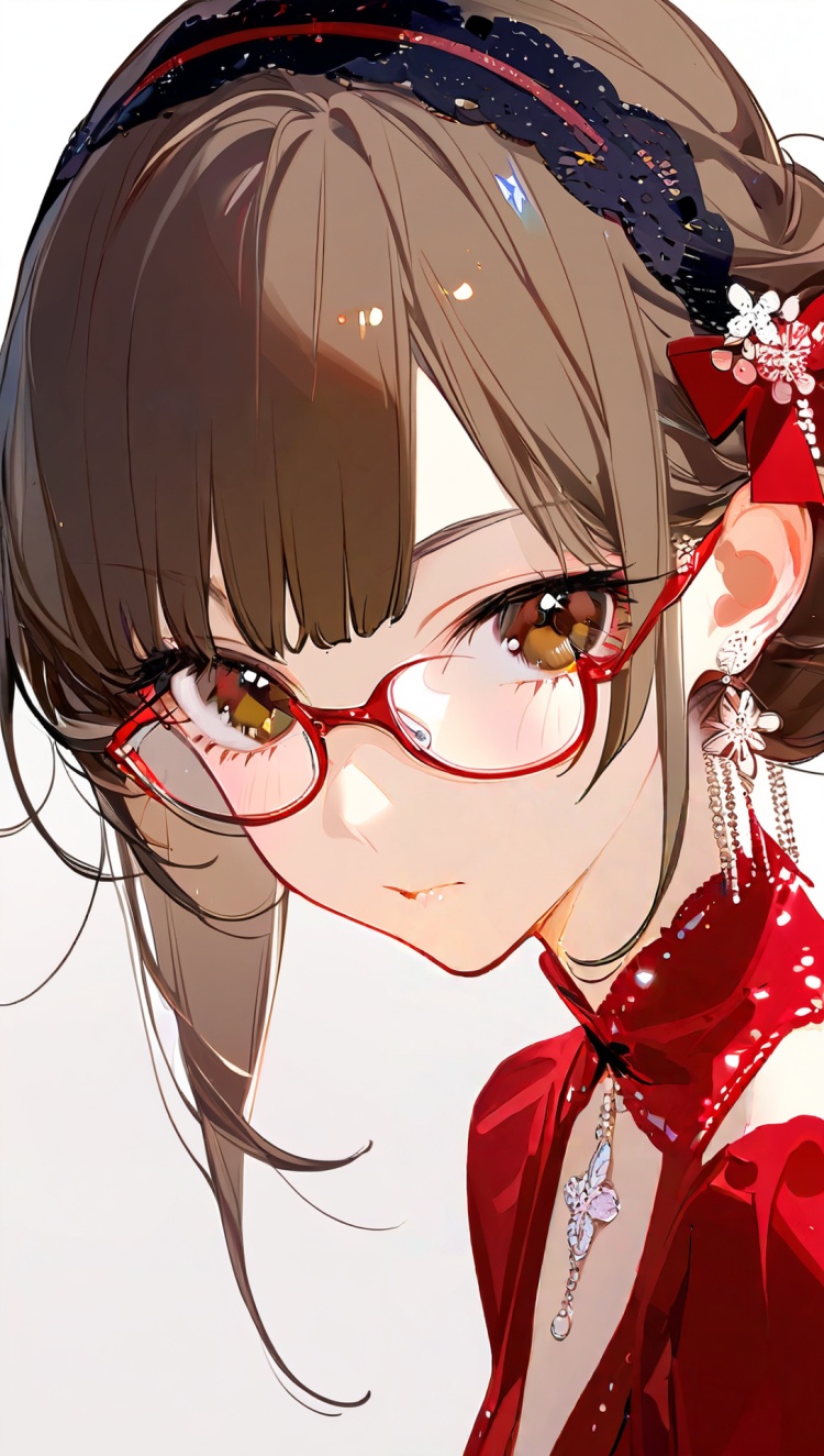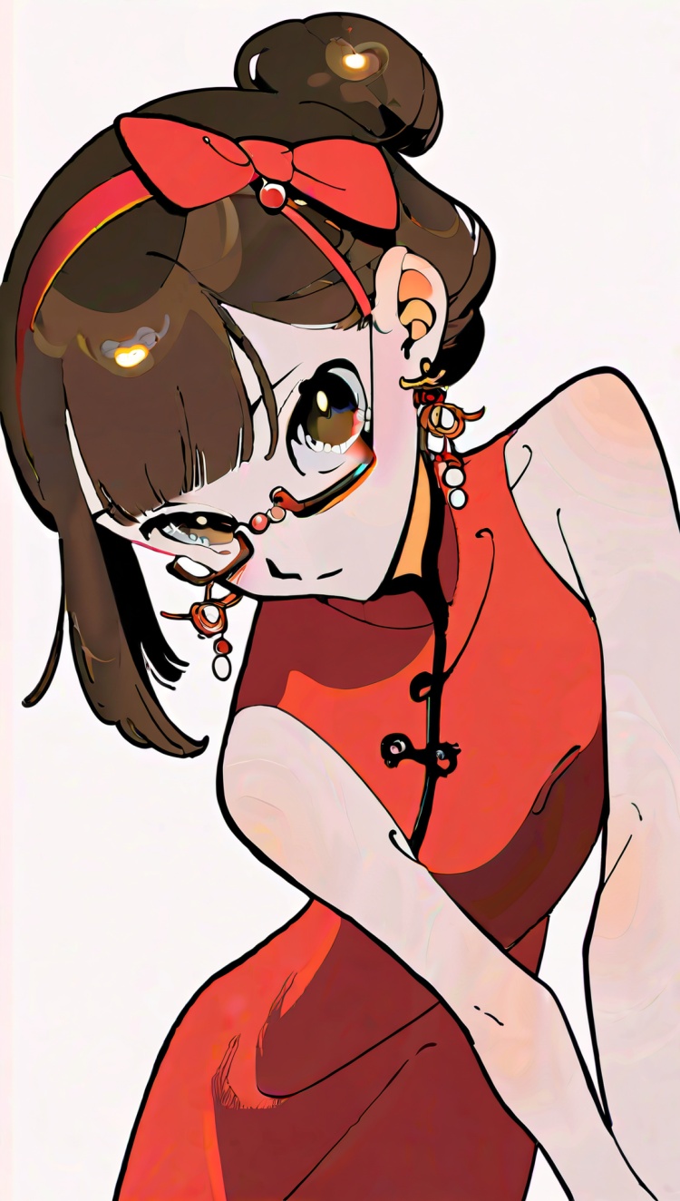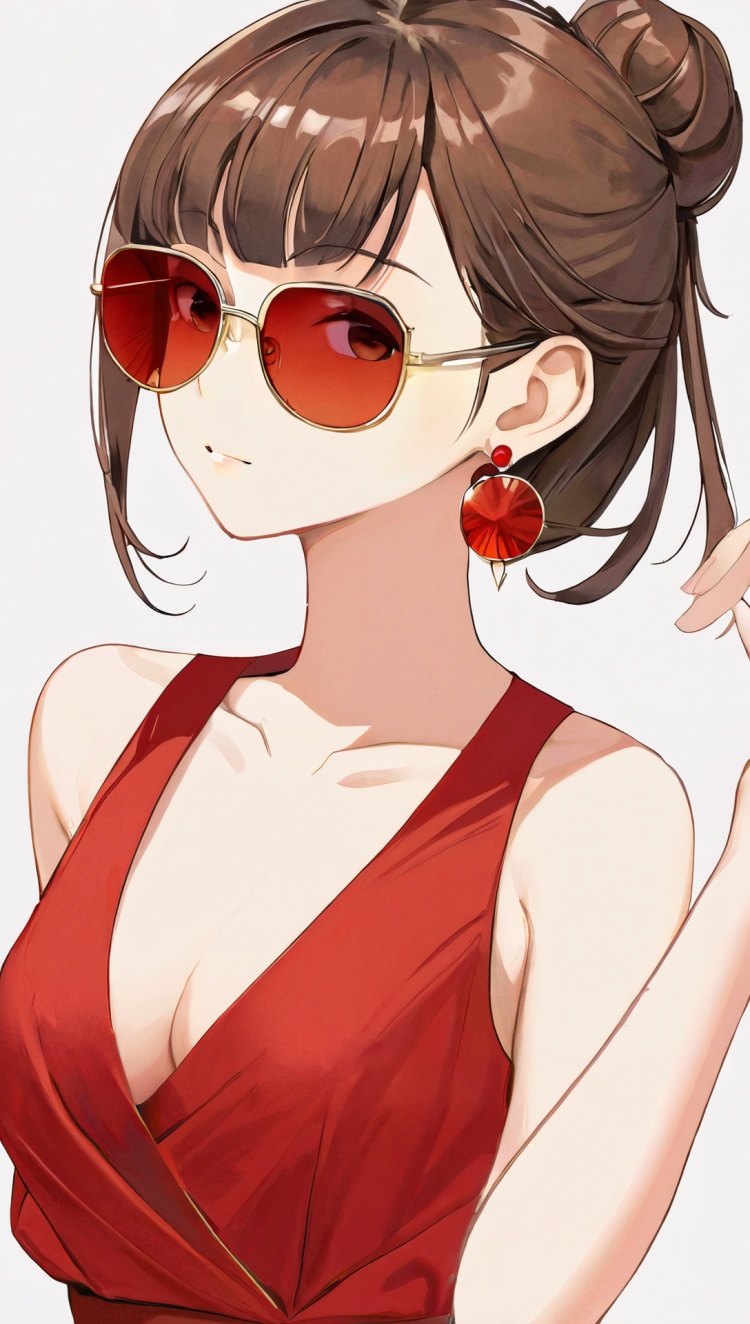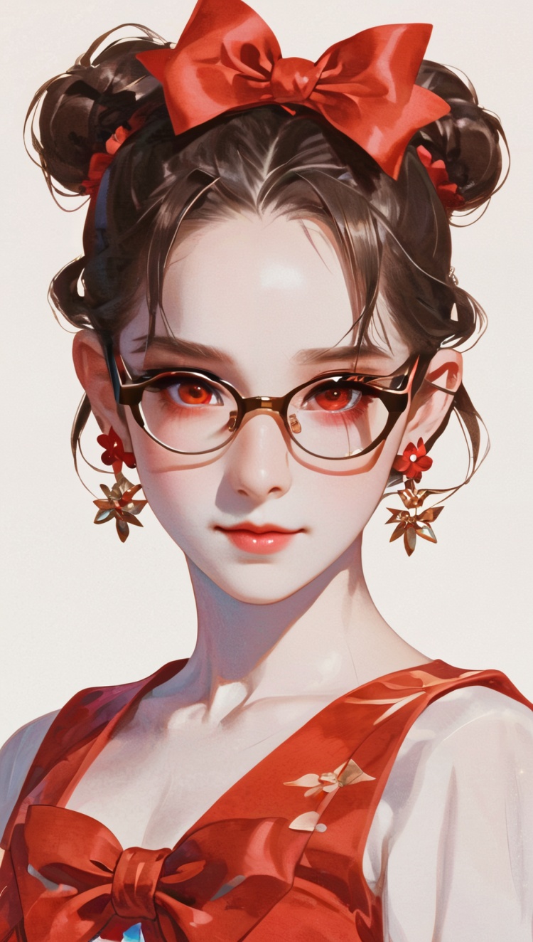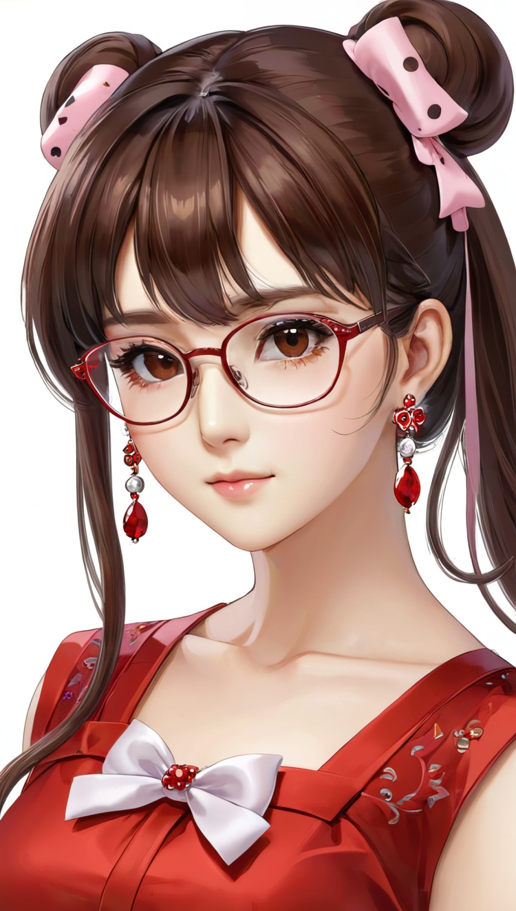 正面提示词:bingzhenkeletaozhuang, 1girl, solo, brown hair, earrings, jewelry, white background, brown eyes, glasses, hair bow, sleeveless, hairband, looking at viewer, hair bun, single hair bun, bangs, red dress, red bow
