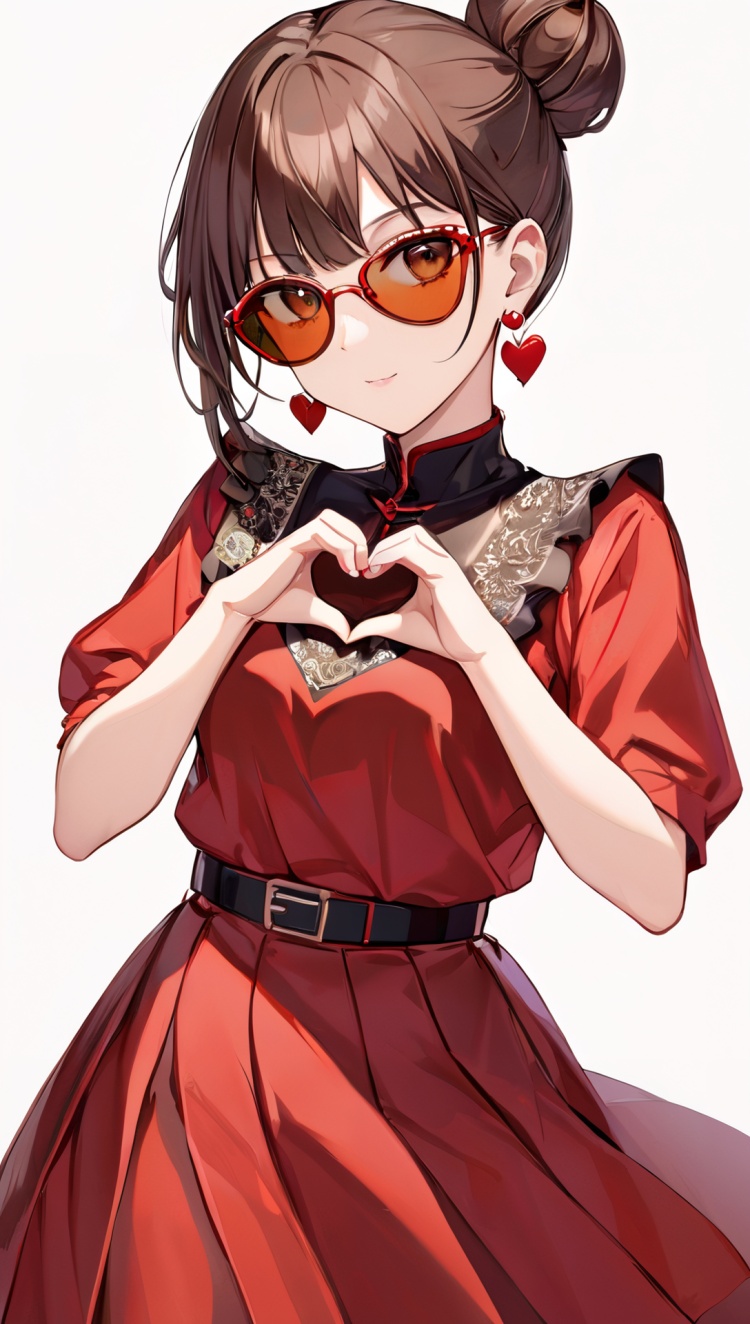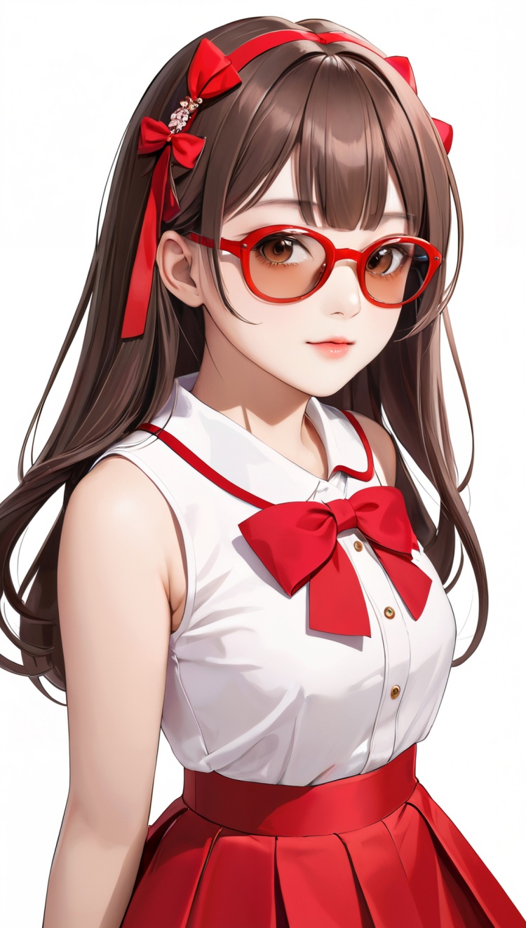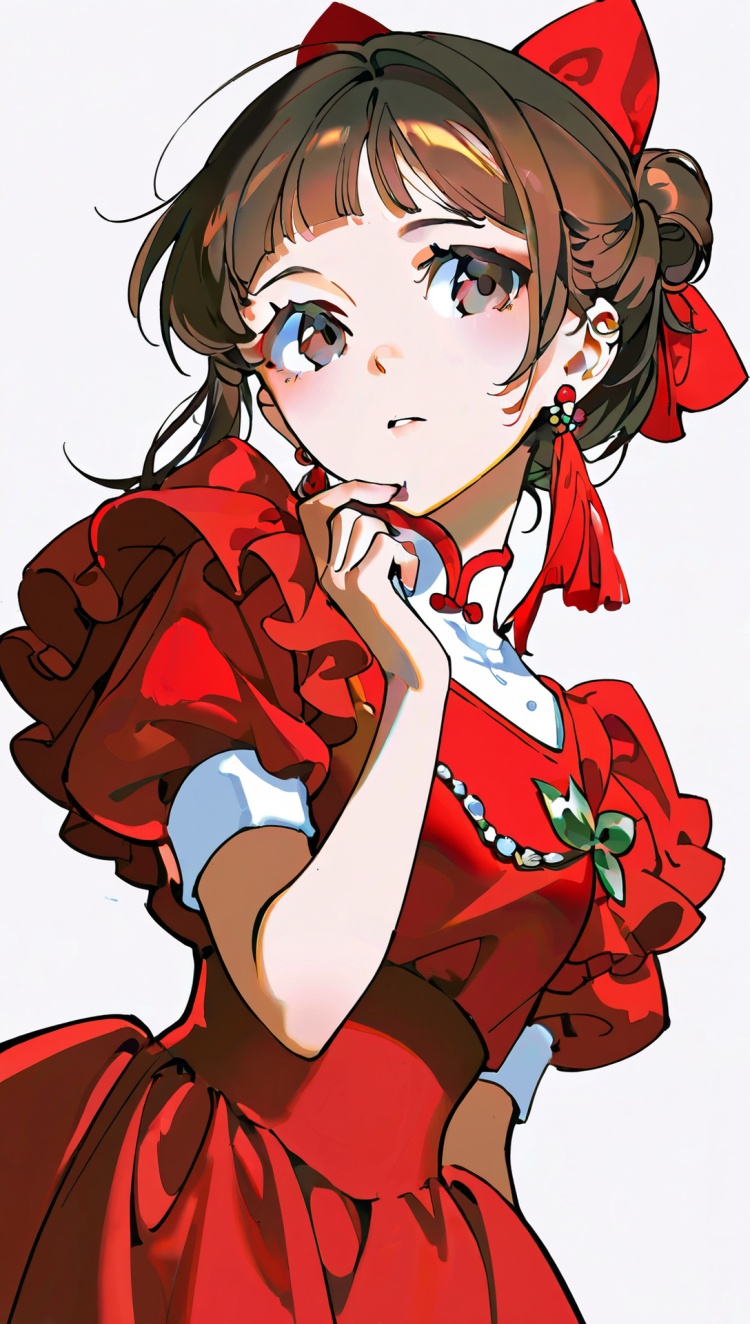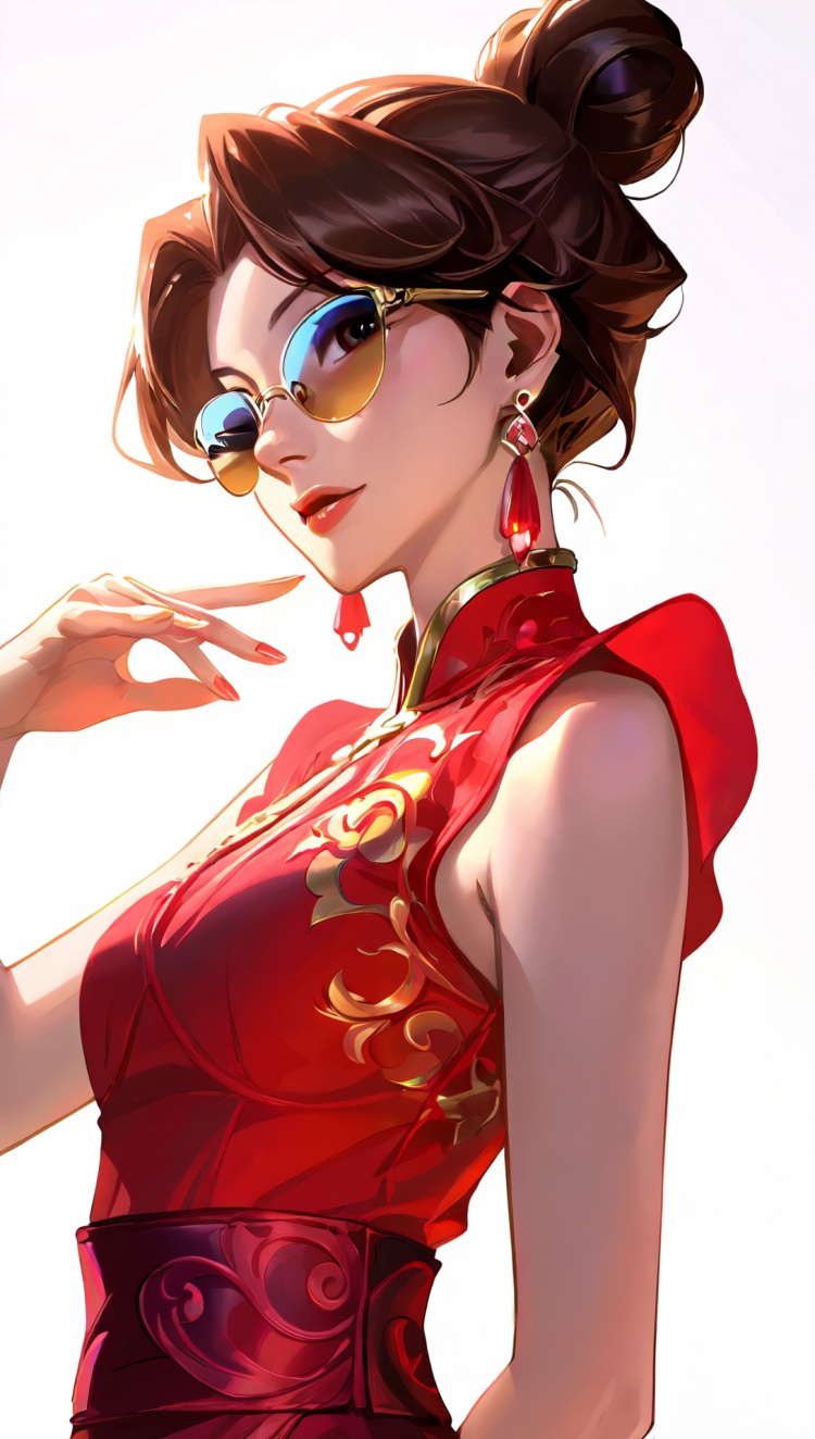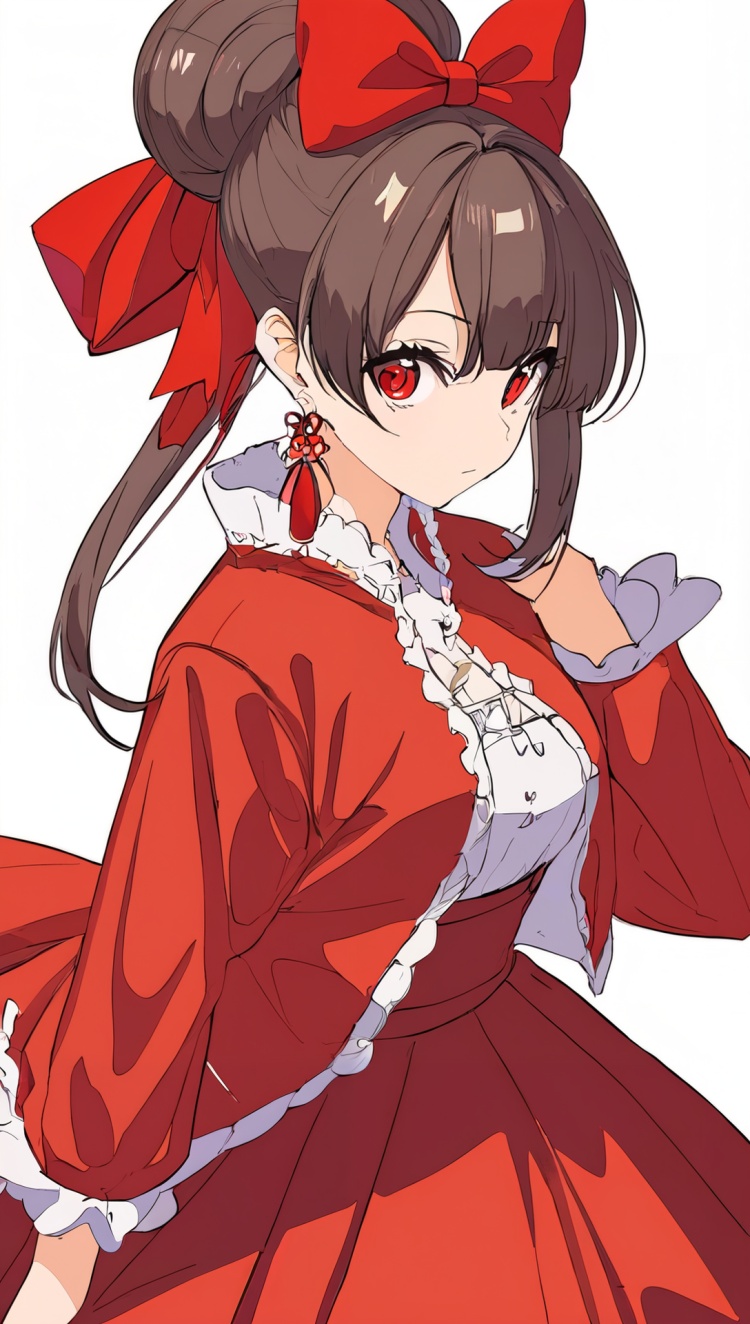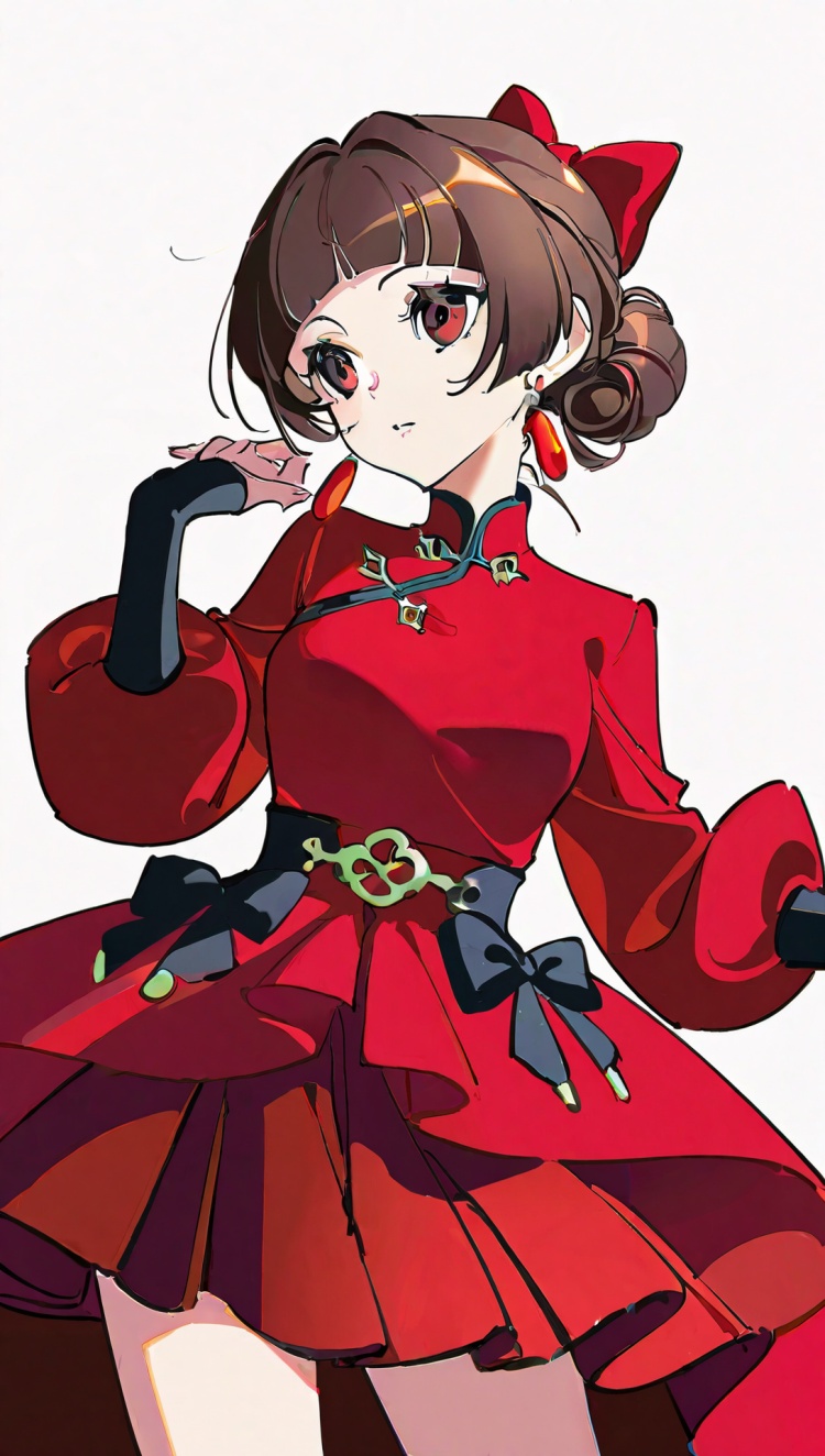 正面提示词:bingzhenkeletaozhuang, 1girl, solo, brown hair, earrings, jewelry, white background, brown eyes, glasses, hair bow, sleeveless, hairband, looking at viewer, hair bun, single hair bun, bangs, red dress, red bow