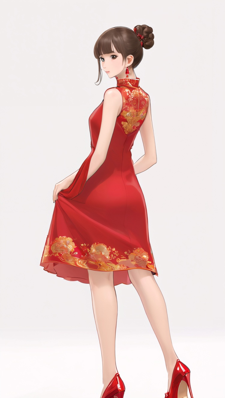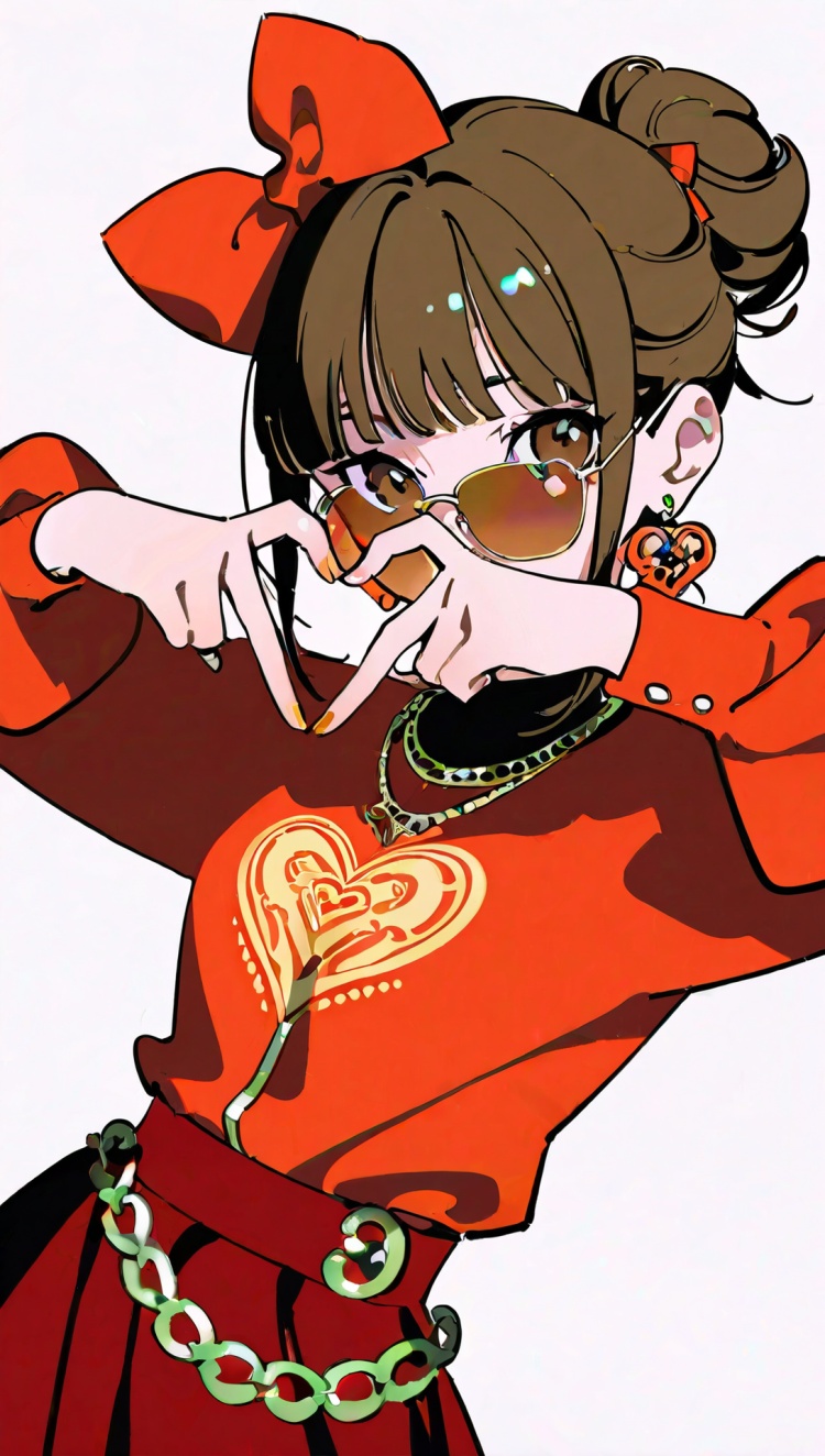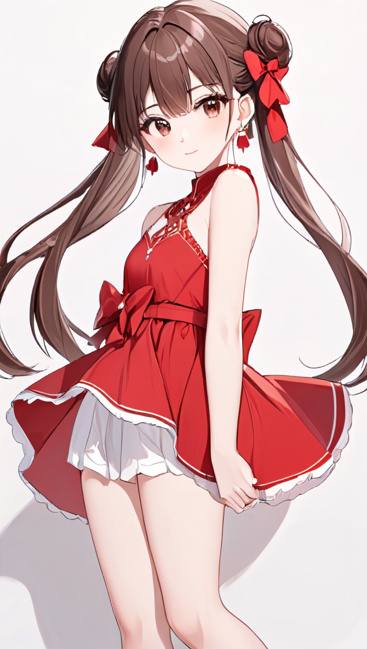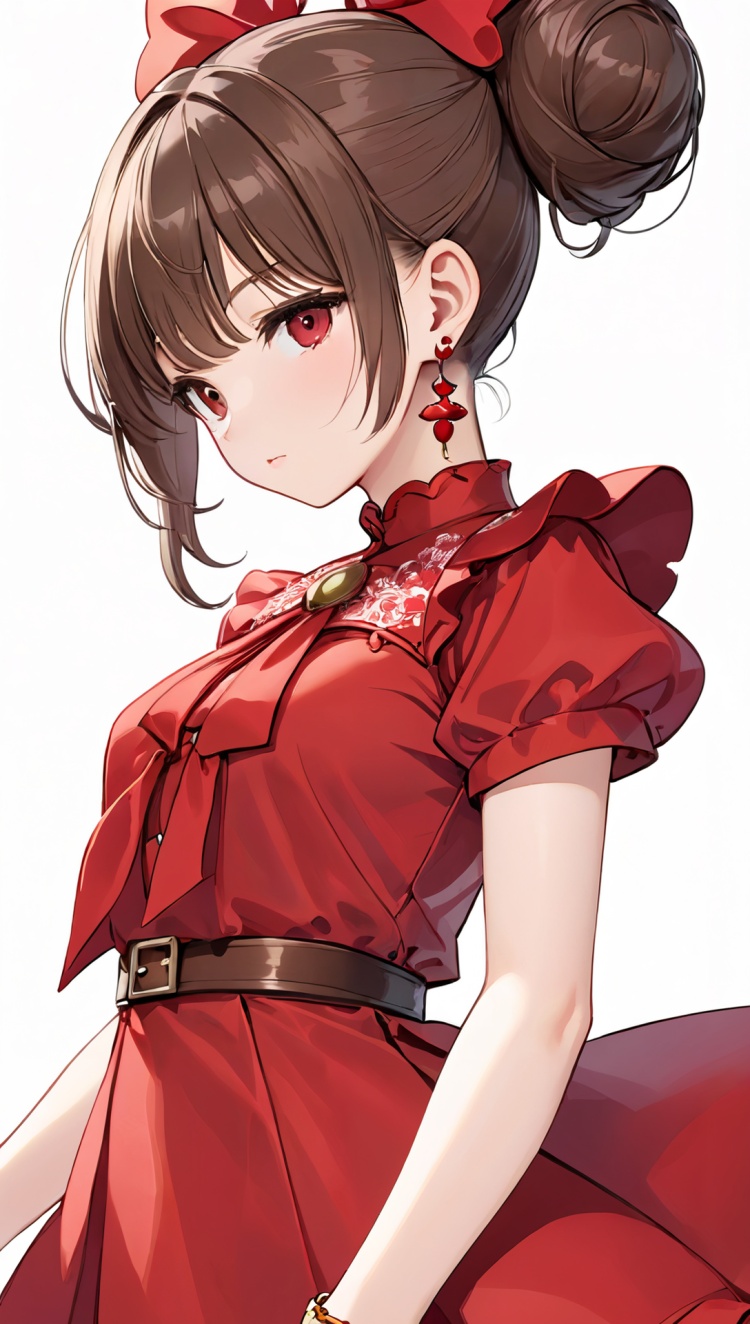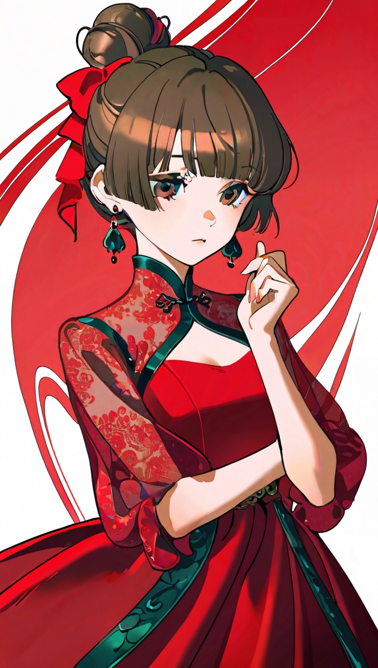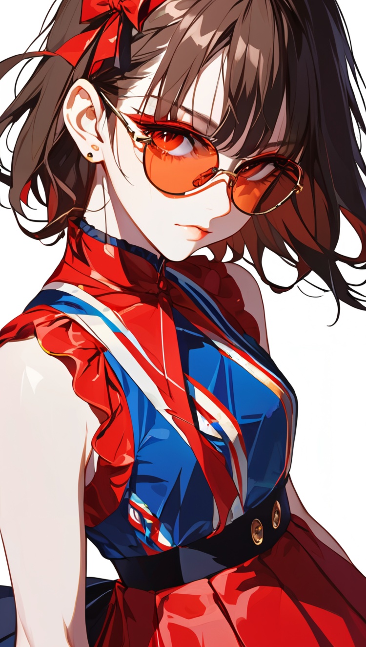 正面提示词:bingzhenkeletaozhuang, 1girl, solo, brown hair, earrings, jewelry, white background, brown eyes, glasses, hair bow, sleeveless, hairband, looking at viewer, hair bun, single hair bun, bangs, red dress, red bow