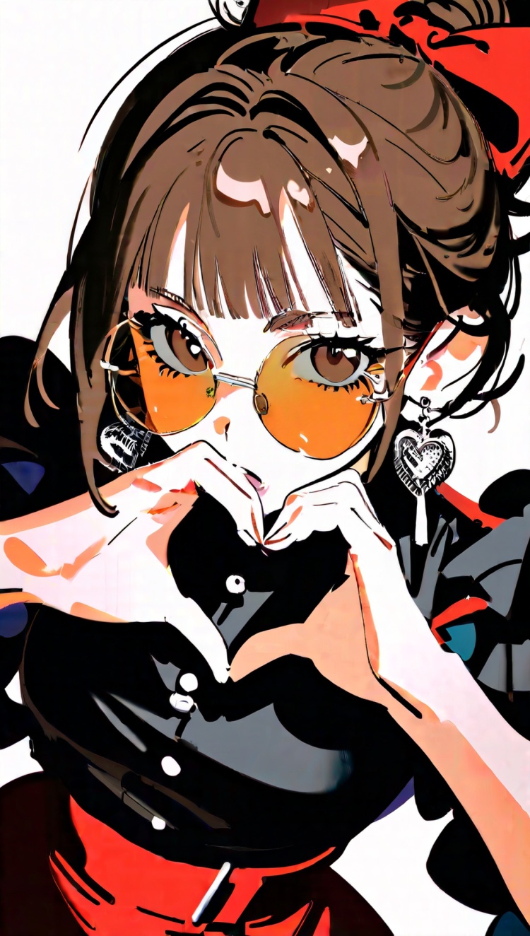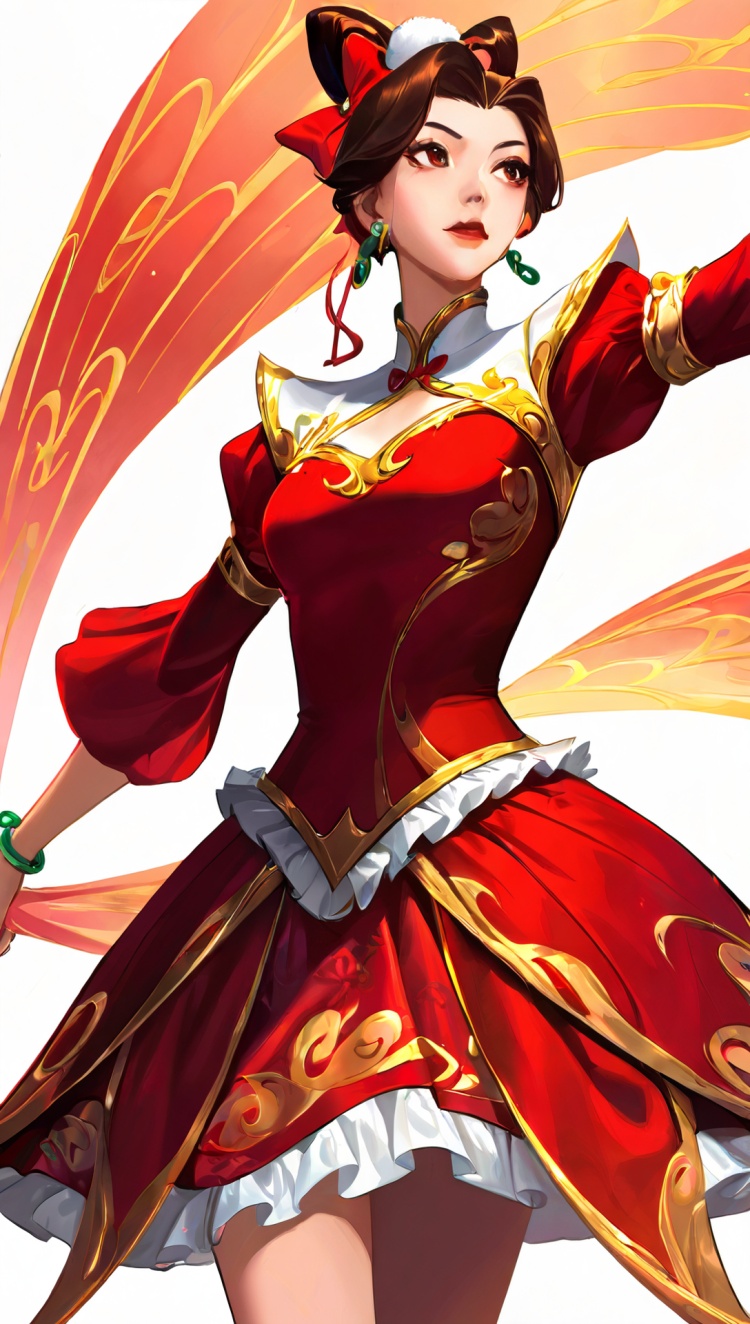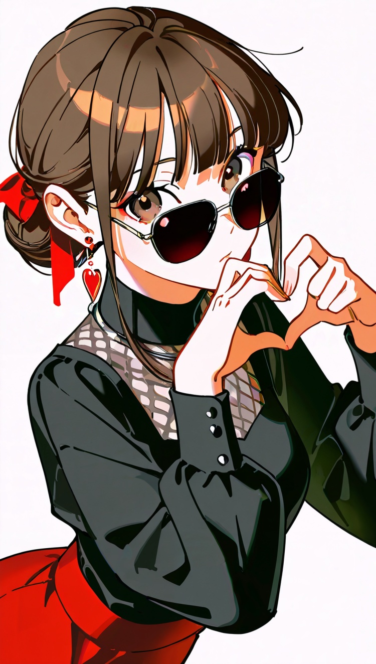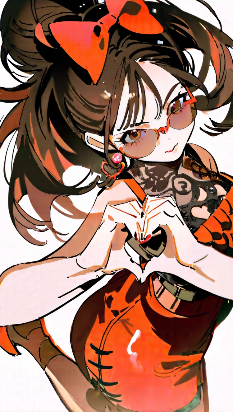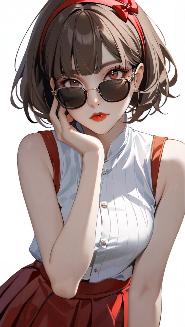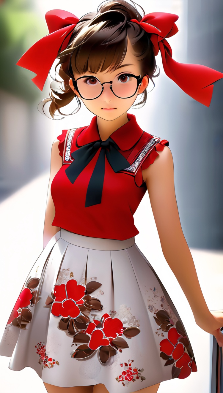 正面提示词:bingzhenkeletaozhuang, 1girl, solo, brown hair, earrings, jewelry, white background, brown eyes, glasses, hair bow, sleeveless, hairband, looking at viewer, hair bun, single hair bun, bangs, red dress, red bow