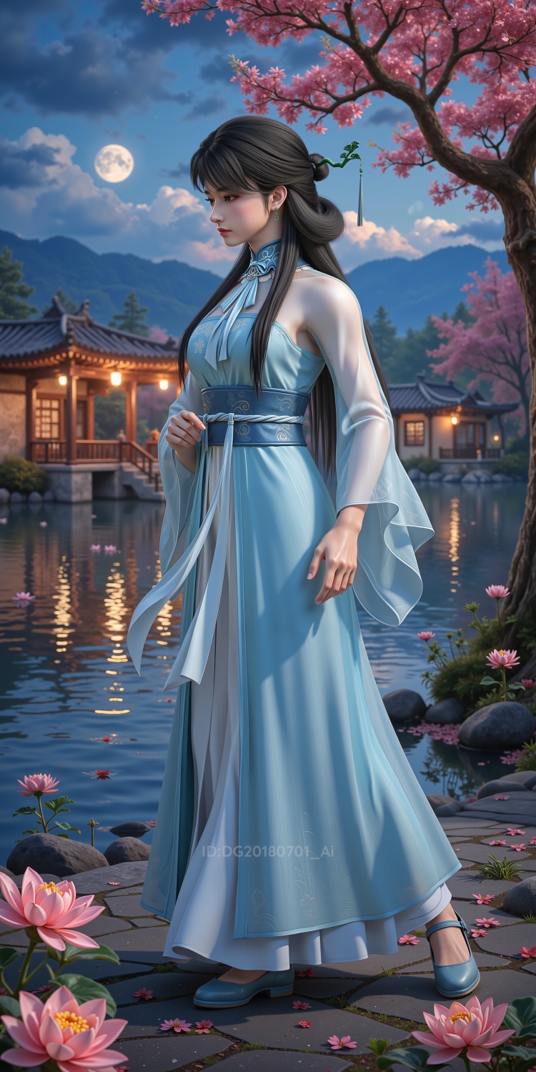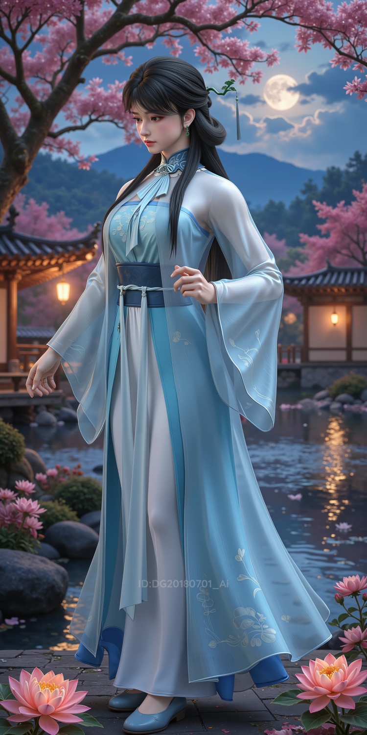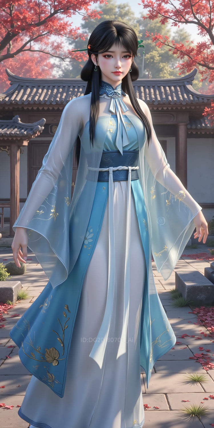 This is Zhongxiu, This is an East Asian woman with fair skin and large, expressive brown eyes. She has long, straight black hair styled with one green jade hairpins and has a small tassel. Her hair is parted in the middle and falls over her shoulders. She wears a flowing, translucent blue and white Hanfu with wide sleeves and a high collar, cinched at the waist with a black belt, intricate embroidery around the collar. She is wearing light blue traditional cloth shoes.Her makeup is subtle, with pinkish-red eyeshadow and light pink lipstick.