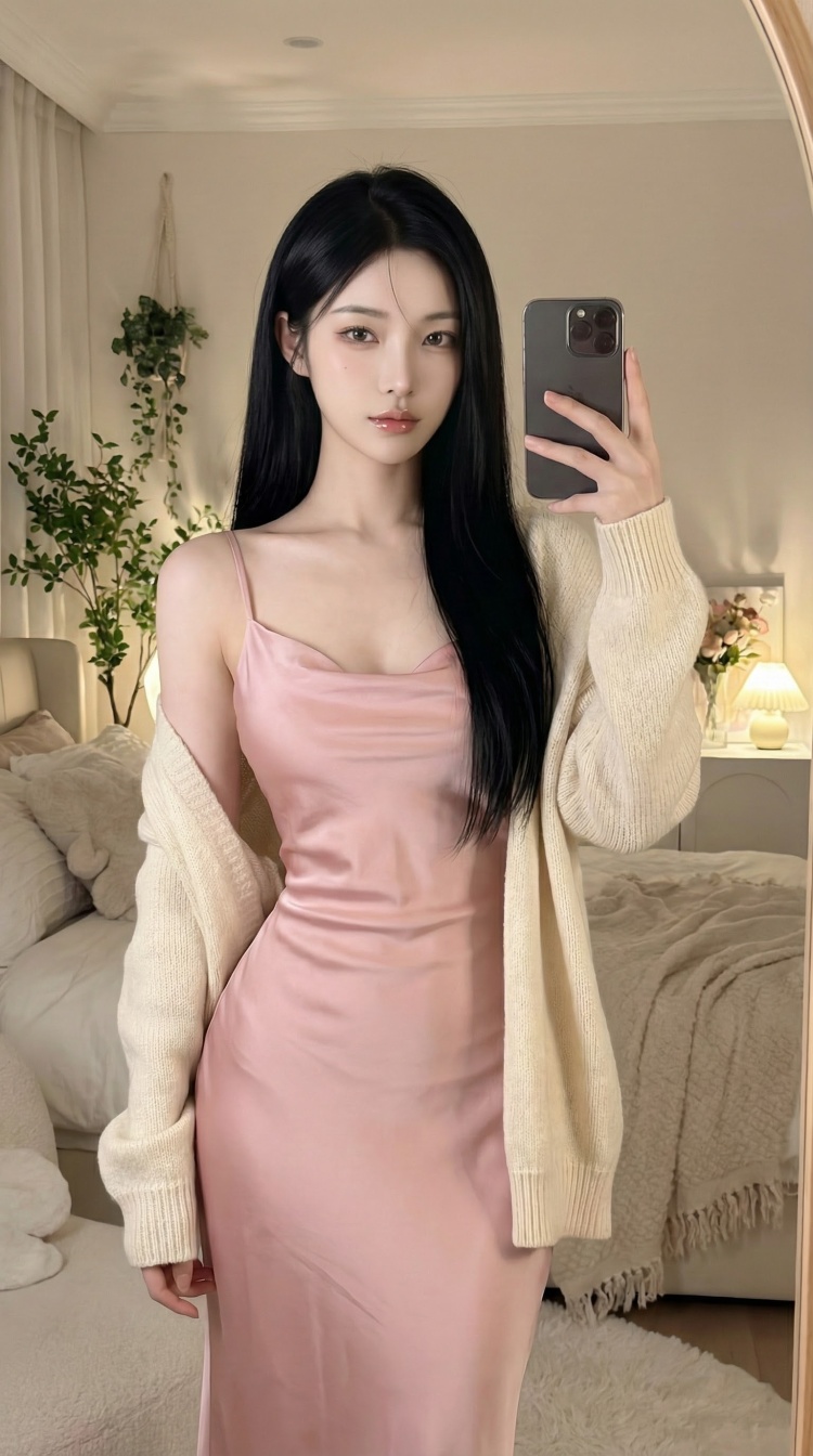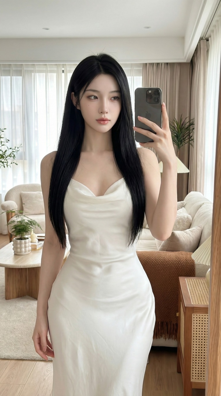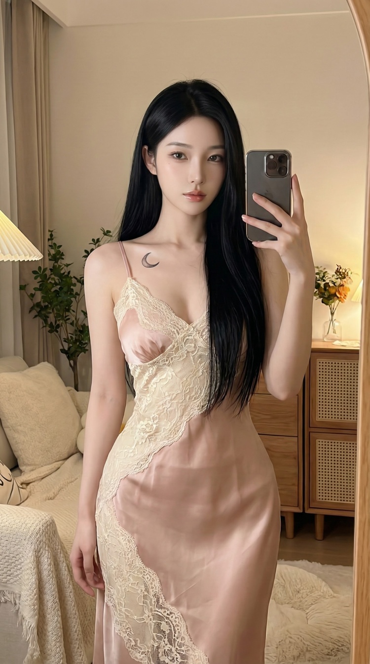 a photo-realistic shoot from a front camera angle about a young woman taking a selfie in a luxurious living room, wearing a pink off-the-shoulder dress, the image also shows a well-furnished living room with beige sofas and a large window with sheer curtains, on the middle of the image, a 20-year-old asian woman with long, wavy black hair, fair skin, and brown eyes appears to be taking the selfie, she is standing with her upper body facing the viewer, looking directly at them with a neutral expression, her hair is styled in loose waves and falls down her back, framing her face, she has a small crescent tattoo on her left shoulder and a slight smile on her lips, her dress is a light pink color with a slight sheen, and she is holding a black iphone in her right hand, taking the photo,
