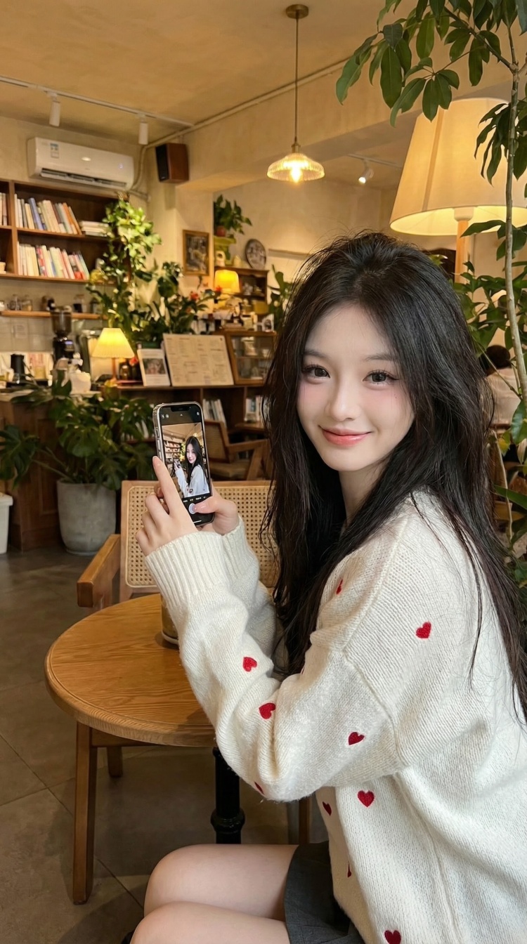 a photo-realistic shoot from a front camera angle about a young woman taking a selfie in a luxurious living room, wearing a pink off-the-shoulder dress, the image also shows a well-furnished living room with beige sofas and a large window with sheer curtains, on the middle of the image, a 20-year-old asian woman with long, wavy black hair, fair skin, and brown eyes appears to be taking the selfie, she is standing with her upper body facing the viewer, looking directly at them with a neutral expression, her hair is styled in loose waves and falls down her back, framing her face, she has a small crescent tattoo on her left shoulder and a slight smile on her lips, her dress is a light pink color with a slight sheen, and she is holding a black iphone in her right hand, taking the photo,