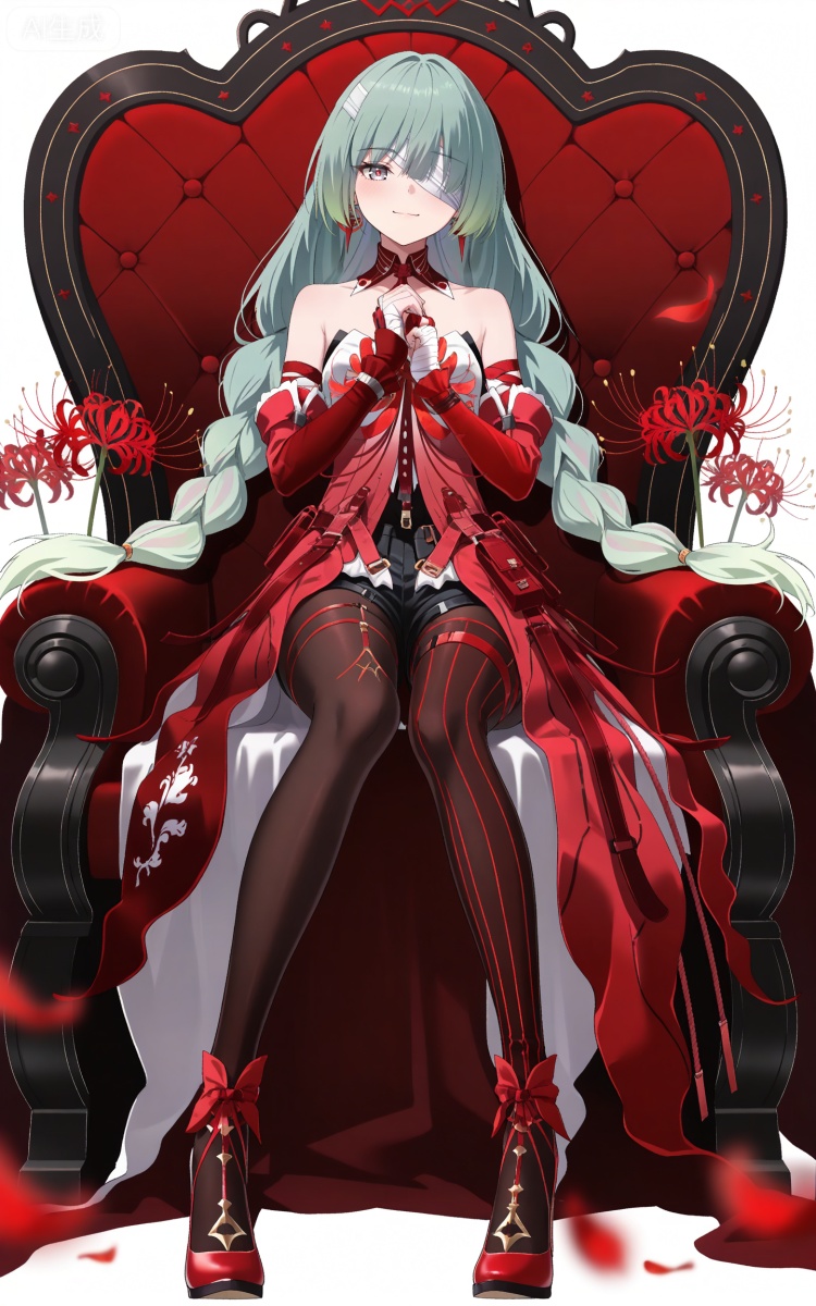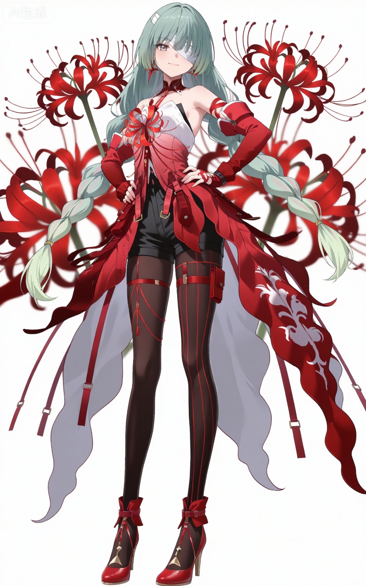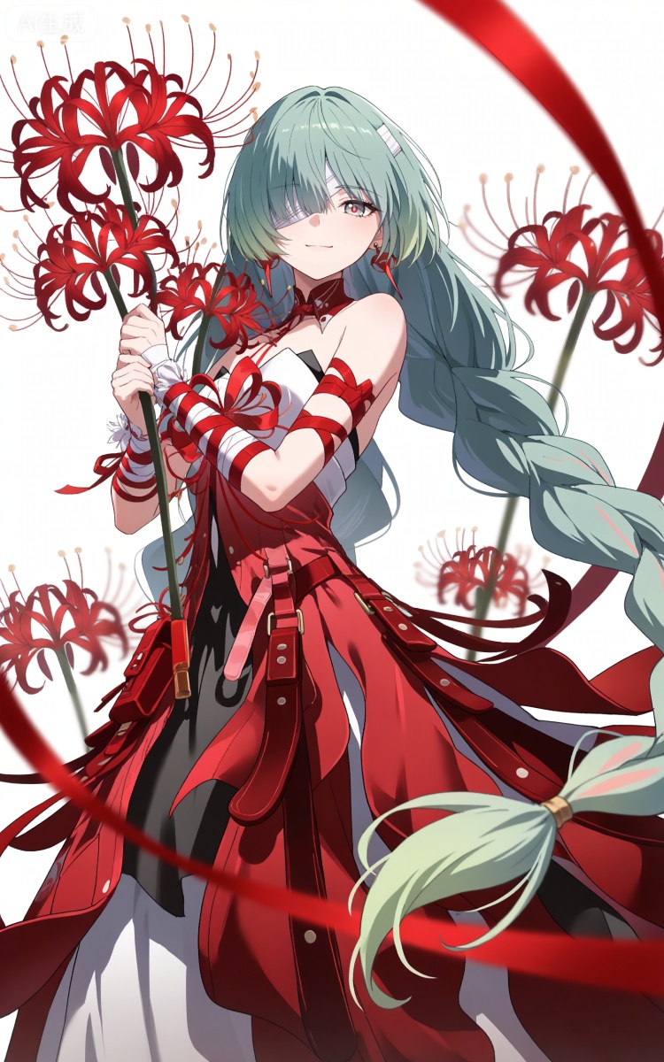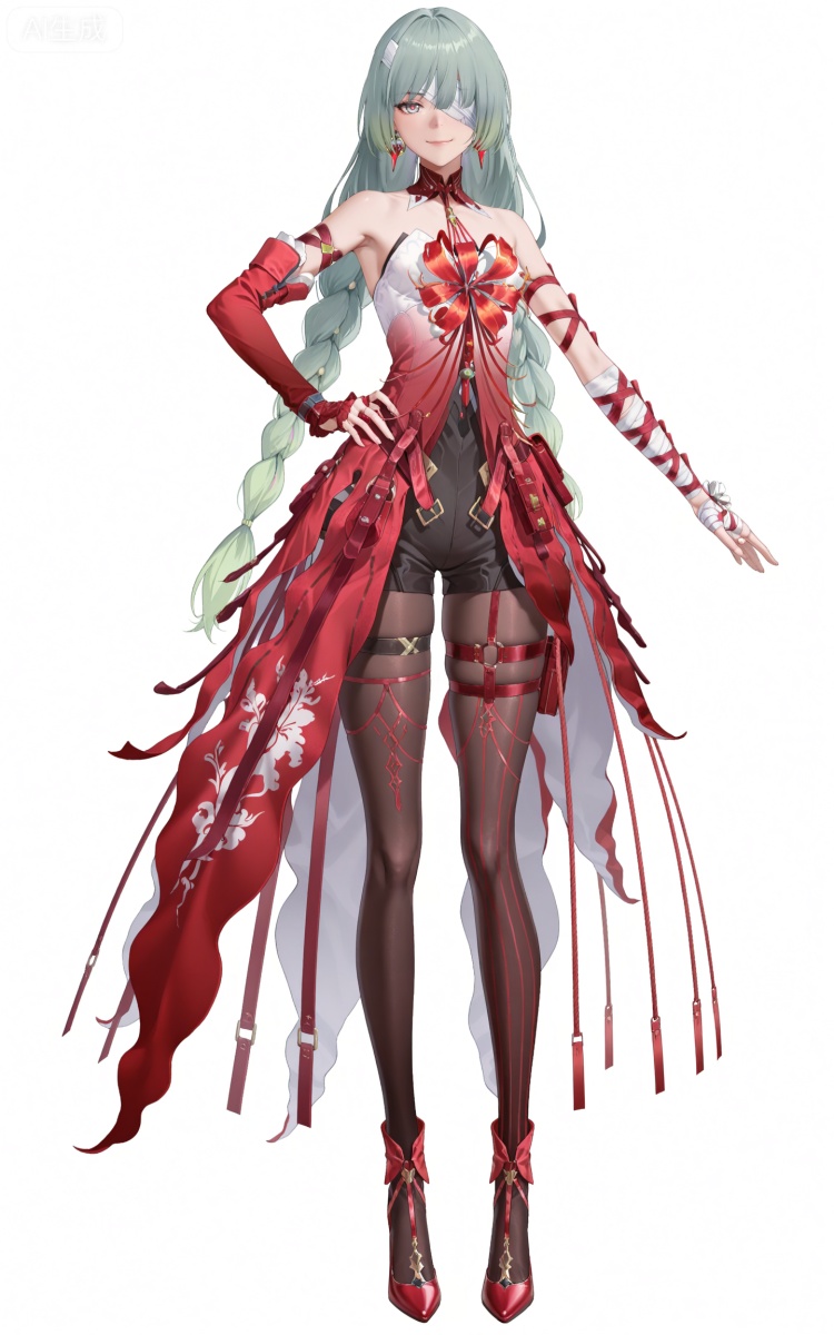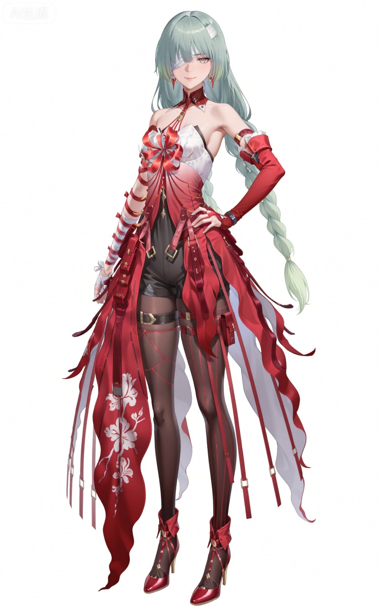 弗洛洛基础提示词(必填):bandage over one eye, braided ponytail, green hair, long hair, gradient hair, multicolored hair, red hair, grey eyes, red pupils, twin braids, very long hair, full red dress, rulolo strapless dress, fulolo arm ribbon, fulolo bandaged arm, fulolo red elbow gloves, fulolo fingerless gloves, fulolo red high heels, fulolo bow high heels, fulolo pantyhose, fulolo red rope, fulolo asymmetrical legwear, fulolo mismatched legwear,