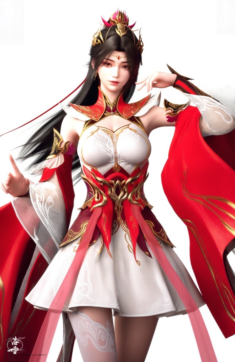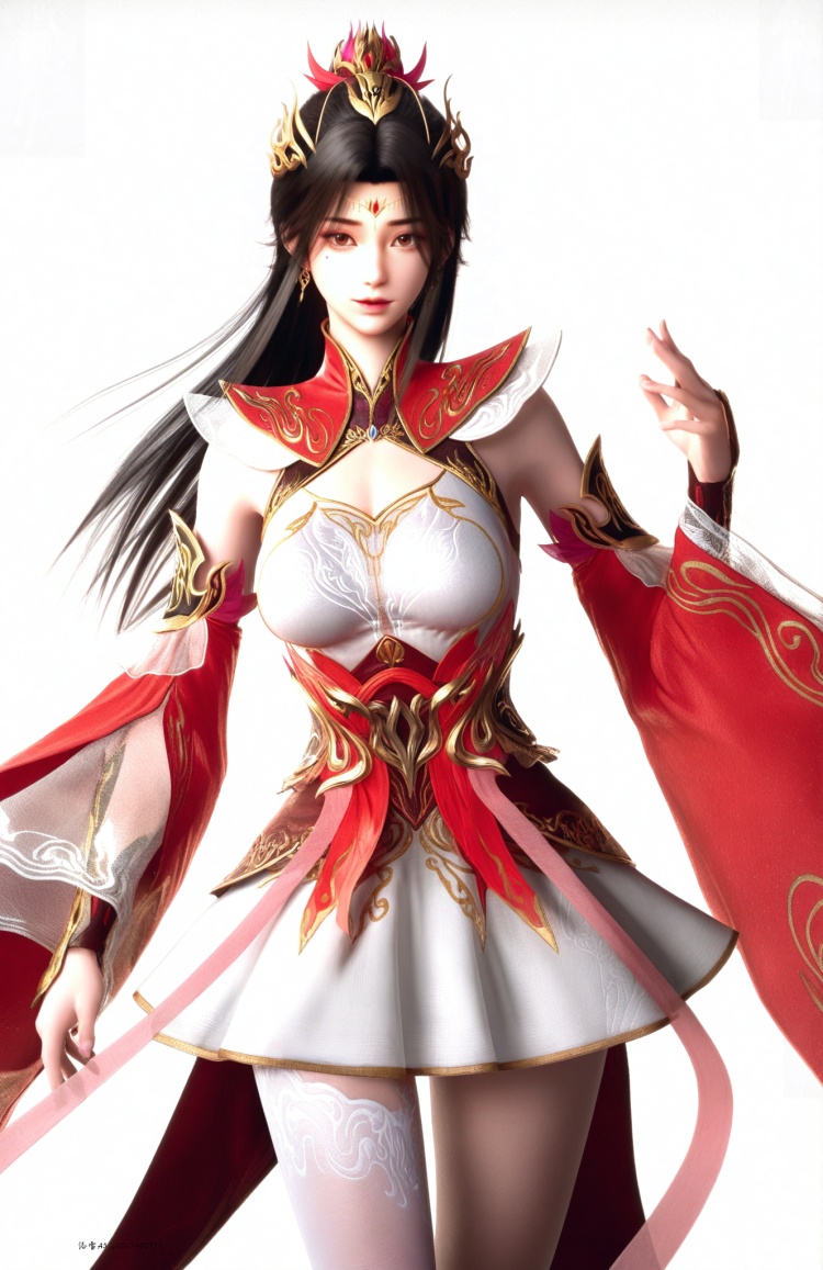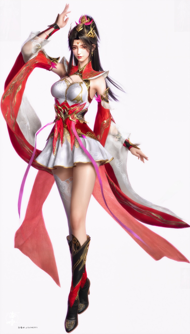 q1263482971, 1girl, solo,single thighhigh, wide sleeves, white thighhighs, (white socks:1.1), white skirt, white pantyhose, white dress, wrist armor, white and red dress, tiara, see-through, sash, red dress, ponytail, mole under eye, makeup, long sleeves, long hair, lace-trimmed legwear, lace trim, lace, jewelry, high heel boots, hair ribbon, hair ornament, hair bun, forehead jewel, earrings, dress, detached sleeves, clothing cutout, chinese clothes, brown hair, brown eyes, boots, black footwear, black hair, bare shoulders, asymmetrical legwear, armor,