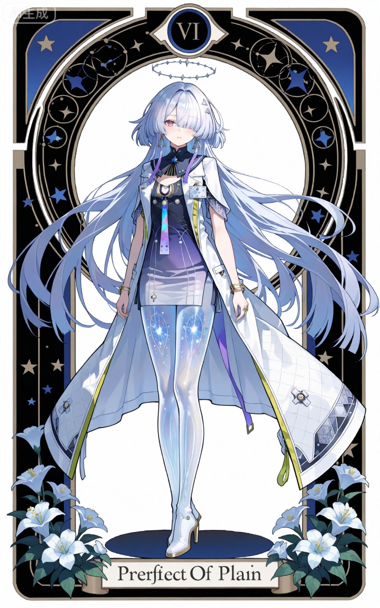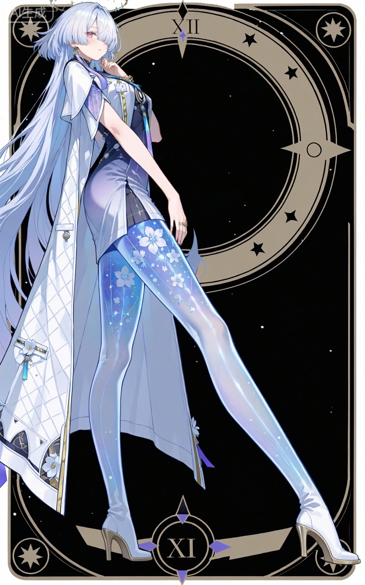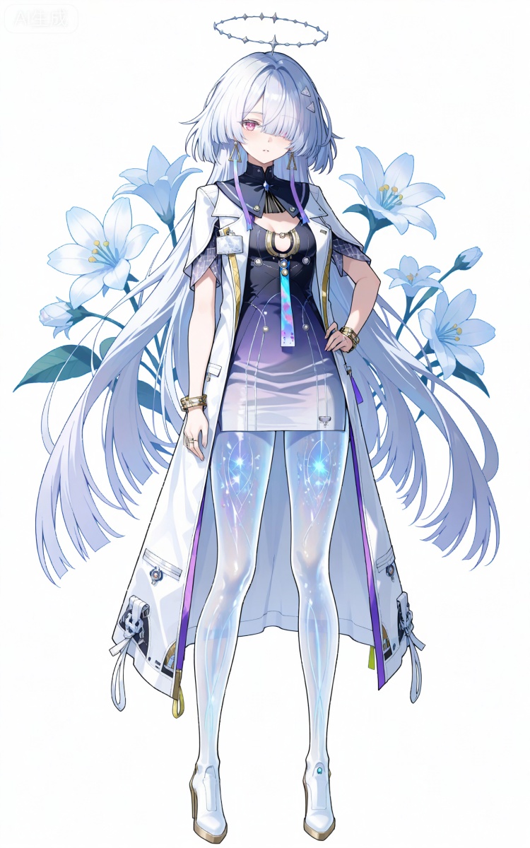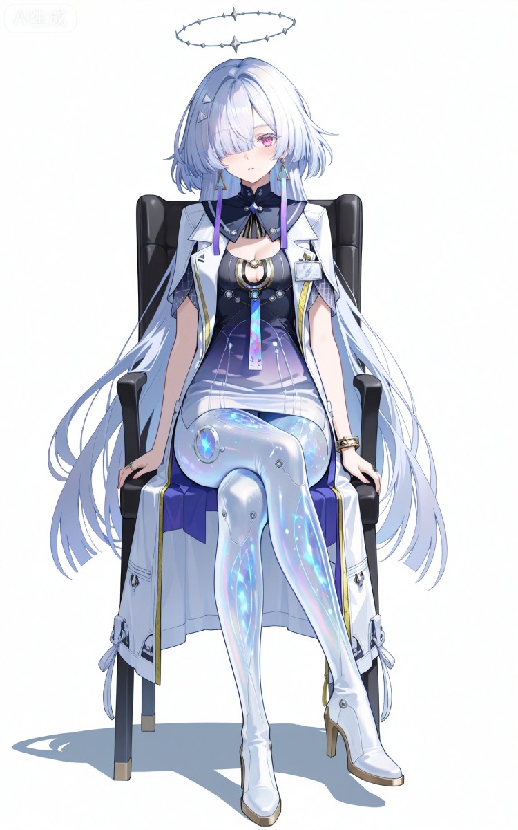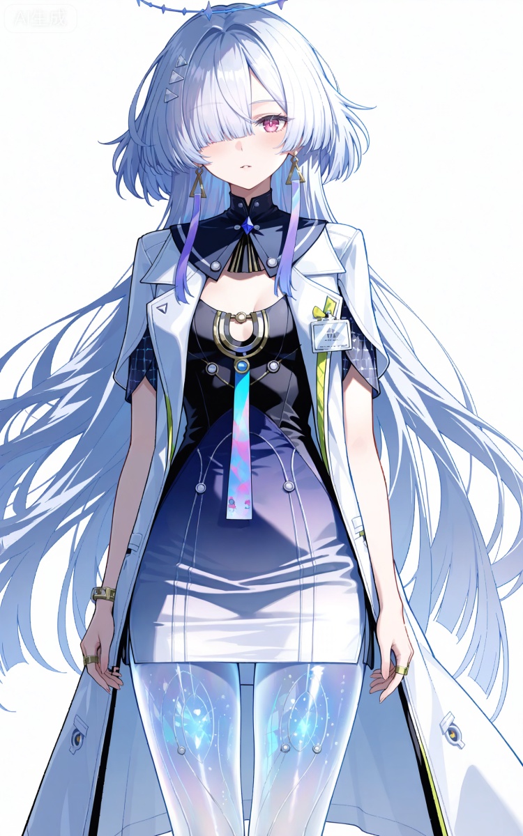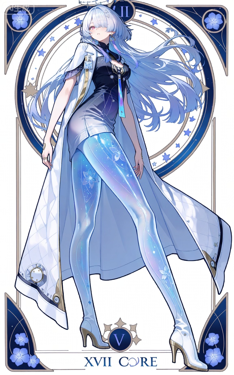莫宁基础提示词(必填):long hair,grey hair,white hair,blunt bangs,mechanical halo,very long hair,hair over one eye,moning white and black short dress,moning gradient dress,moning white coat,moning coat on shoulders,moning sailor collar,moning see through legs,moning high heel boots,