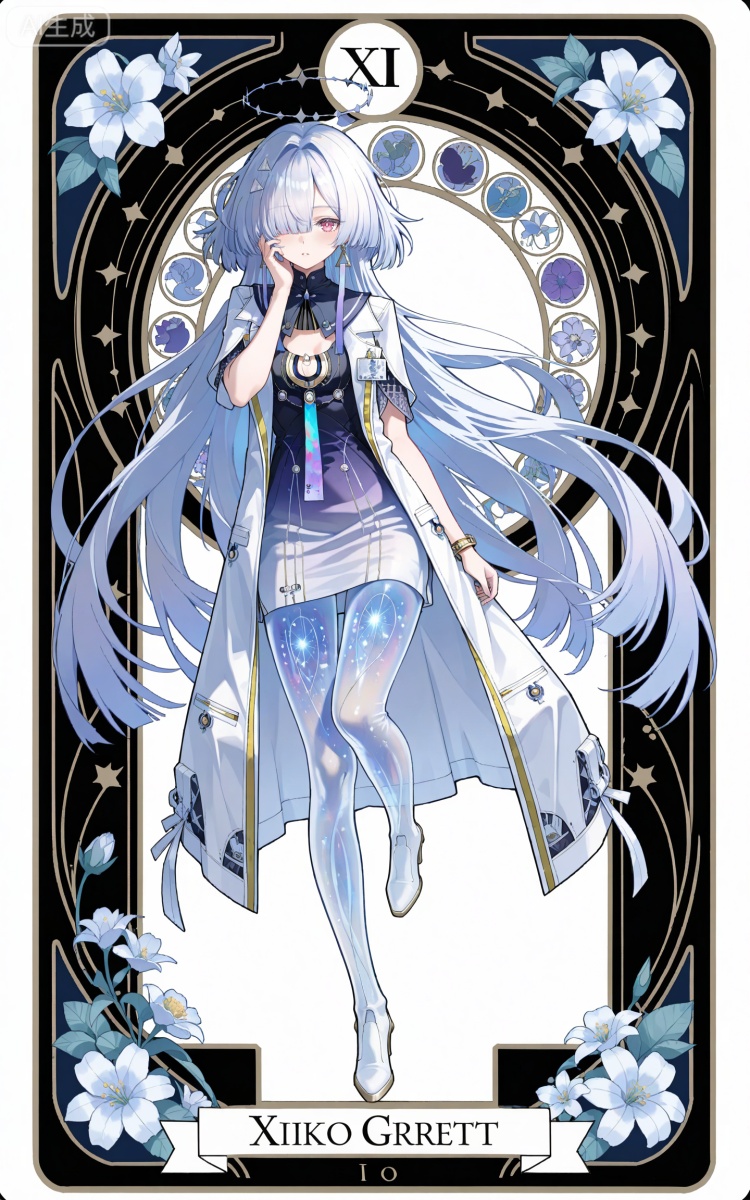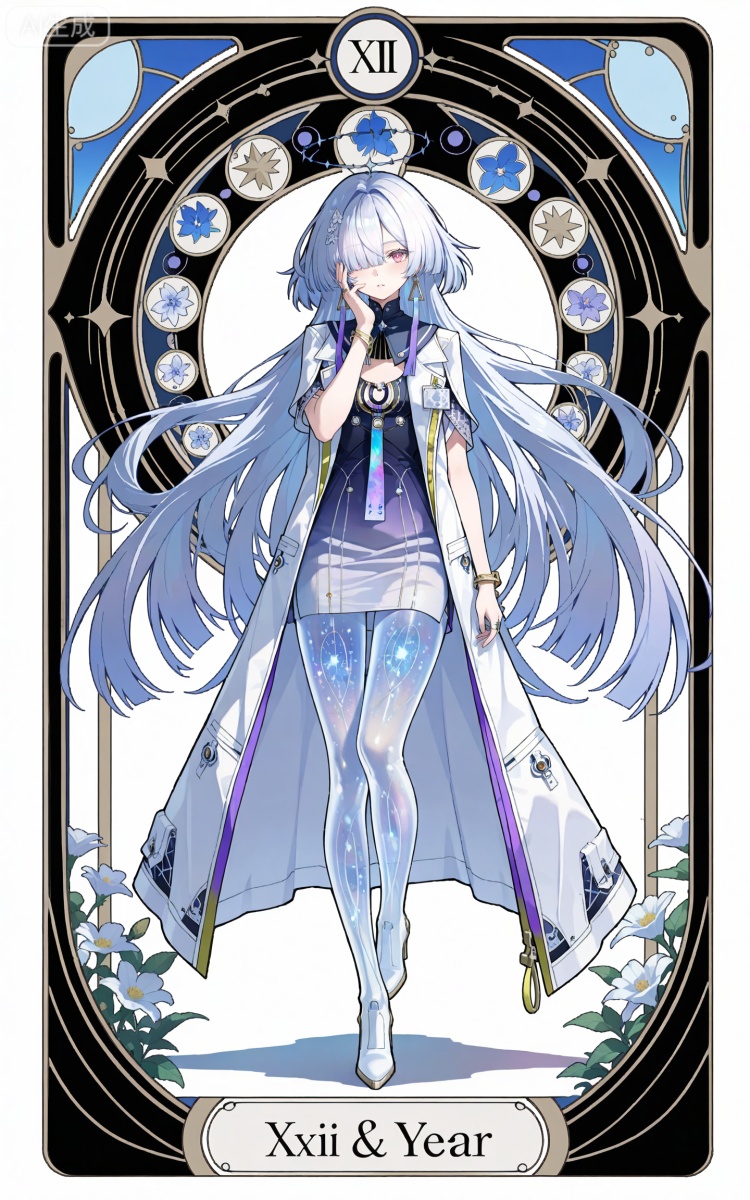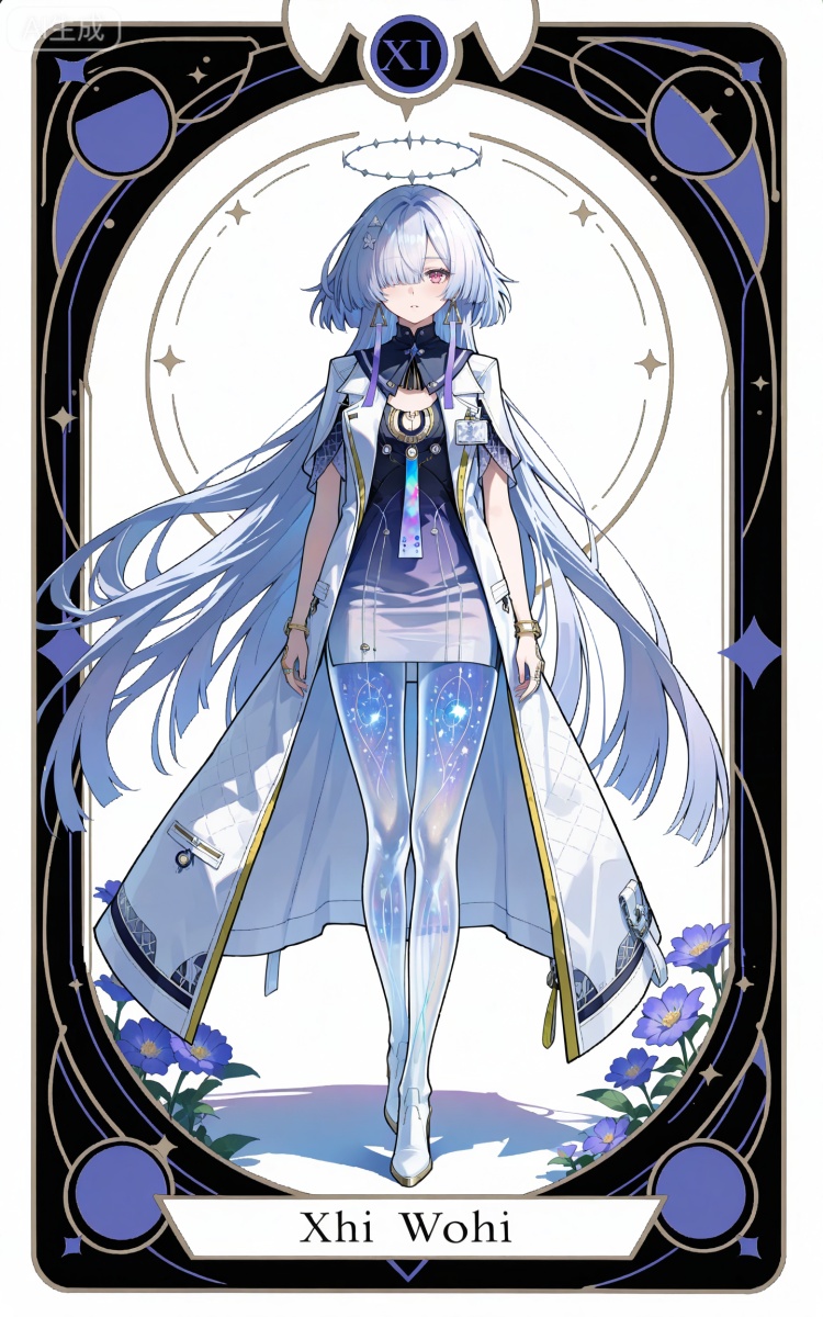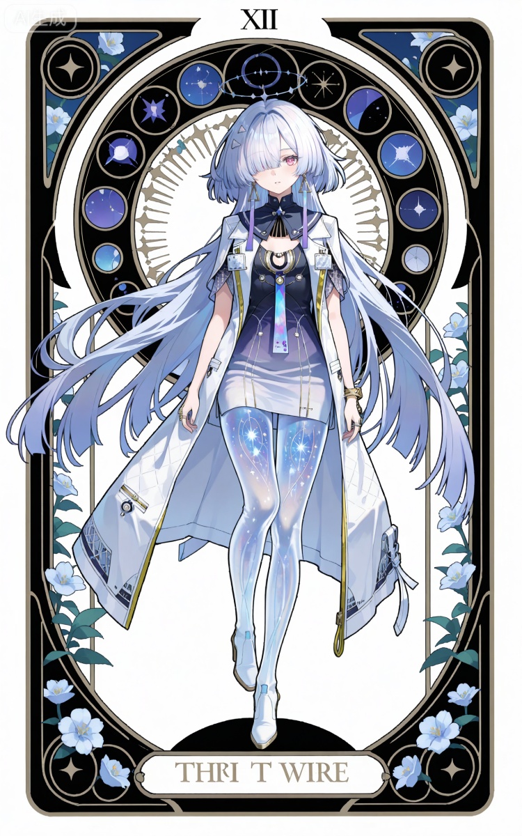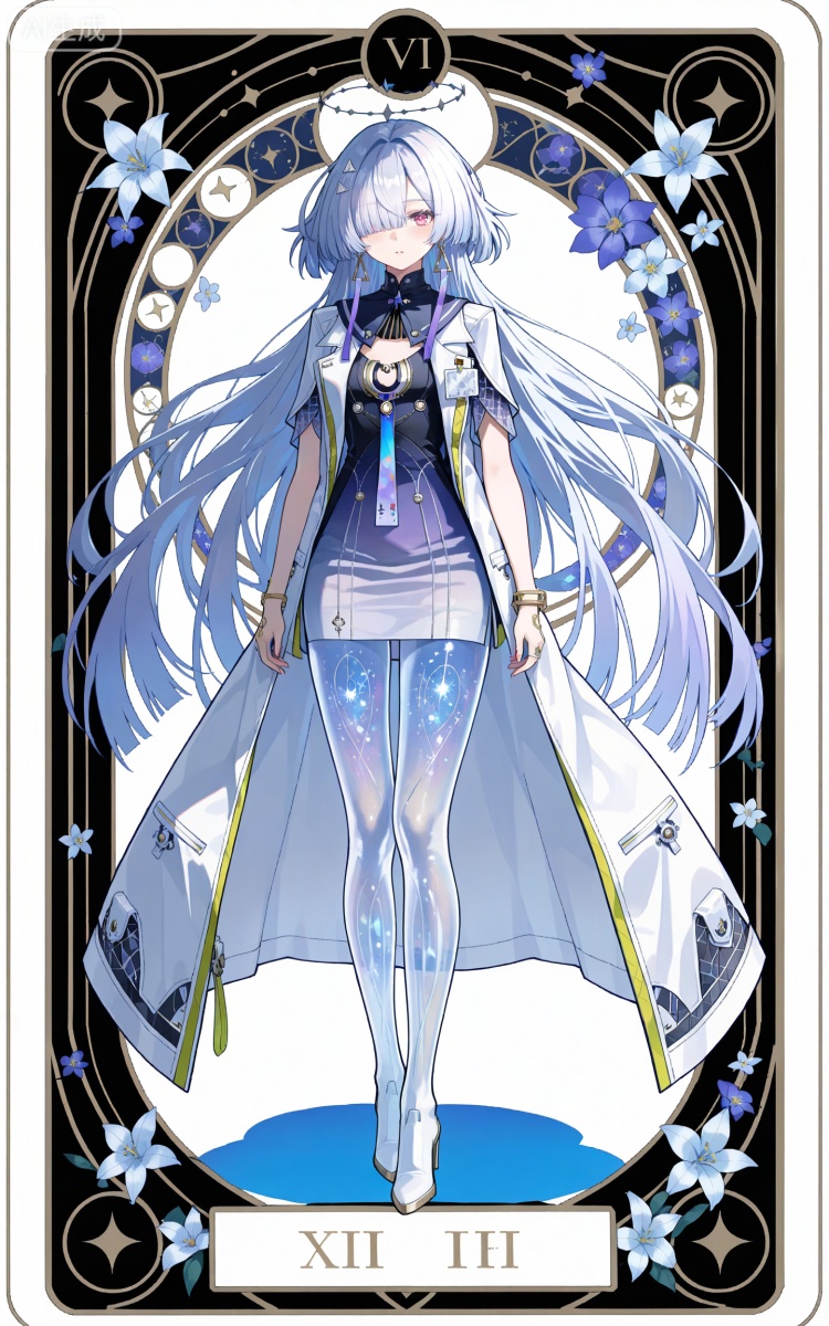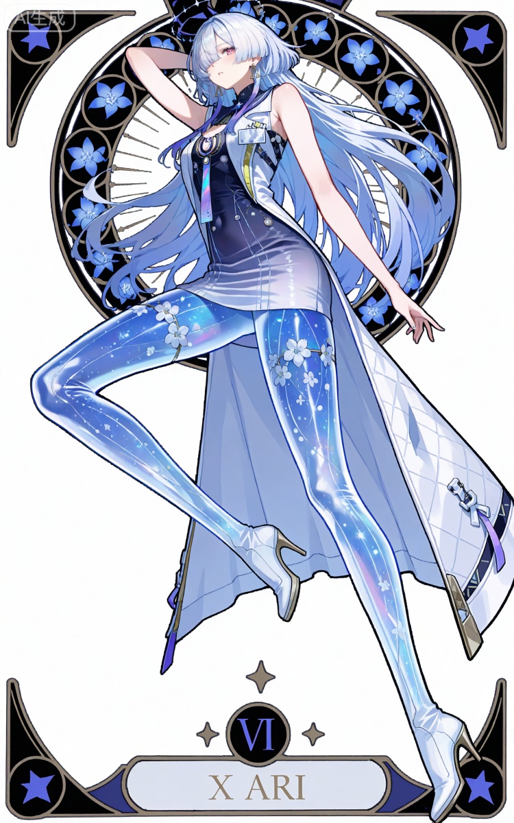 莫宁基础提示词(必填):long hair,grey hair,white hair,blunt bangs,mechanical halo,very long hair,hair over one eye,moning white and black short dress,moning gradient dress,moning white coat,moning coat on shoulders,moning sailor collar,moning see through legs,moning high heel boots,