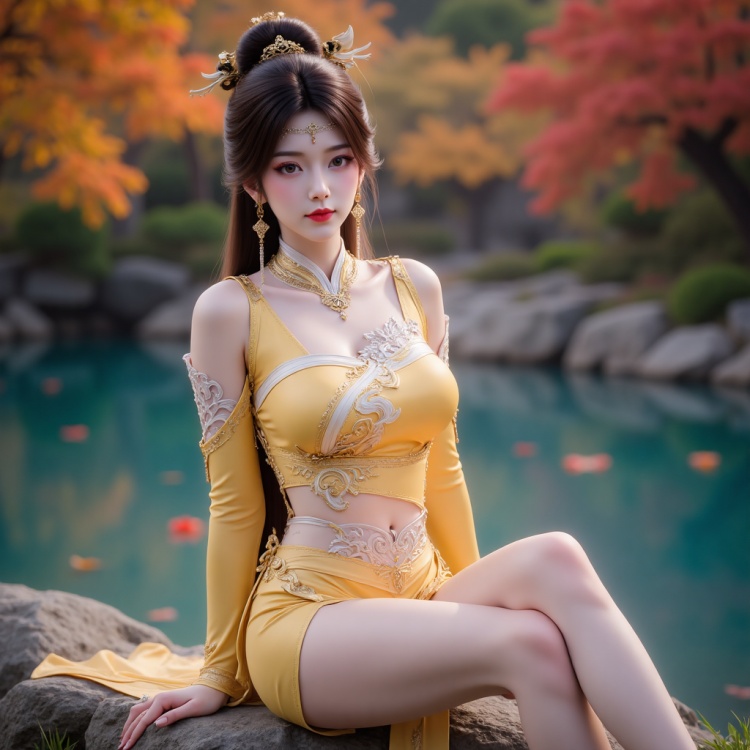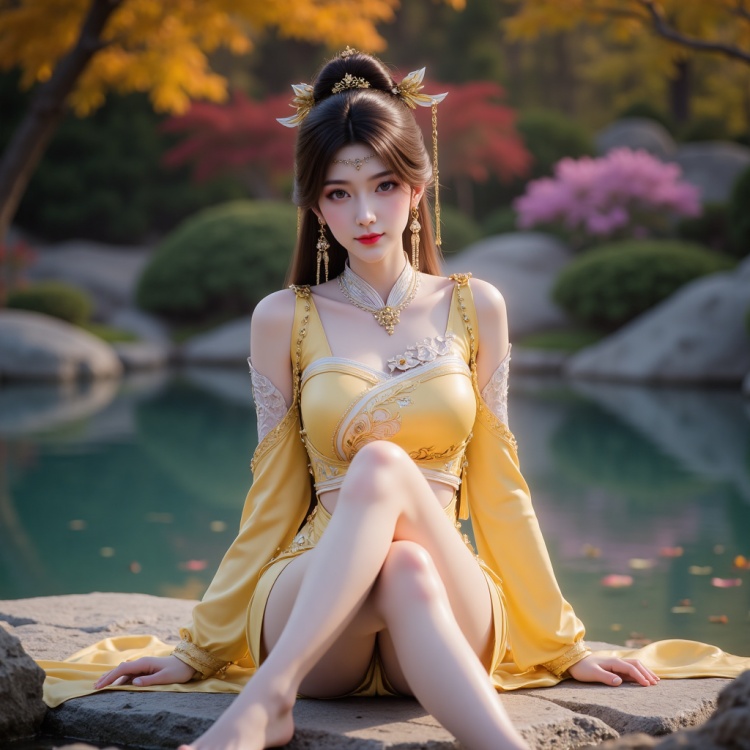 Masterpiece,best quality,movie grade,perfect composition,rich eye details,exquisite facial carving,high quality,high resolution,8K,1 female character,long straight black hair (with golden rooster's soft temperament),exquisite and elegant makeup (red lips, fairy eye makeup),quiet and soft facial expression,white skin,headdress,chest,medium bust,slender legs,exposed legs,clothing: (gilded) warm yellow guofeng autumn pool golden rooster clothing,with exposed lines at the waist and shoulders,combined with wool embroidery and metal decoration,and wearing exquisite headdress,which combines the style of "guofeng moonlight golden rooster magic girl". the character sits on a soft light gray fabric cushion with his legs folded (the right leg is placed on the left leg),the body is slightly tilted to the left,the upper body is straight but the shoulders are relaxed,the right hand is naturally placed on the right thigh,the finger gently presses the leg,the left arm naturally droops,the elbow lightly leans against the knee,the head slightly lowers,the eyes look directly at the lens,the facial expression is cold with a touch of softness,the overall posture is lazy and full of relaxation,the body movement is naturally not stiff,the shooting angle is flat and slightly inclined,the focal length is medium focus,the picture composition is compact,and the main body is prominent,background: the background is indoor home scene,behind the character is a floor-to-ceiling window with a wooden window frame. Many pots of green plants (such as coriander, turtle-backed bamboo, etc.) are placed on the window sill. The flowerpots are made of clay and white materials. The green plants are luxuriant and add vitality. The window is light brown wooden furniture. The ground is light wooden floor. The background is slightly false,which not only retains the details of the home environment,but also makes the main body of the characters stand out,