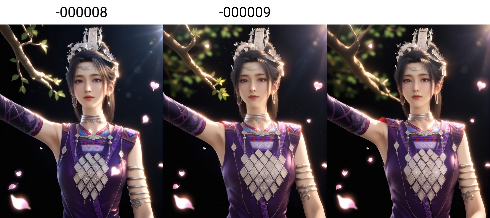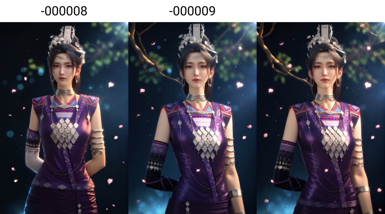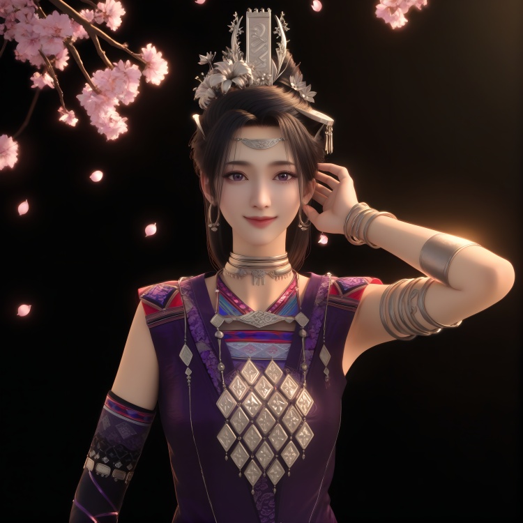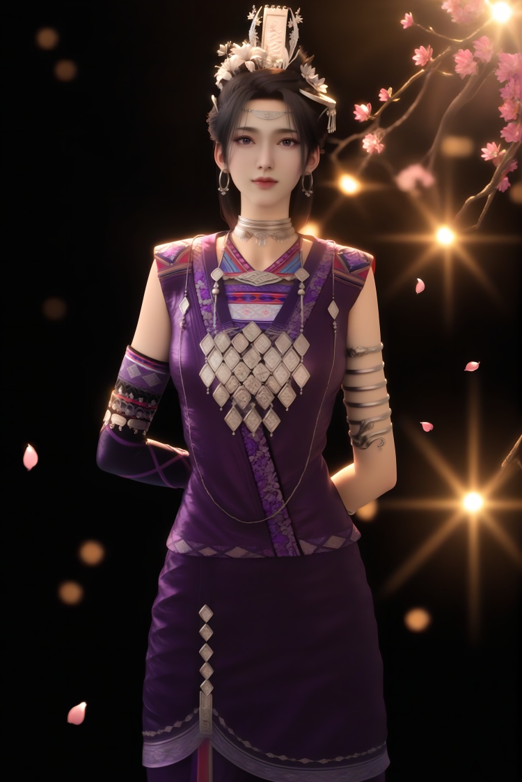 (score_9), (glamor:1.1),narrow waist,<lora:紫萱-pony-000008:0.85>,1girl,solo,long hair,black hair,hair ornament,jewelry,hoop earrings,circle,hair flower,tiara,------注释:人物属性---- choker,silver choker,necklace,purple dress,elbow gloves,armlet,bracelet,single elbow gloves,-----注释:人物服装,可以更换------- collarbone,heart,spoken heart,(arms behind back), looking at viewer,(front view),cowboy shot,-----注释:人物动作镜头角度神态------ BREAK <lora:皮肤凹痕:1>,(white_skin:1.1),(fair_skin:1.1),realistic,-----注释:人物肤色----- twig,branch,falling petals, simple background,black background,rim light,Volumetric Lighting,lens flare,Tyndall effect,depth of field,bokeh,sparkle,<lora:e色温:-0.6>,<lora:SDS-XL泛光调节器_v1.0:1.2>,-----注释:环境背景光影等等----- 建议权重:0.8-0.9多试试,触发词:zixuan,可能含有背景污染; CFG:3.5或者5 分辨率:1024-1024,1024-1536,832-1216;分辨率越大建议CFG越大,同时容易出现多手指的问题,分辨率看情况。动作请结合控制器使用