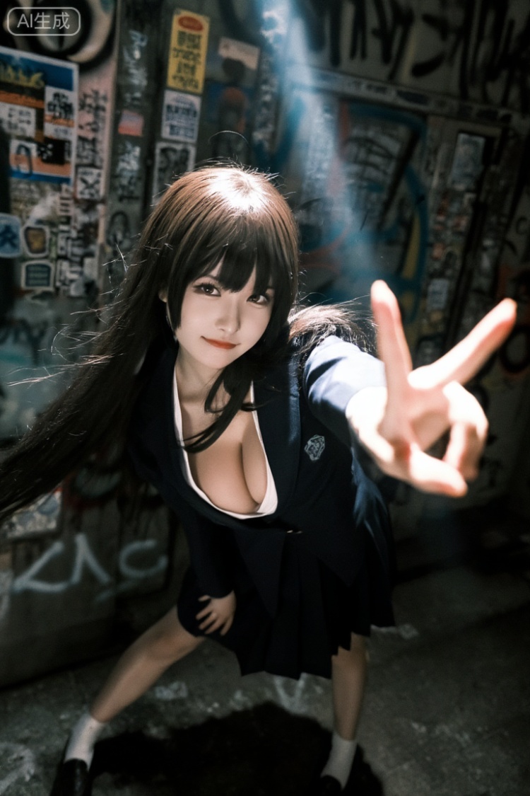 日本复古摄影,胶片颗粒,低饱和度色调,美女,深色长发,富江发型,穿JK制服,大胸,摄影写真,真人,高角度俯拍,正面照,看向镜头,微勾唇角,背景是满是涂鸦和贴满了小广告的小巷子,昏暗,人物背靠墙壁,一只脚收起,头顶斜着有一束光落下,发丝细腻富有光泽,一只手伸向前方,胜利手势