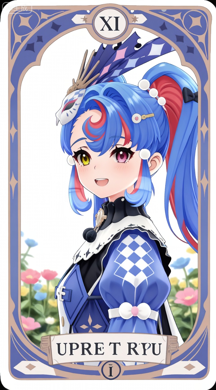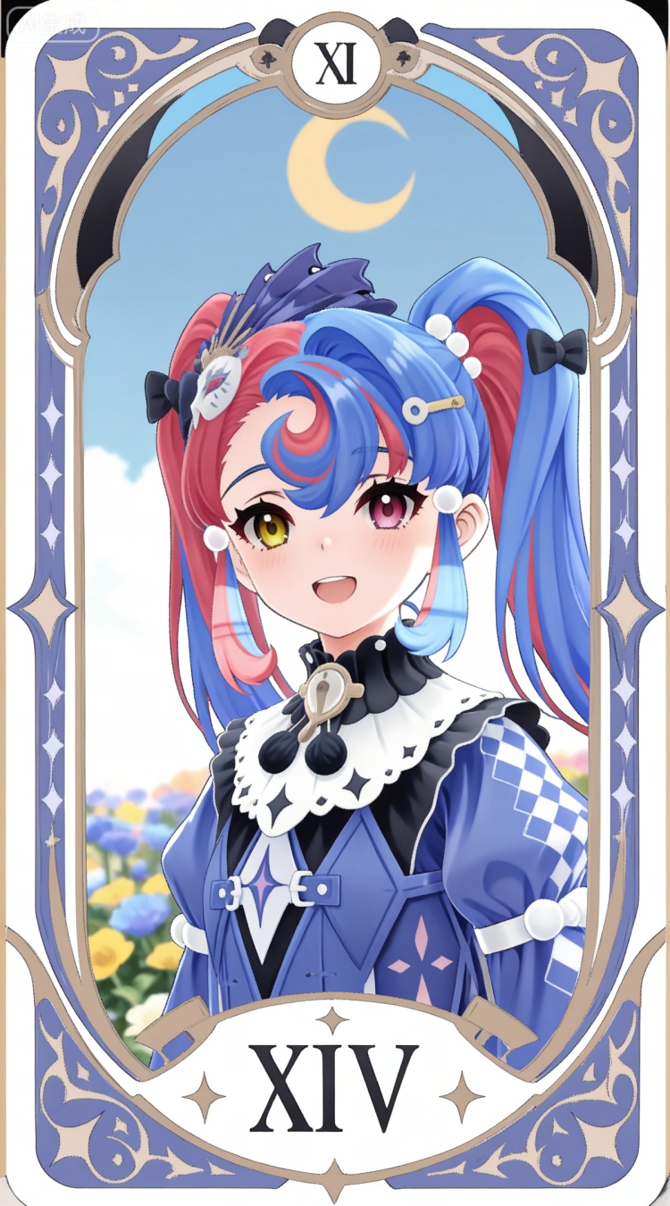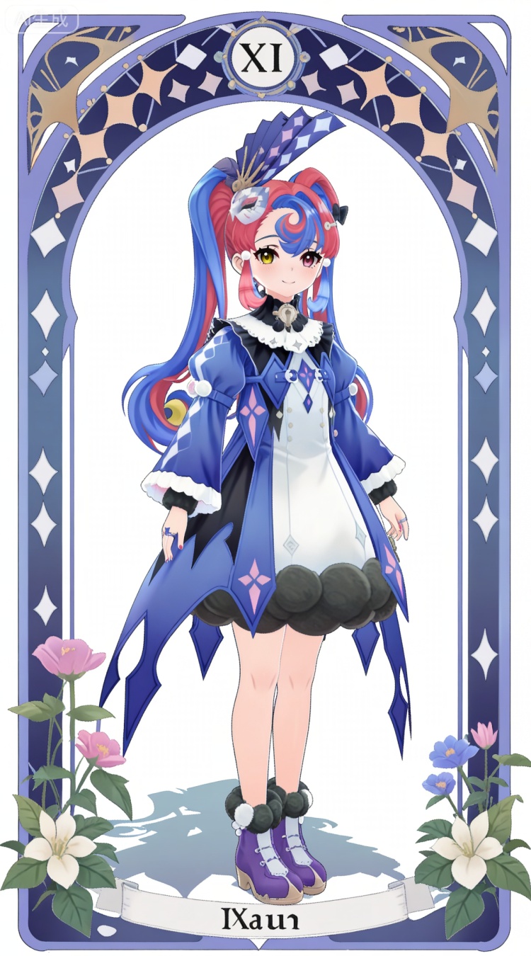 洛可可基础提示词(必填):heterochromia, pink eyes, yellow eyes, two-tone hair, long hair, red hair, twintails, blue hair, crescent bangs, streaked hair, blue headwear, hair bow, hairclip, luokeke blue and white dress, luokeke fur trim dress, luokeke juliet sleeves, luokeke boots, luokeke fur trim purple footwear,