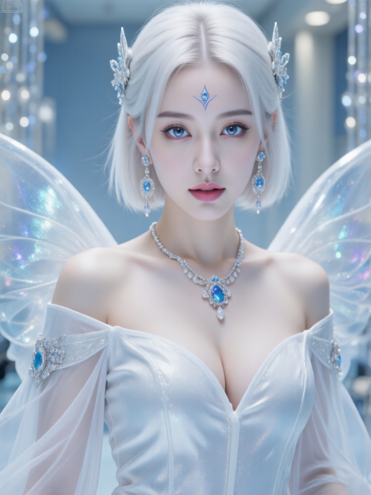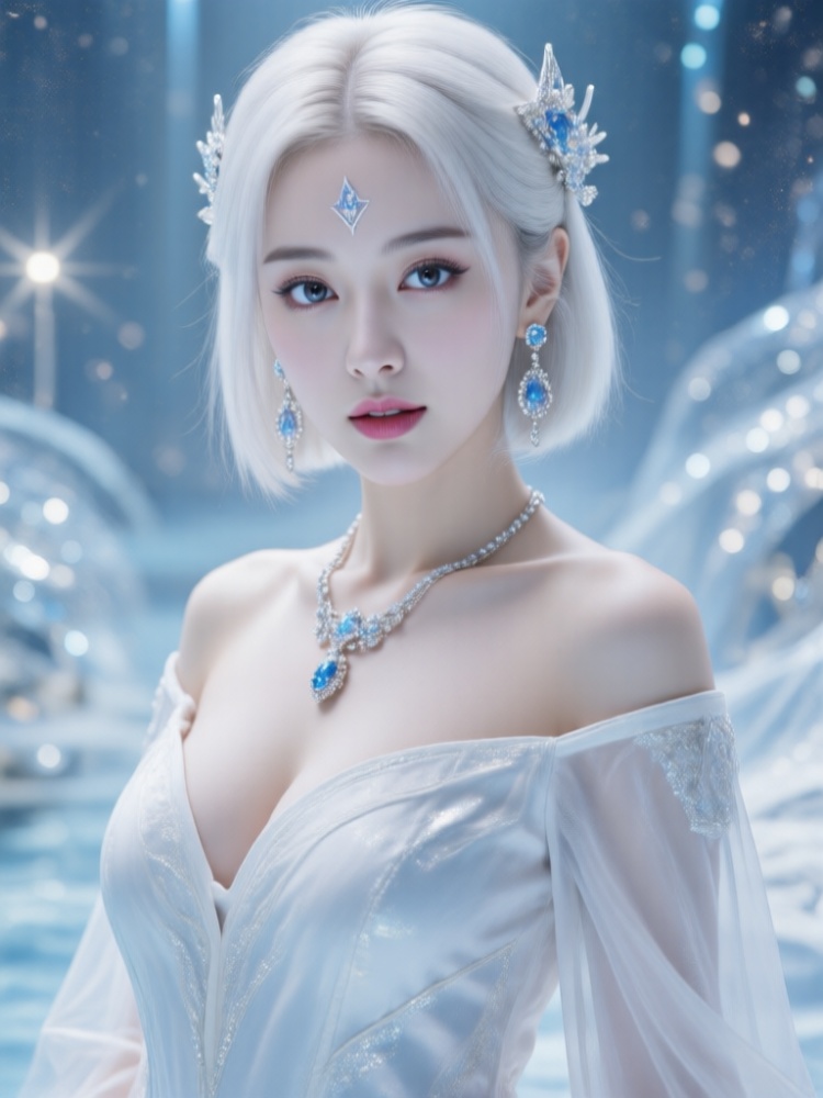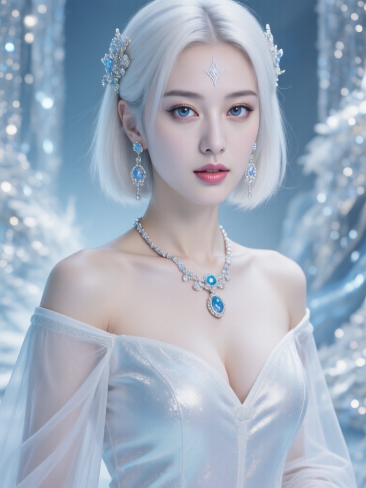 Create a 1girl image rendered in photorealistic detail and impactful wallpaper style. The girl has a sexy and plump figure, with huge 36F breasts and fair skin. Beautiful Chinese woman with silver-white Pixie Cut hairstyle. The shooting background is blue, professional studio lighting is used, and the characters are elegant in posture, showing the effect of a magazine cover. Using a Canon EOS R6 Mark II mirrorless camera with a 35mm f/8 aperture lens and a 50mm f/1.2 lens on a Sony A7R5 with a shutter speed of 1/160 sec and an ISO setting of 200. The light effect includes residual candle warm light + cold side light, ensuring that embroidery patterns and accessories scratches are clearly visible, while retaining the true hair texture and natural beauty effect without distortion. The overall style is real, delicate and full of impact, making it suitable for wallpaper display..,large natural breast