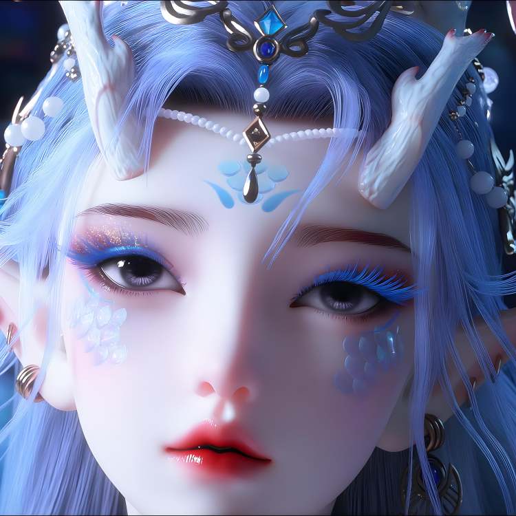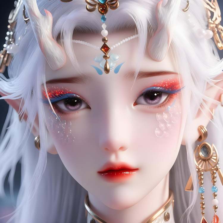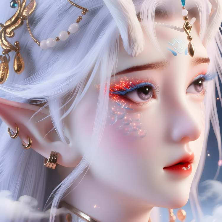 This is FengNianyun, This is a highly detailed, digital CGI portrait of a fantasy elf-like female character with pale white skin and long, flowing pinkish-white hair. She has pointed ears, small horns on her head, and a serene expression. Her eyes are a soft blue, and she wears intricate, silver armor adorned with blue gemstones and delicate, pearl-like ornaments. Her attire includes a high-necked, sleeveless top with elaborate patterns and a corset-like belt with ornate designs. She also wears translucent, semi-transparent sleeves. making her ethereal appearance stand out. The image has a realistic yet fantastical style, emphasizing her otherworldly beauty.