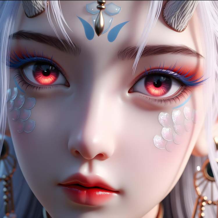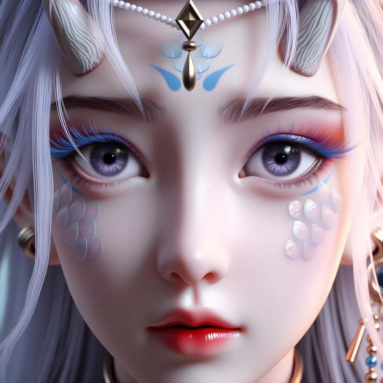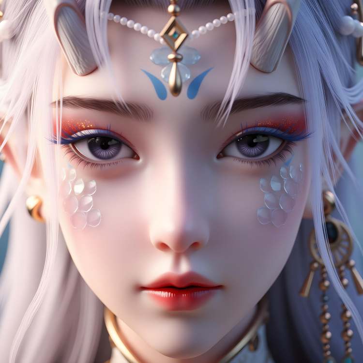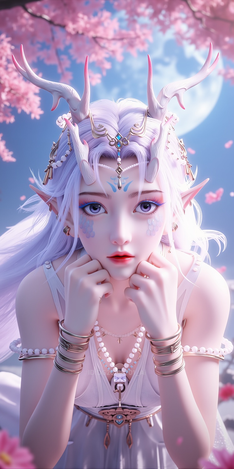 This is FengNianyun, This is a highly detailed, digital CGI portrait of a fantasy elf-like female character with pale white skin and long, flowing pinkish-white hair. She has pointed ears, small horns on her head, and a serene expression. Her eyes are a soft blue, and she wears intricate, silver armor adorned with blue gemstones and delicate, pearl-like ornaments. Her attire includes a high-necked, sleeveless top with elaborate patterns and a corset-like belt with ornate designs. She also wears translucent, semi-transparent sleeves. making her ethereal appearance stand out. The image has a realistic yet fantastical style, emphasizing her otherworldly beauty.