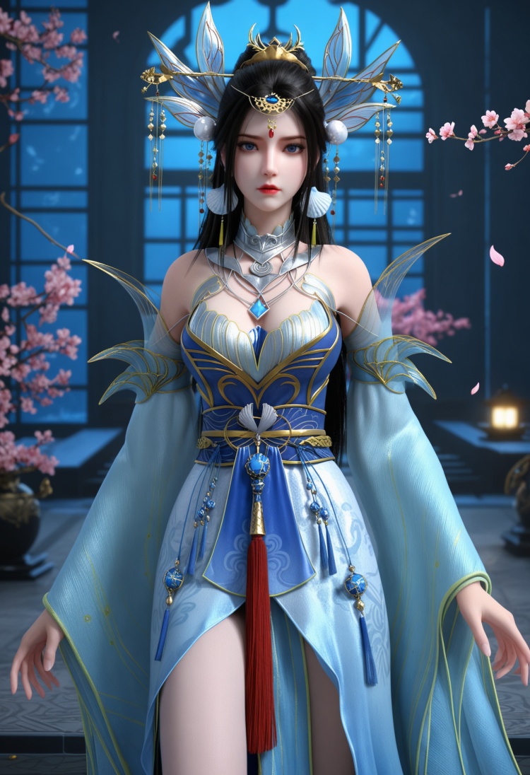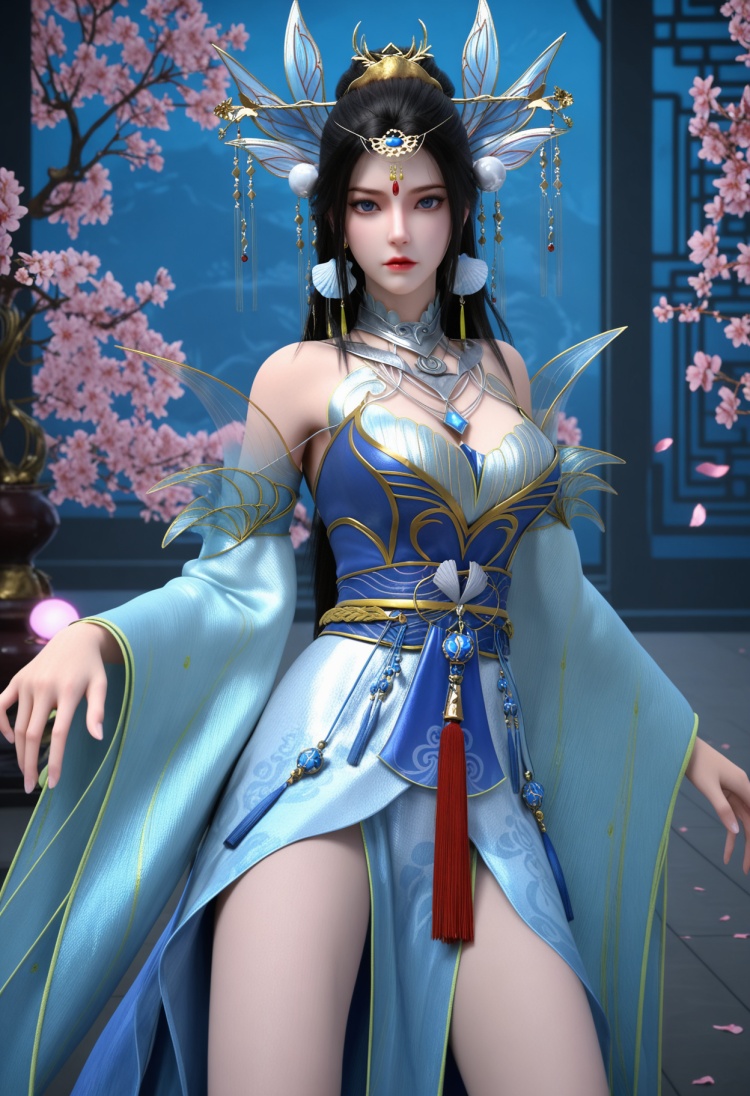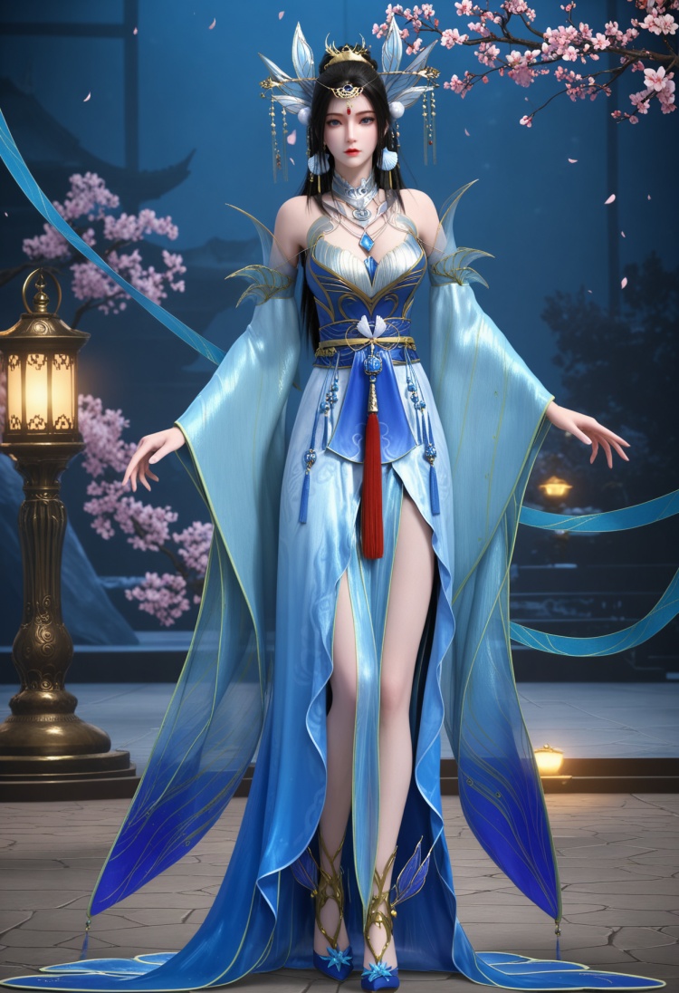 q1528437228,1girl,solo,hair ornament,black hair,long hair,jewelry,dress,earrings,blue dress,chinese clothes,detached sleeves,blue eyes,sash,necklace,high heels,hair bun,tiara,blue footwear,brown hair,forehead mark,wide sleeves,long sleeves,pantyhose,ponytail,detached collar,collar,thighs,gold footwear,