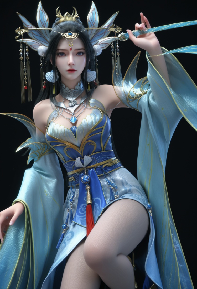<lora:YQ_pony_chuxuan_V4:0.8>,q1528437228,1girl,solo,hair ornament,black hair,long hair,jewelry,dress,earrings,blue dress,chinese clothes,detached sleeves,blue eyes,sash,necklace,high heels,hair bun,tiara,blue footwear,brown hair,forehead mark,wide sleeves,long sleeves,pantyhose,ponytail,detached collar,collar,thighs,gold footwear,