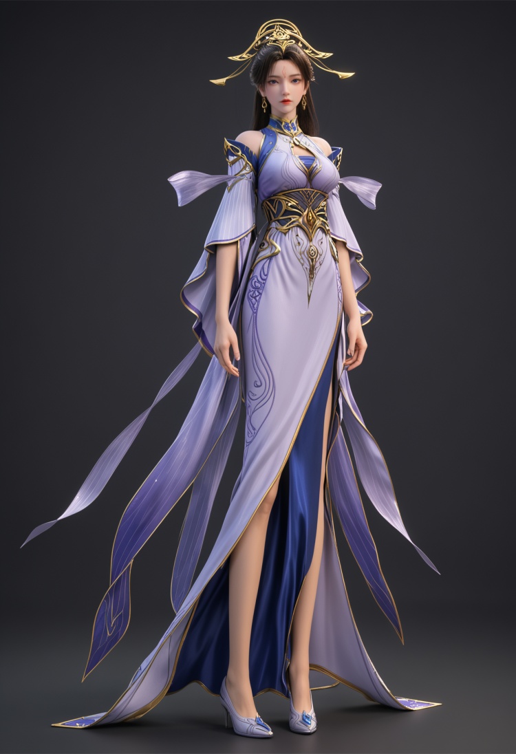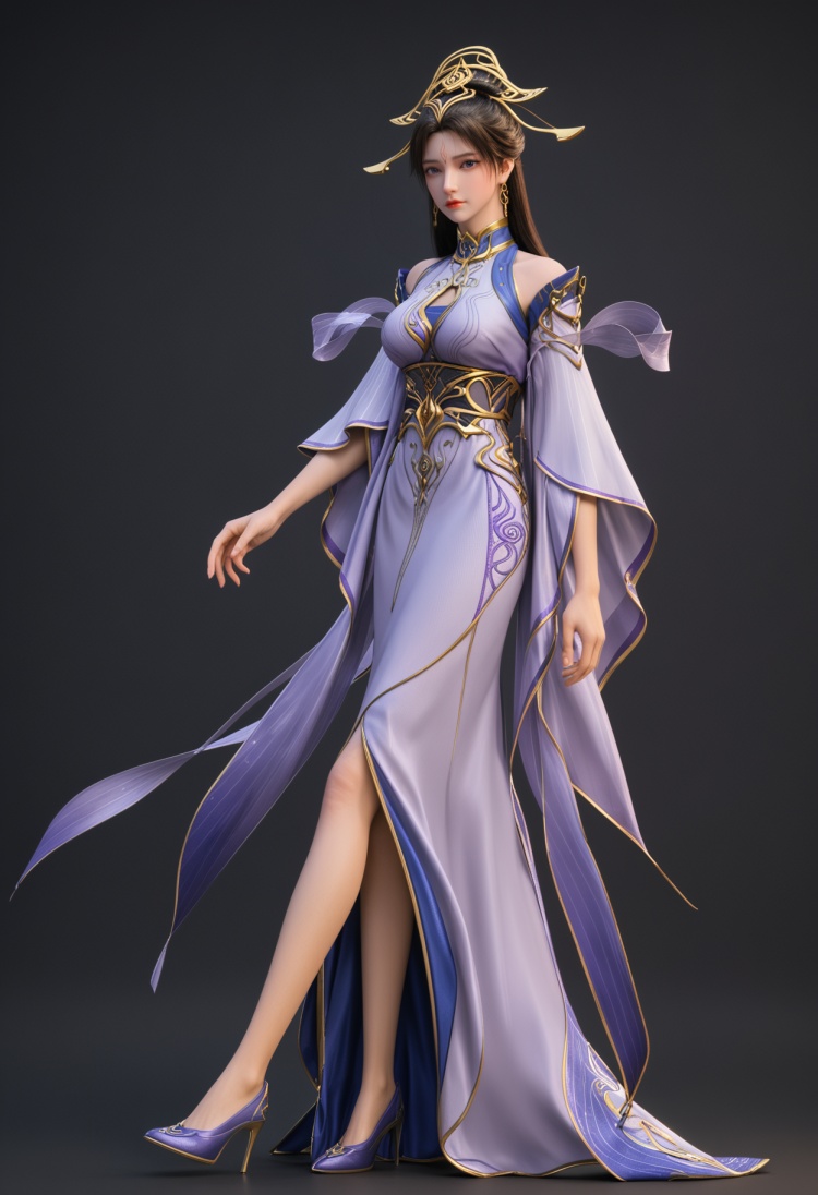 q1528437228,1girl,solo,long hair,hair ornament,jewelry,earrings,black hair,dress,forehead mark,blue eyes,brown hair,detached sleeves,hair bun,chinese clothes,sash,wide sleeves,high heels,pantyhose,ponytail,long sleeves,shoes,black pantyhose,purple eyes,stiletto heels,blue footwear,
