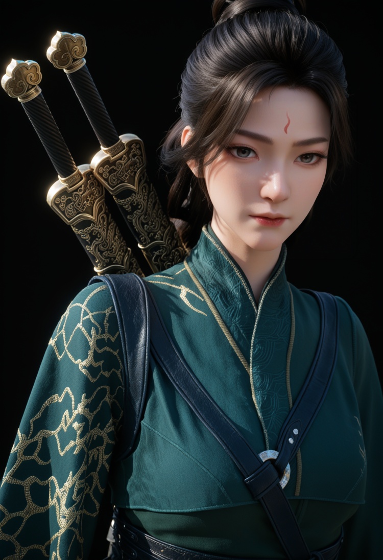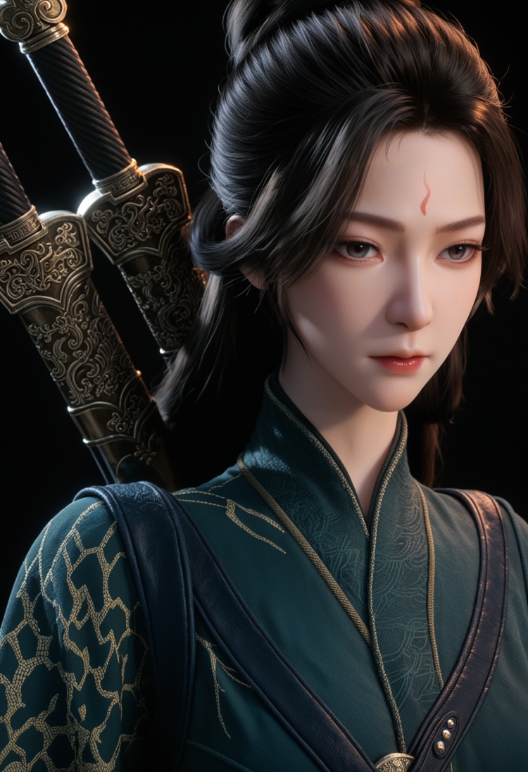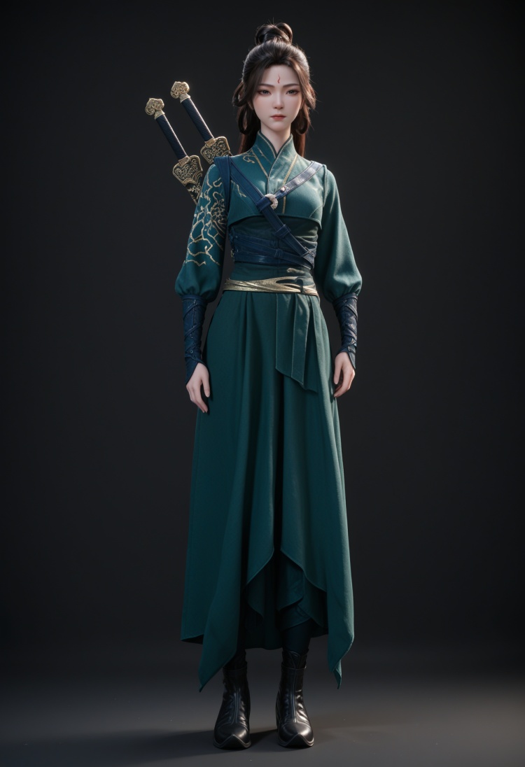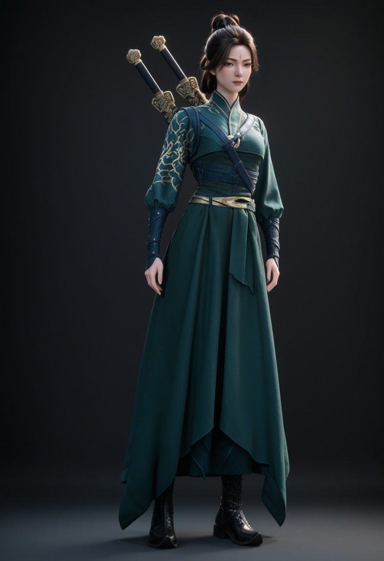 q1528437228,1girl,solo,black hair,long hair,chinese clothes,forehead mark,weapon,sword,weapon on back,sword on back,long sleeves,hair bun,sword behind back,blue eyes,black eyes,boots,sheath,brown hair,jewelry,brown eyes,black footwear,hair rings,