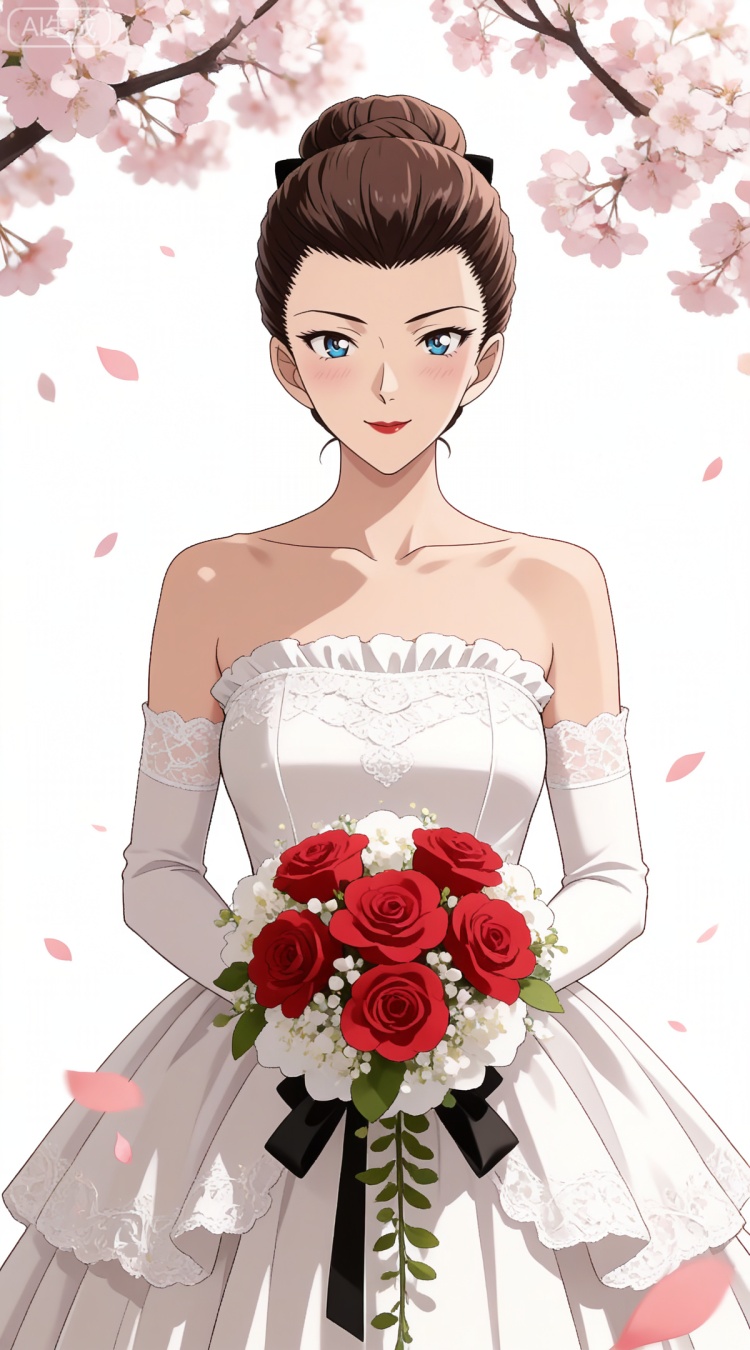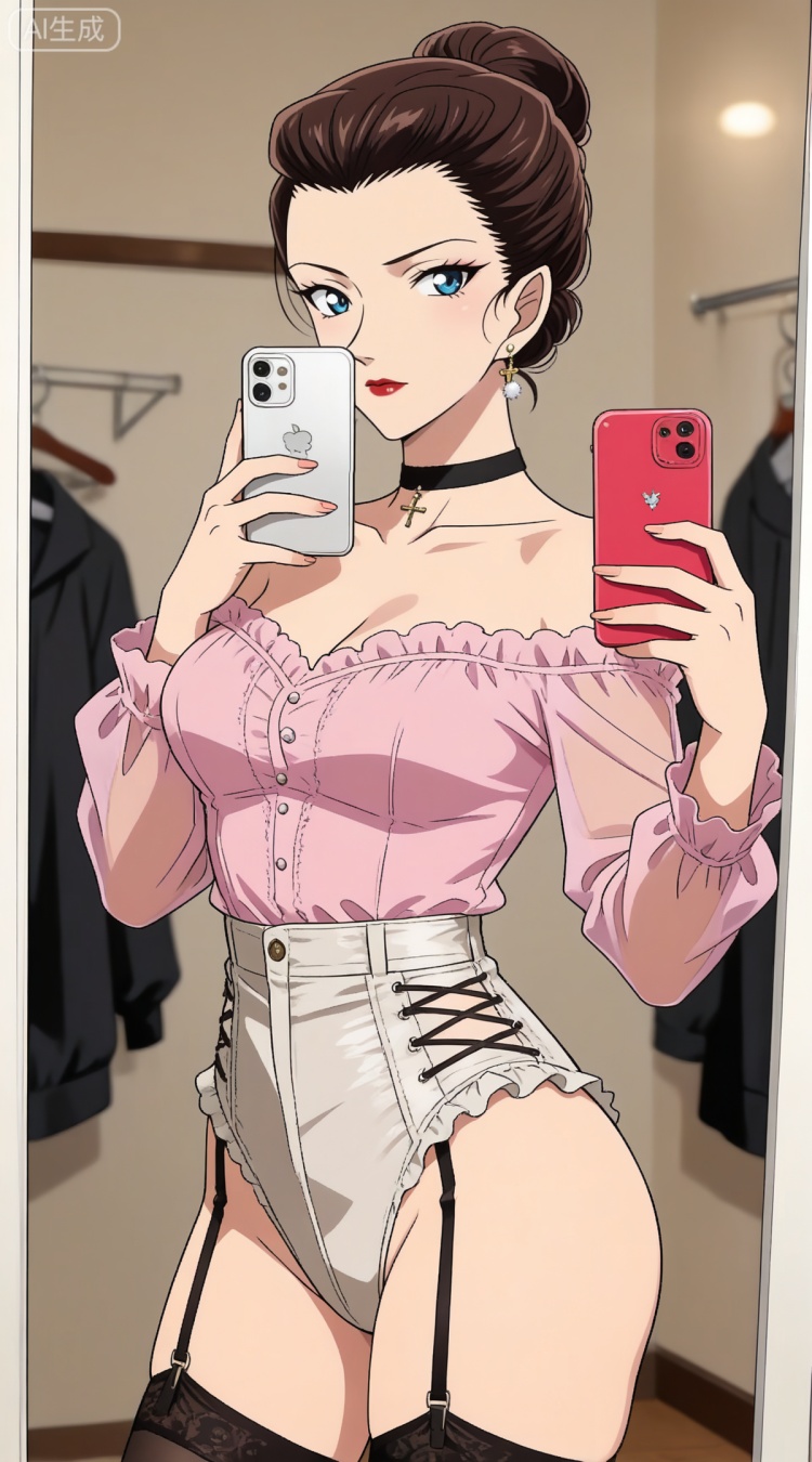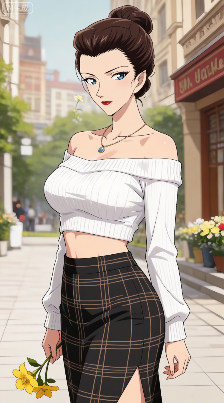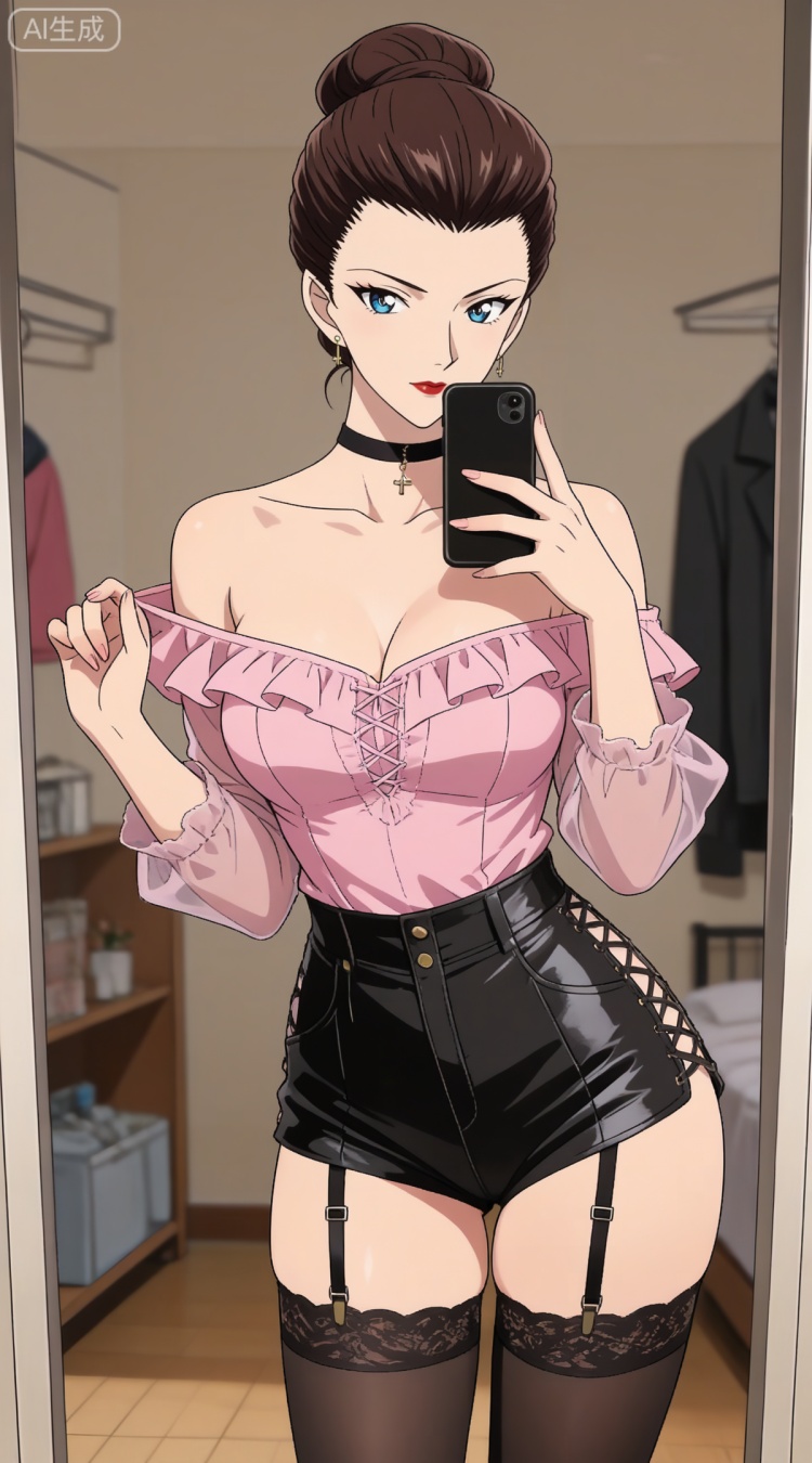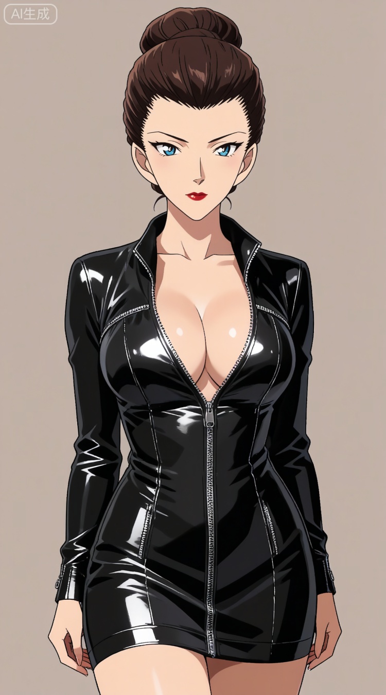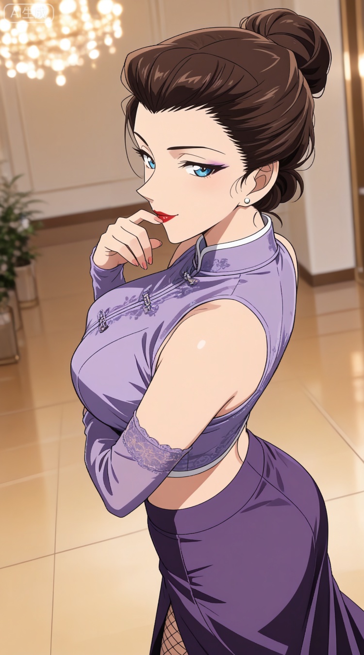 服部静华基础提示词(必填):brown hair,blue eyes,hair bun,single hair bun,lipstick,makeup,large breasts,