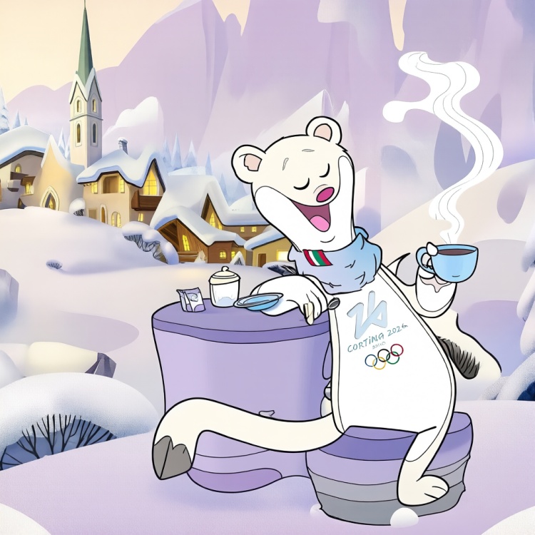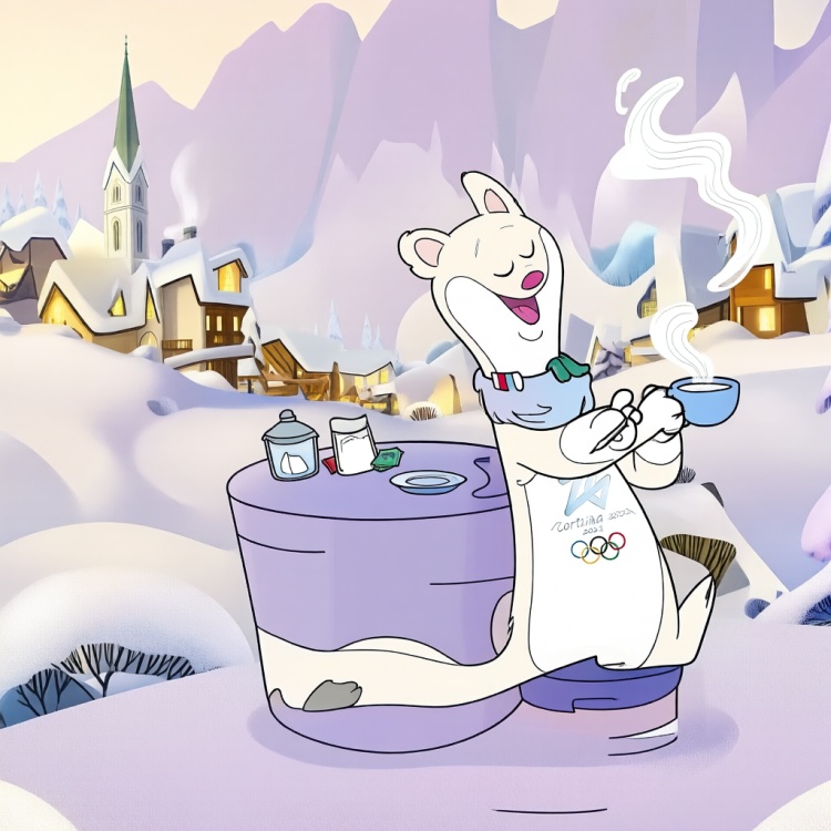 QwTinaMilo, A cheerful white polar bear mascot, wearing a light blue scarf with green, white, and red stripes and a white bib featuring the “Cortina 2026” logo and Olympic rings, stands beside a purple table in a snowy alpine village. The bear holds a steaming blue cup in one paw and a spoon in the other, eyes closed in delight as vapor curls upward. On the table sit a sugar container, a small packet, and a saucer. Behind, snow-covered chalets with glowing windows and a church spire rise against soft lavender mountains under a pale sky. The scene is rendered in smooth, warm-toned animation with gentle shadows, evoking cozy winter charm and festive anticipation.