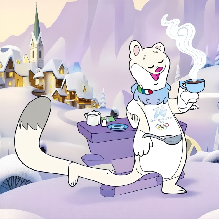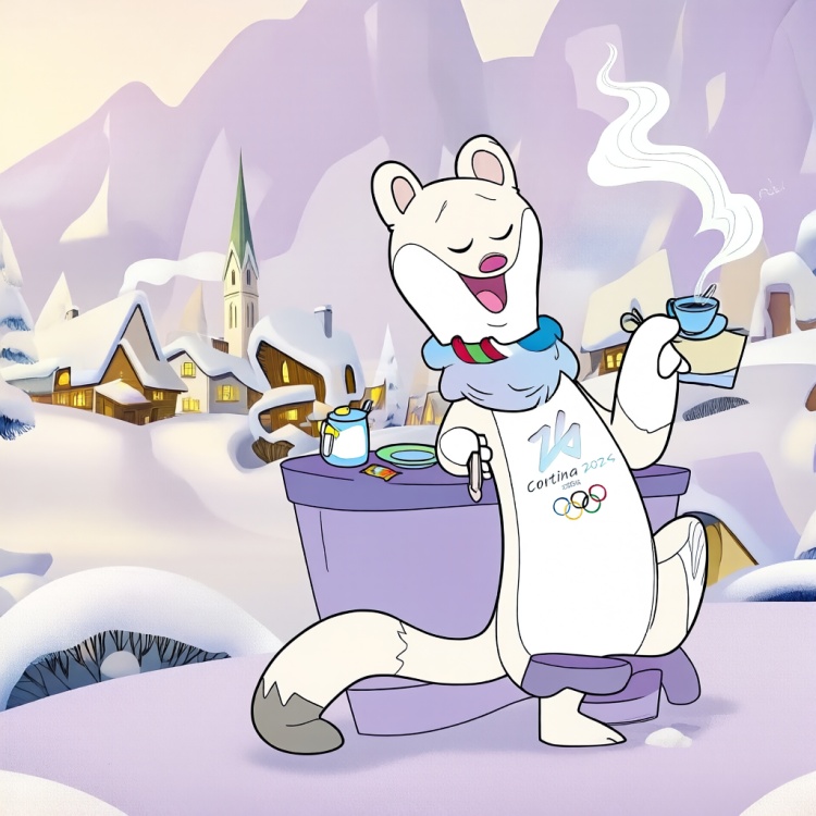 典型元素:雪白/棕褐白鼬造型、米罗的尾巴支撑行走姿态、六朵雪花伙伴弗洛(Flo)。名字取自主办城市缩写(Tina-Cortina, Milo-Milano)、“Dream big”口号徽章。弗洛雪花象征重生,姐弟季节毛色隐喻生态循环。