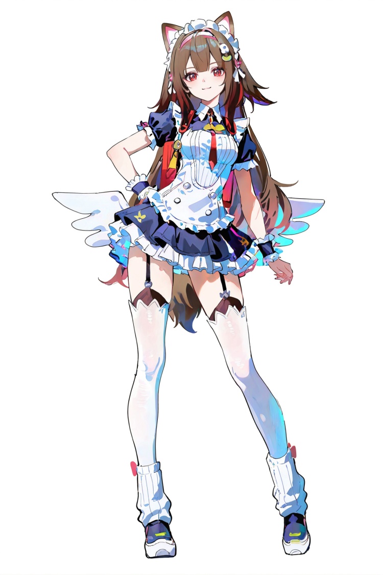 Sunna \(Zenless Zone Zero\),clothes: maid balck-and-white short dress,1girl,maidskin hair ornament,thighhighs,animal ears,short sleeves,green hair,wings,puffy sleeves,white thighhighs,wrist cuffs,maid headdress,garter straps,red backpack,