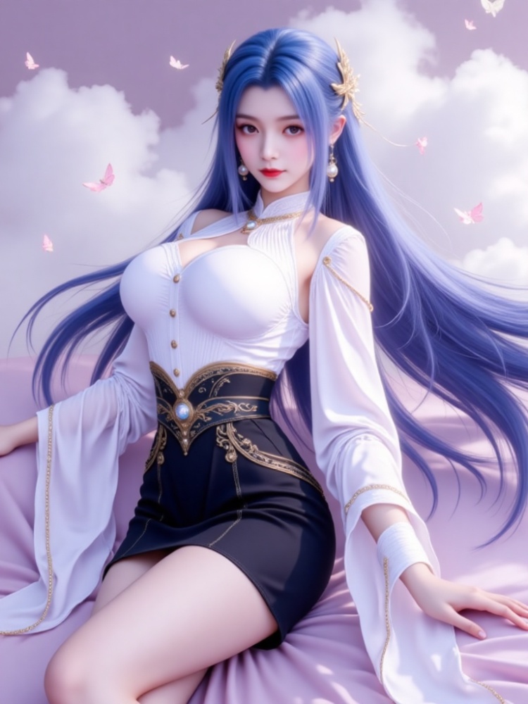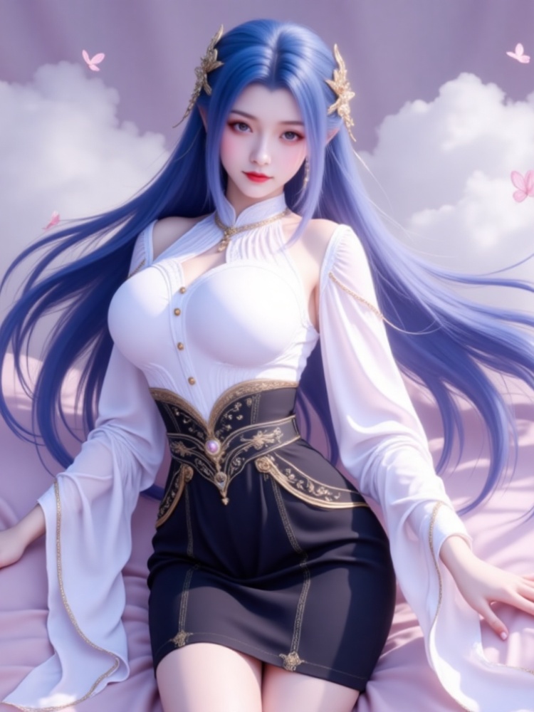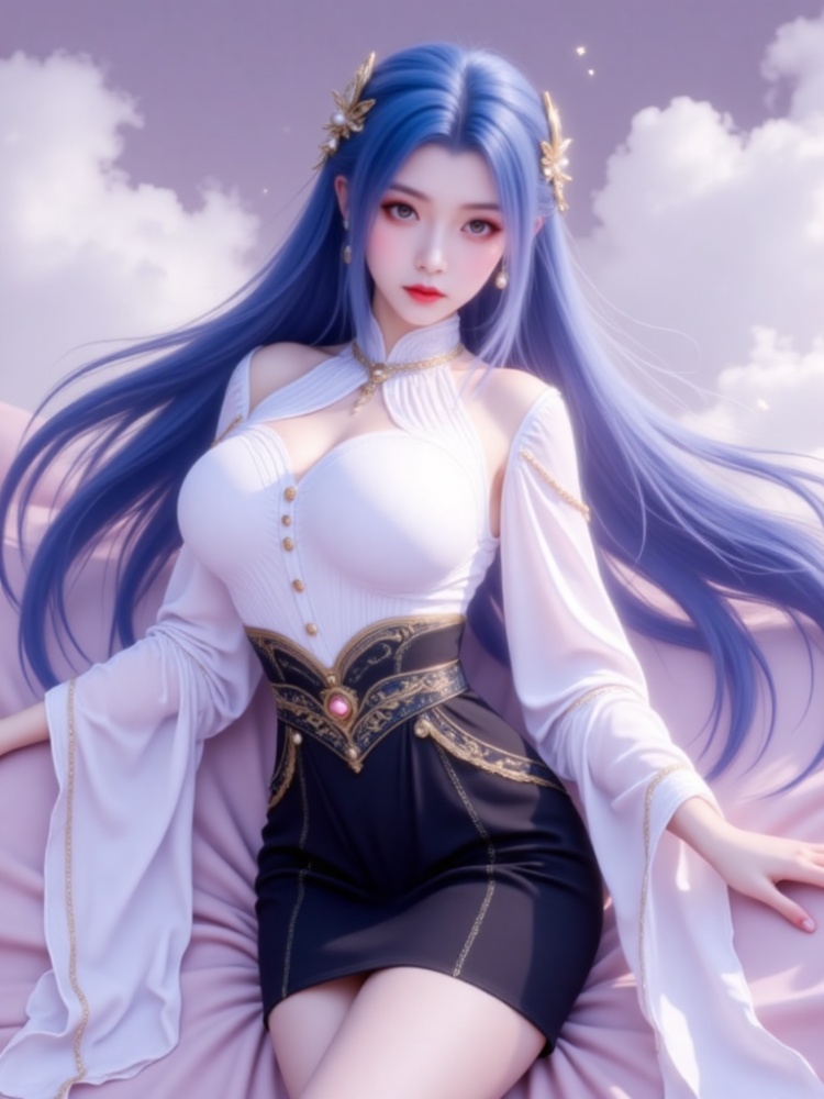 This picture is like a dream in a purple mist, with a blue-haired goddess standing on the clouds, crushing the spirit of fairy rhyme and cool edge in a lavender halo. Her long hair, like a flowing spring condensed by purple mist, dances lightly in the wind into flowing lines of poetry, and the gold ornaments in her hair flutter like butterfly wings, which shine against the pearl earrings in her ears and the gold chain jewels in her neck. Between the eyebrows, the Milky Way is clear, the lips are like coral kissed by morning dew, and the eyes are gentle and alienated, as if they have just woken up from a thousand years' sleep, showing a lazy aestheticism. A white gauze coat is woven like moonlight, with a stand-up collar outlining a soft neckline, gold buttons like stars and awns, and gold chains on sleeves winding like vines; The black skirt on the lower part of the body is like ink cream, the gilded waist is inlaid with precious stones, and the complicated pattern is like a star track in the dark night, which binds the slender waist into an exquisite poem. When the wind blows, the clothes are fluttering, and the softness of the white gauze is intertwined with the rustling of the black skirt. Every inch of the line seems to be carefully carved, with an immortal spirit and sharpness. She leans on the soft lavender couch, her posture is lazy and attractive, her fingertips lightly lean on the couch edge, and her bare feet are untouched by worldly customs, as if she were a goddess coming out of another world. In this purple mist-filled world, she stands still and becomes a painting and a poem.