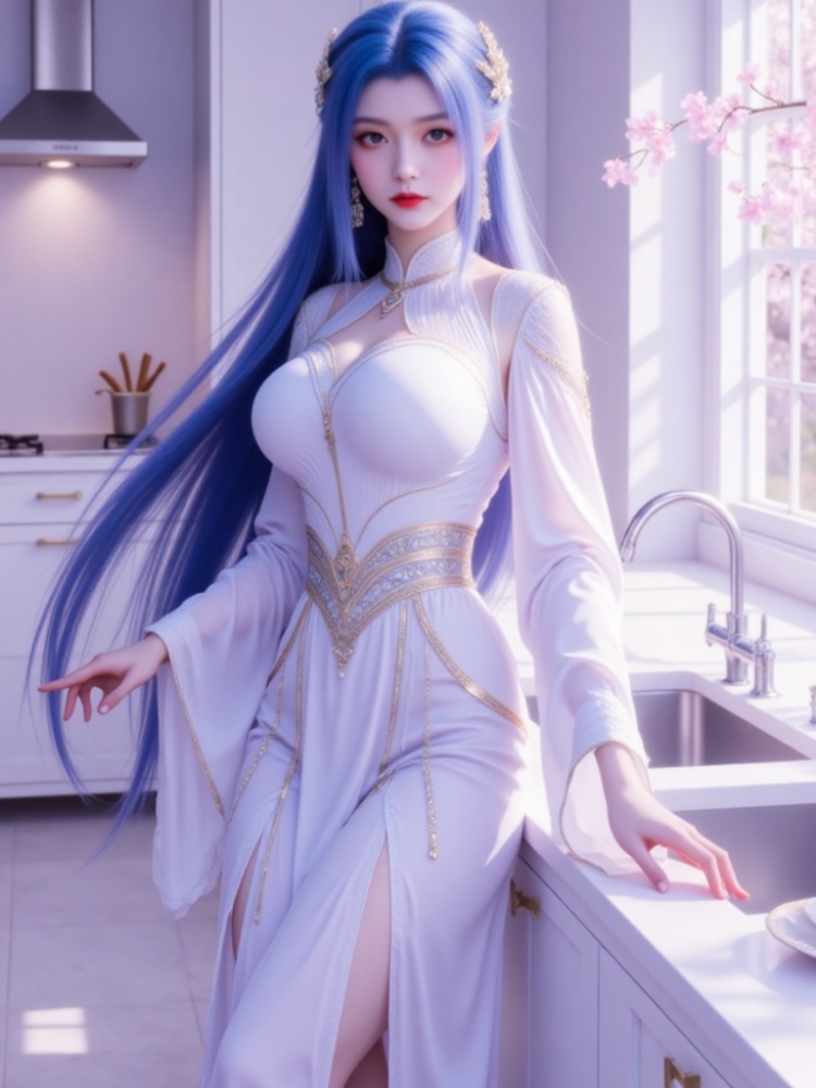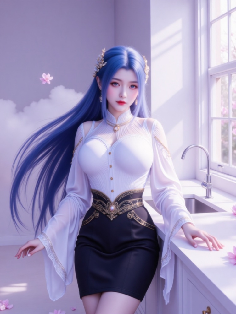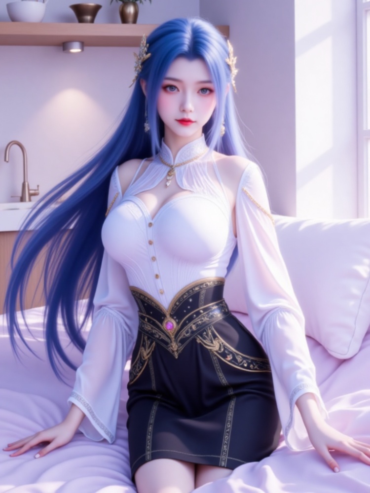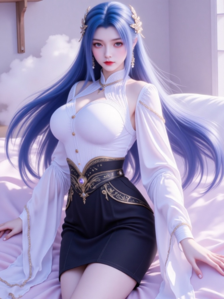 This picture is like a dream in a purple mist, with a blue-haired goddess standing on the clouds, crushing the spirit of fairy rhyme and cool edge in a lavender halo. Her long hair, like a flowing spring condensed by purple mist, dances lightly in the wind into flowing lines of poetry, and the gold ornaments in her hair flutter like butterfly wings, which shine against the pearl earrings in her ears and the gold chain jewels in her neck. Between the eyebrows, the Milky Way is clear, the lips are like coral kissed by morning dew, and the eyes are gentle and alienated, as if they have just woken up from a thousand years' sleep, showing a lazy aestheticism. A white gauze coat is woven like moonlight, with a stand-up collar outlining a soft neckline, gold buttons like stars and awns, and gold chains on sleeves winding like vines; The black skirt on the lower part of the body is like ink cream, the gilded waist is inlaid with precious stones, and the complicated pattern is like a star track in the dark night, which binds the slender waist into an exquisite poem. When the wind blows, the clothes are fluttering, and the softness of the white gauze is intertwined with the rustling of the black skirt. Every inch of the line seems to be carefully carved, with an immortal spirit and sharpness. She leans on the soft lavender couch, her posture is lazy and attractive, her fingertips lightly lean on the couch edge, and her bare feet are untouched by worldly customs, as if she were a goddess coming out of another world. In this purple mist-filled world, she stands still and becomes a painting and a poem.