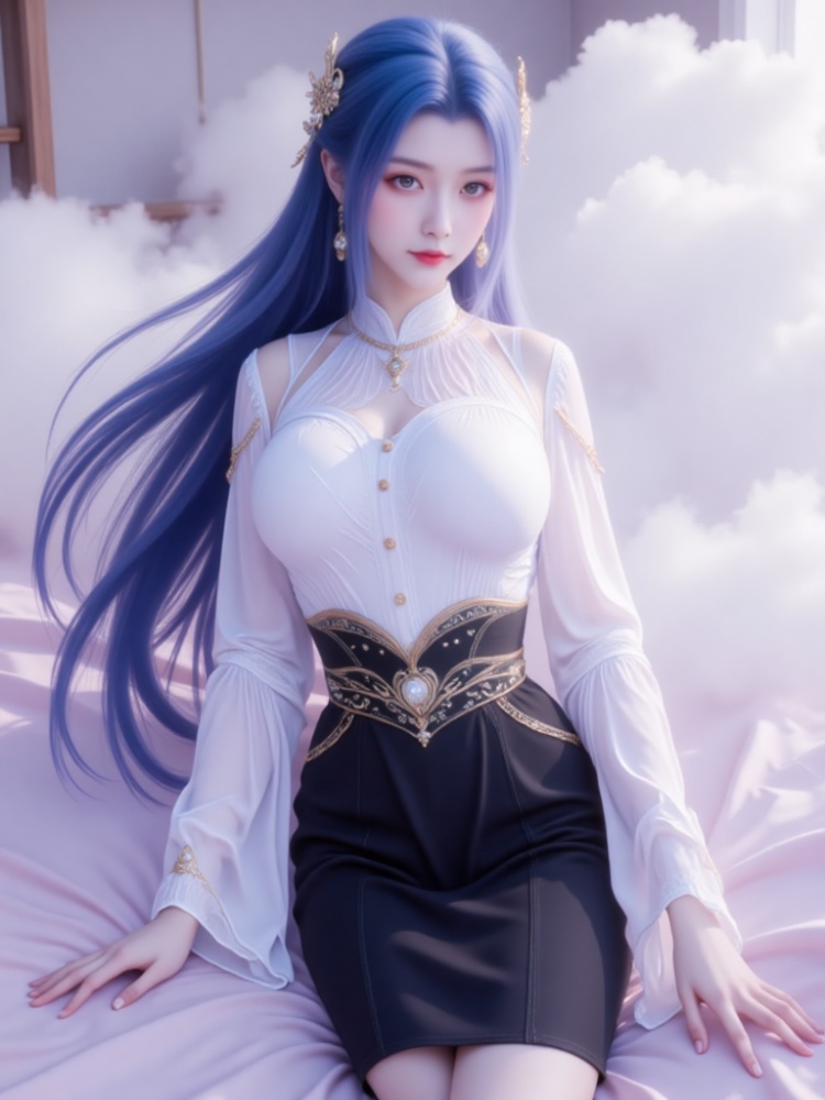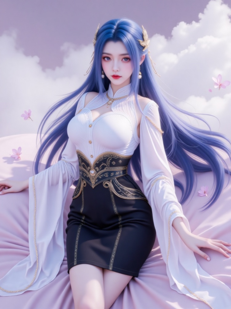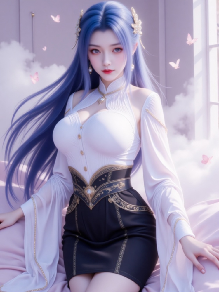 This picture is like a dream in a purple mist, with a blue-haired goddess standing on the clouds, crushing the spirit of fairy rhyme and cool edge in a lavender halo. Her long hair, like a flowing spring condensed by purple mist, dances lightly in the wind into flowing lines of poetry, and the gold ornaments in her hair flutter like butterfly wings, which shine against the pearl earrings in her ears and the gold chain jewels in her neck. Between the eyebrows, the Milky Way is clear, the lips are like coral kissed by morning dew, and the eyes are gentle and alienated, as if they have just woken up from a thousand years' sleep, showing a lazy aestheticism. A white gauze coat is woven like moonlight, with a stand-up collar outlining a soft neckline, gold buttons like stars and awns, and gold chains on sleeves winding like vines; The black skirt on the lower part of the body is like ink cream, the gilded waist is inlaid with precious stones, and the complicated pattern is like a star track in the dark night, which binds the slender waist into an exquisite poem. When the wind blows, the clothes are fluttering, and the softness of the white gauze is intertwined with the rustling of the black skirt. Every inch of the line seems to be carefully carved, with an immortal spirit and sharpness. She leans on the soft lavender couch, her posture is lazy and attractive, her fingertips lightly lean on the couch edge, and her bare feet are untouched by worldly customs, as if she were a goddess coming out of another world. In this purple mist-filled world, she stands still and becomes a painting and a poem.