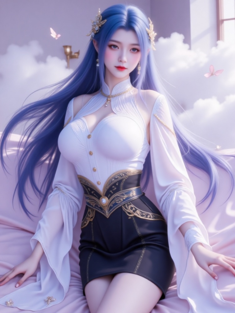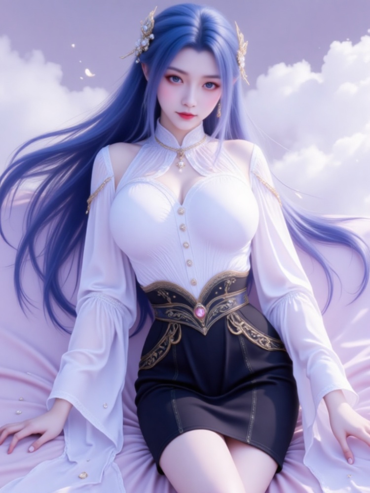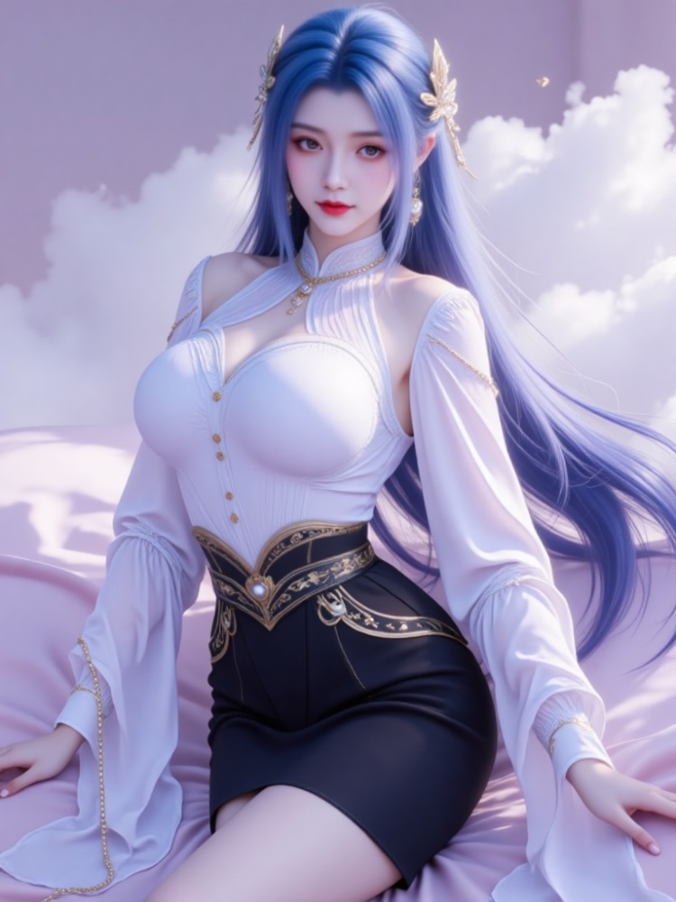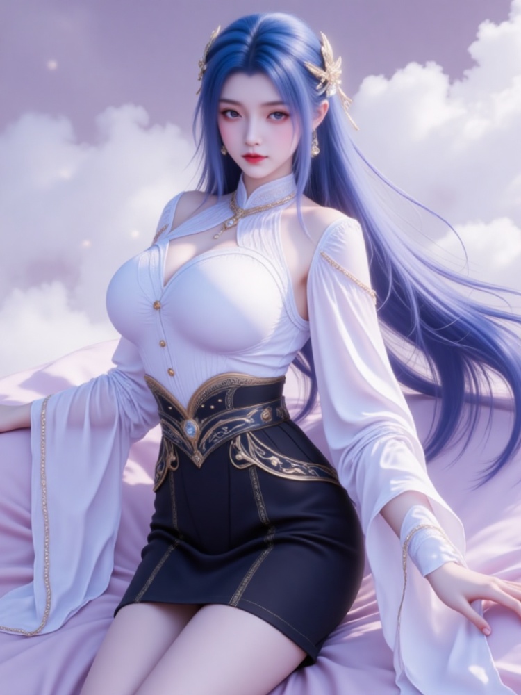 This picture is like a dream in a purple mist, with a blue-haired goddess standing on the clouds, crushing the spirit of fairy rhyme and cool edge in a lavender halo. Her long hair, like a flowing spring condensed by purple mist, dances lightly in the wind into flowing lines of poetry, and the gold ornaments in her hair flutter like butterfly wings, which shine against the pearl earrings in her ears and the gold chain jewels in her neck. Between the eyebrows, the Milky Way is clear, the lips are like coral kissed by morning dew, and the eyes are gentle and alienated, as if they have just woken up from a thousand years' sleep, showing a lazy aestheticism. A white gauze coat is woven like moonlight, with a stand-up collar outlining a soft neckline, gold buttons like stars and awns, and gold chains on sleeves winding like vines; The black skirt on the lower part of the body is like ink cream, the gilded waist is inlaid with precious stones, and the complicated pattern is like a star track in the dark night, which binds the slender waist into an exquisite poem. When the wind blows, the clothes are fluttering, and the softness of the white gauze is intertwined with the rustling of the black skirt. Every inch of the line seems to be carefully carved, with an immortal spirit and sharpness. She leans on the soft lavender couch, her posture is lazy and attractive, her fingertips lightly lean on the couch edge, and her bare feet are untouched by worldly customs, as if she were a goddess coming out of another world. In this purple mist-filled world, she stands still and becomes a painting and a poem.