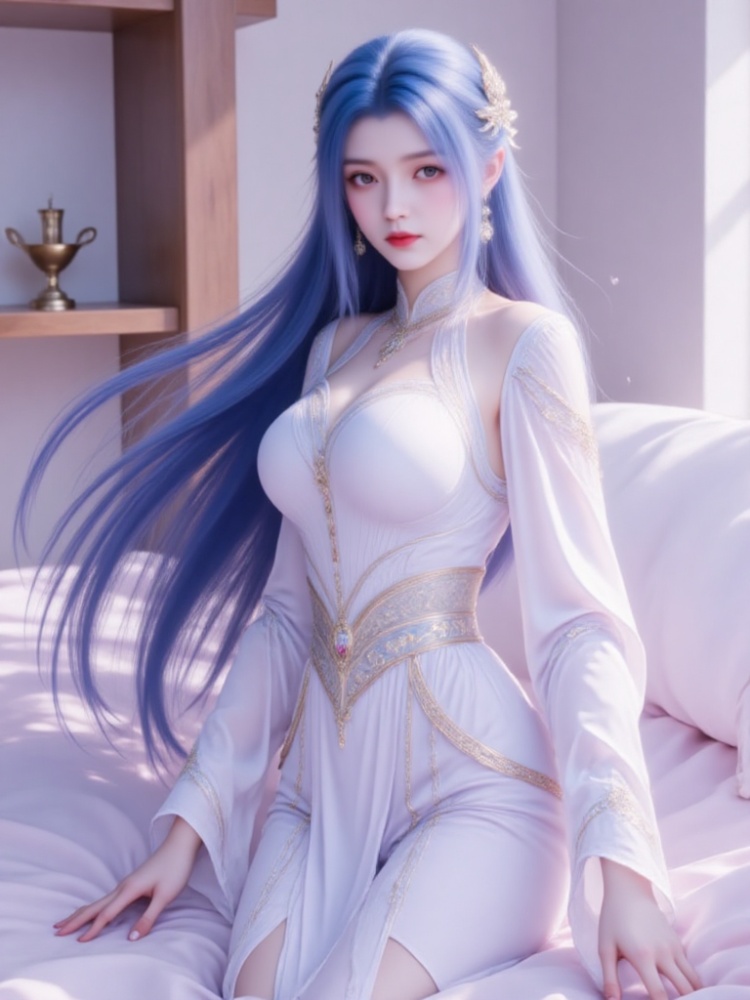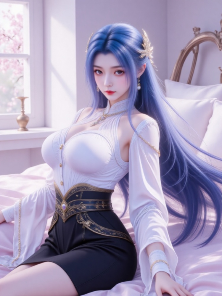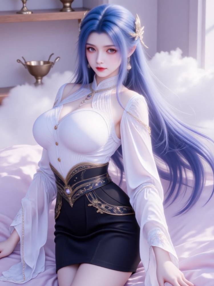This picture is like a dream in a purple mist, with a blue-haired goddess standing on the clouds, crushing the spirit of fairy rhyme and cool edge in a lavender halo. Her long hair, like a flowing spring condensed by purple mist, dances lightly in the wind into flowing lines of poetry, and the gold ornaments in her hair flutter like butterfly wings, which shine against the pearl earrings in her ears and the gold chain jewels in her neck. Between the eyebrows, the Milky Way is clear, the lips are like coral kissed by morning dew, and the eyes are gentle and alienated, as if they have just woken up from a thousand years' sleep, showing a lazy aestheticism. A white gauze coat is woven like moonlight, with a stand-up collar outlining a soft neckline, gold buttons like stars and awns, and gold chains on sleeves winding like vines; The black skirt on the lower part of the body is like ink cream, the gilded waist is inlaid with precious stones, and the complicated pattern is like a star track in the dark night, which binds the slender waist into an exquisite poem. When the wind blows, the clothes are fluttering, and the softness of the white gauze is intertwined with the rustling of the black skirt. Every inch of the line seems to be carefully carved, with an immortal spirit and sharpness. She leans on the soft lavender couch, her posture is lazy and attractive, her fingertips lightly lean on the couch edge, and her bare feet are untouched by worldly customs, as if she were a goddess coming out of another world. In this purple mist-filled world, she stands still and becomes a painting and a poem.