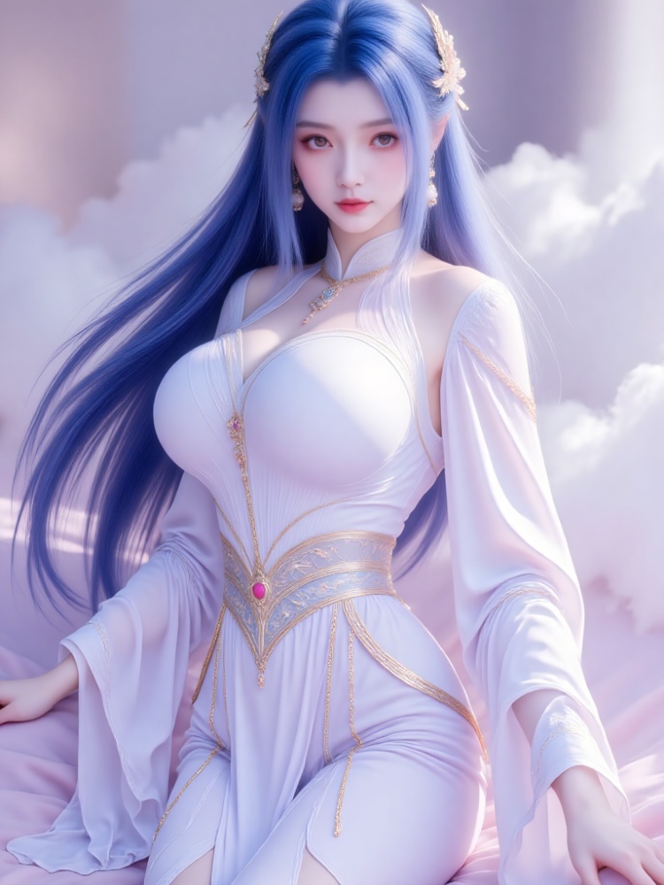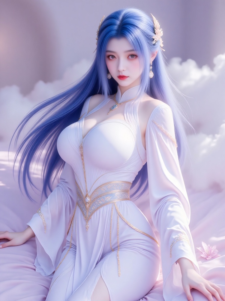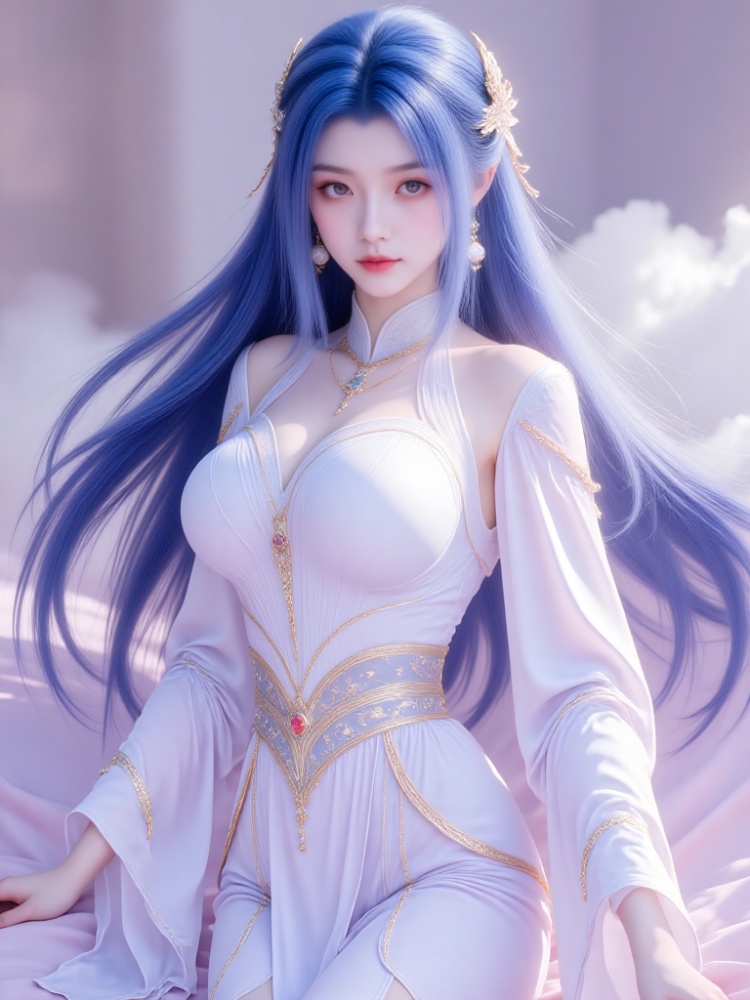 This picture is like a dream in a purple mist, with a blue-haired goddess standing on the clouds, crushing the spirit of fairy rhyme and cool edge in a lavender halo. Her long hair, like a flowing spring condensed by purple mist, dances lightly in the wind into flowing lines of poetry, and the gold ornaments in her hair flutter like butterfly wings, which shine against the pearl earrings in her ears and the gold chain jewels in her neck. Between the eyebrows, the Milky Way is clear, the lips are like coral kissed by morning dew, and the eyes are gentle and alienated, as if they have just woken up from a thousand years' sleep, showing a lazy aestheticism. A white gauze coat is woven like moonlight, with a stand-up collar outlining a soft neckline, gold buttons like stars and awns, and gold chains on sleeves winding like vines; The black skirt on the lower part of the body is like ink cream, the gilded waist is inlaid with precious stones, and the complicated pattern is like a star track in the dark night, which binds the slender waist into an exquisite poem. When the wind blows, the clothes are fluttering, and the softness of the white gauze is intertwined with the rustling of the black skirt. Every inch of the line seems to be carefully carved, with an immortal spirit and sharpness. She leans on the soft lavender couch, her posture is lazy and attractive, her fingertips lightly lean on the couch edge, and her bare feet are untouched by worldly customs, as if she were a goddess coming out of another world. In this purple mist-filled world, she stands still and becomes a painting and a poem.