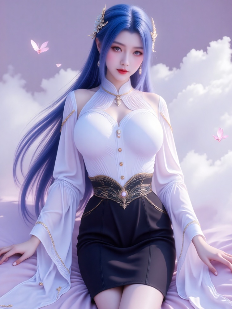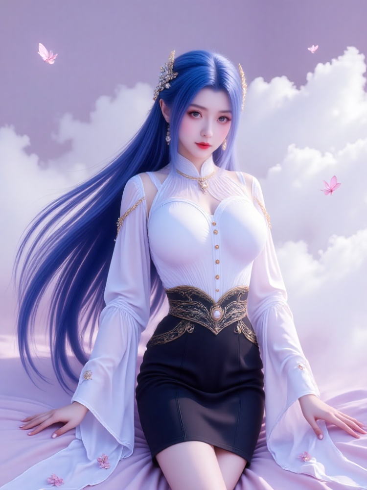 This picture is like a dream in a purple mist, with a blue-haired goddess standing on the clouds, crushing the spirit of fairy rhyme and cool edge in a lavender halo. Her long hair, like a flowing spring condensed by purple mist, dances lightly in the wind into flowing lines of poetry, and the gold ornaments in her hair flutter like butterfly wings, which shine against the pearl earrings in her ears and the gold chain jewels in her neck. Between the eyebrows, the Milky Way is clear, the lips are like coral kissed by morning dew, and the eyes are gentle and alienated, as if they have just woken up from a thousand years' sleep, showing a lazy aestheticism. A white gauze coat is woven like moonlight, with a stand-up collar outlining a soft neckline, gold buttons like stars and awns, and gold chains on sleeves winding like vines; The black skirt on the lower part of the body is like ink cream, the gilded waist is inlaid with precious stones, Show slender jade feet,Barefoot, ankle tied with a red rope decorated with exquisite bells.and the complicated pattern is like a star track in the dark night, which binds the slender waist into an exquisite poem. When the wind blows, the clothes are fluttering, and the softness of the white gauze is intertwined with the rustling of the black skirt. Every inch of the line seems to be carefully carved, with an immortal spirit and sharpness. She Walking barefoot on the flower road between the clouds,clothes are fluttering, and every step breaks the silence of Yuntao. The flower road at the foot winds out from the depths of the sea of clouds, and the white and pink petals are laid out, reflecting the clouds and waves, as if it were a ladder from the world to the Heavenly Palace. There are a few butterflies dancing in the air, and the sea of clouds is no longer just an ethereal secret, but also a tender fairy tale, with the sweetness of flowers in the wind and her figure reflected in the clouds. Even the time has slowed down at this moment, just to keep the gentleness of stepping on the clouds.(long-distance shooting, full-body portrait of a character, panoramic lens, and the portrait of a character presents itself in the painting from head to toe).