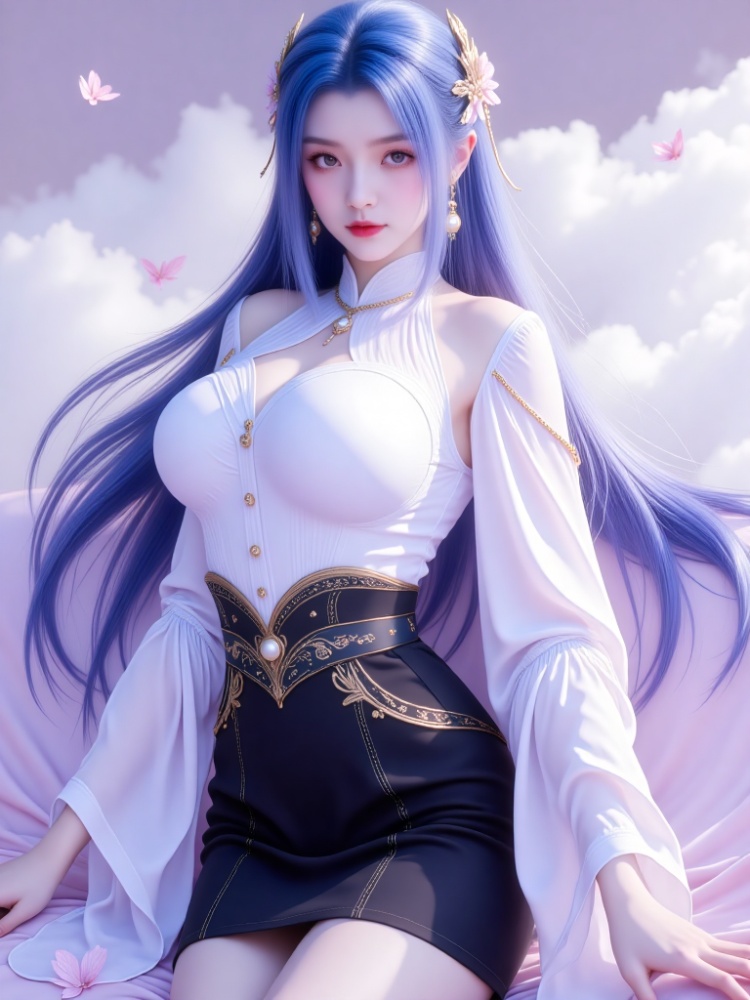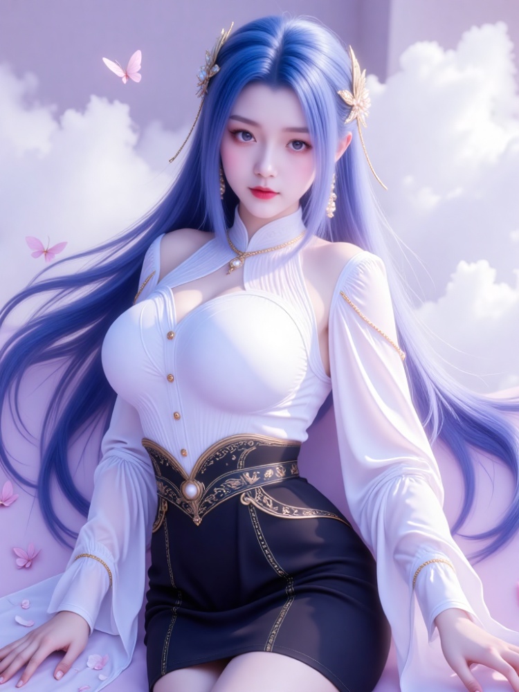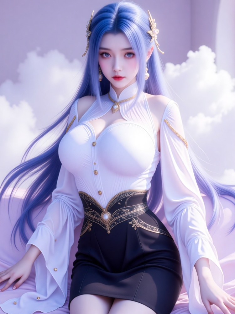 This picture is like a dream in a purple mist. A blue-haired goddess is standing in the clouds, crushing the fairy rhyme and cool-edge spirits in a lavender halo. Her long hair is like flowing spring water condensed by purple mist, dancing lightly in the wind into flowing poems, and the gold ornaments in her hair flutter like butterfly wings, shining against the pearl earrings in her ears and the gold chain jewels in her neck. Between the eyebrows, the Milky Way is clear, the lips are like corals kissed by morning dew, and the eyes are gentle and alienated, as if they have just woken up from a thousand-year sleep, showing a lazy aestheticism. The upper body is wearing a white gauze blouse, which is woven like moonlight. The vertical collar outlines a soft neckline, showing a beautiful chest curve. The gold buttons are like stars, and the gold chains on the sleeves are like vines. The black knee-length skirt of the lower body is like ink cream, revealing slender jade feet, and a red rope decorated with exquisite bells is tied at the ankle of barefoot. The gilded waist is inlaid with precious stones, and the complicated patterns, such as star tracks in the dark night, bind the slender waist into a delicate poem. When the wind blows, the clothes are fluttering, the softness of the white gauze is intertwined with the rustling of the black skirt, and every inch of the line seems to have been carefully carved. She walked on the flower path full of sea of clouds, elegant and lazy, and her bare feet were unmoved by the world, as if she were a goddess coming out of another world. In this purple fog-filled world, she stood still and turned into a painting.