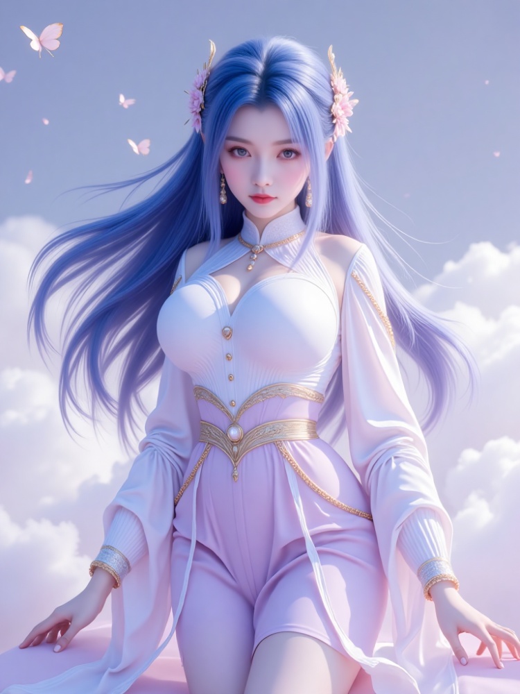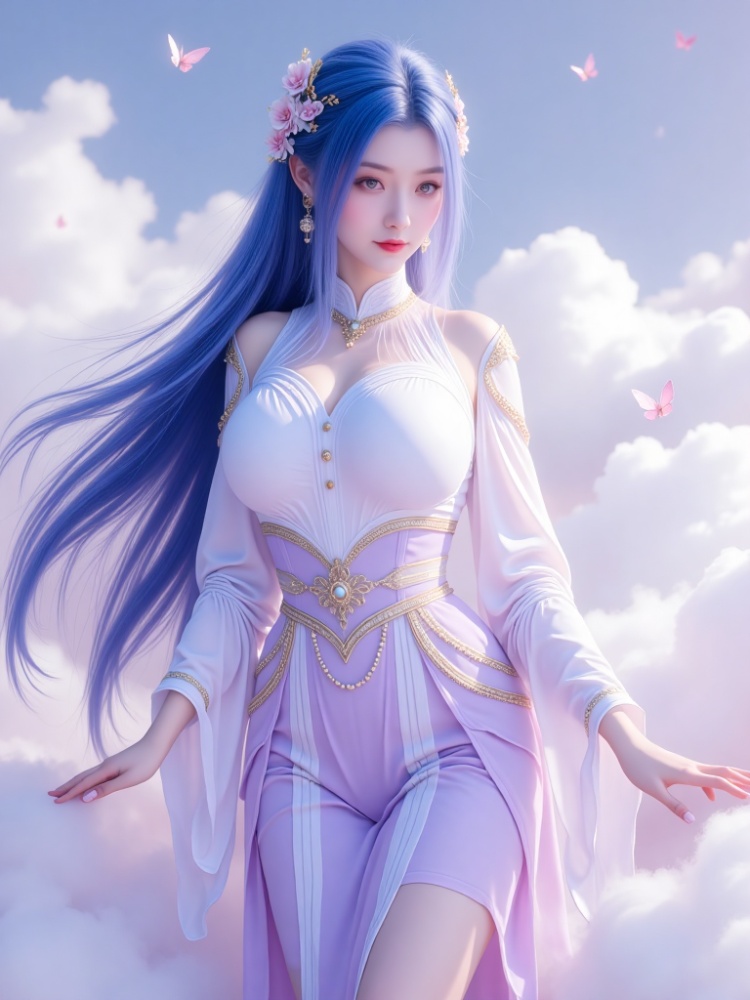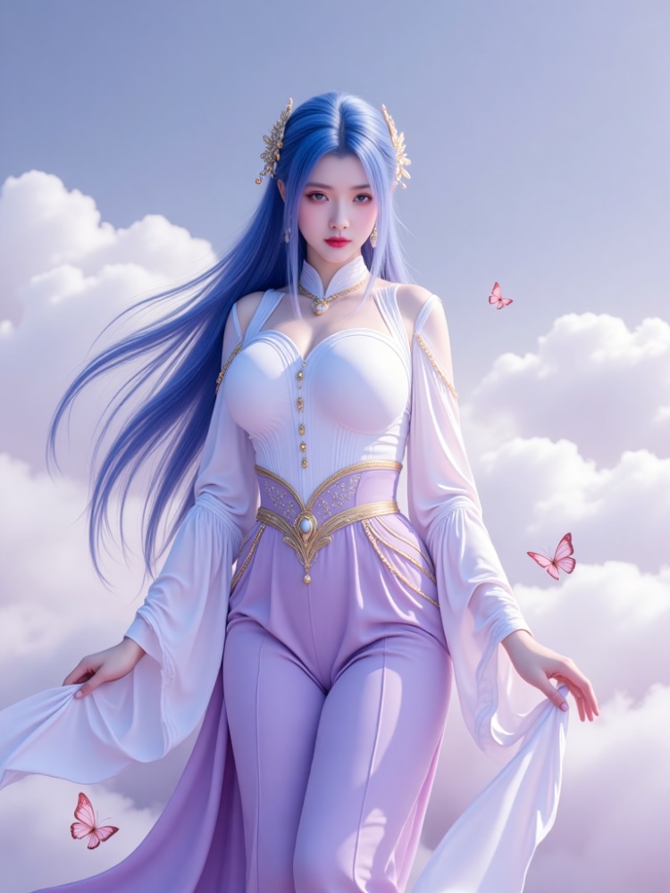 This picture is like a dream in a purple mist. A blue-haired goddess is standing in the clouds, crushing the fairy rhyme and cool-edge spirits in a lavender halo. Her long hair is like flowing spring water condensed by purple mist, dancing lightly in the wind into flowing poems, and the gold ornaments in her hair flutter like butterfly wings, shining against the pearl earrings in her ears and the gold chain jewels in her neck. Between the eyebrows, the Milky Way is clear, the lips are like corals kissed by morning dew, and the eyes are gentle and alienated, as if they have just woken up from a thousand-year sleep, showing a lazy aestheticism. The upper body is wearing a white gauze blouse, which is woven like moonlight. The vertical collar outlines a soft neckline, showing a beautiful chest curve. The gold buttons are like stars, and the gold chains on the sleeves are like vines. The black knee-length skirt of the lower body is like ink cream, revealing slender jade feet, and a red rope decorated with exquisite bells is tied at the ankle of barefoot. The gilded waist is inlaid with precious stones, and the complicated patterns, such as star tracks in the dark night, bind the slender waist into a delicate poem. When the wind blows, the clothes are fluttering, the softness of the white gauze is intertwined with the rustling of the black skirt, and every inch of the line seems to have been carefully carved. She walked on the flower path full of sea of clouds, elegant and lazy, and her bare feet were unmoved by the world, as if she were a goddess coming out of another world. In this purple fog-filled world, she stood still and turned into a painting.