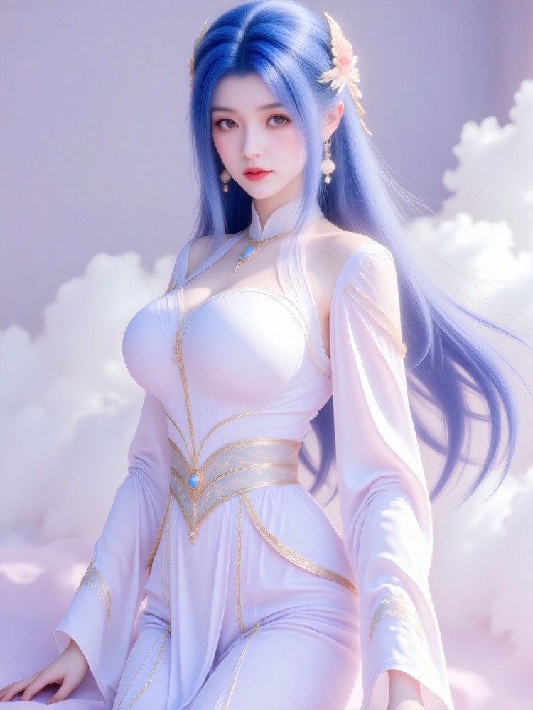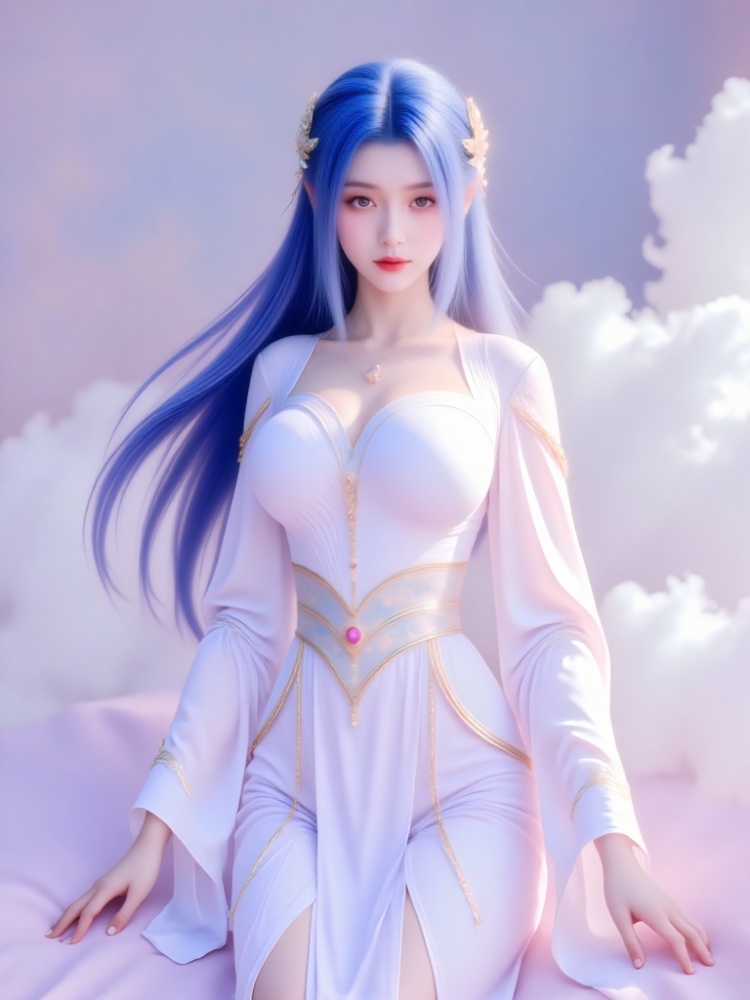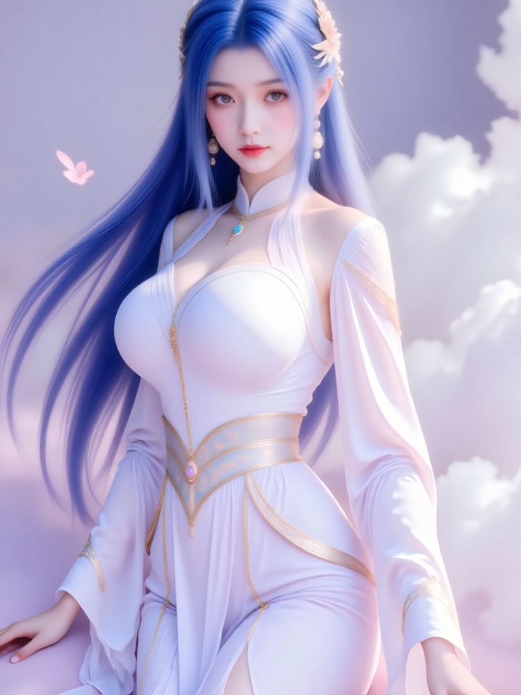 This picture is like a fairy rhyme poem immersed in lavender soft light, and a blue-haired woman stands gracefully in the sea of clouds. Her long hair, like a flowing spring condensed in the deep sea, hangs lightly in the wind into flowing lines of poetry, with a deep blue luster at the tip, which is in harmony with the coolness between the eyebrows and eyes. Lip color is like coral kissed by morning dew, eyes are gentle and a little alienated, as if just waking up from a thousand-year dream. A white gauze skirt is woven like moonlight, and the golden pattern is lightly decorated like a star, showing a proud chest curve and outlining a soft shoulder line and waist. The jewels at the waist are like pearls left in the deep sea, and the white gauze draped outside is like butterflies' wings, and the clothes are fluttering when the wind passes. Every wrinkle seems to be carefully carved, with a fairy-spirit that is not stained with worldly customs. The thin chain between the neck and the bead ornaments between the ears are warm and lustrous in the soft light, adding a bit of gentleness. The background is the blue sky and the sea of clouds. She walks barefoot on the flower path among the clouds, revealing slender and slender jade feet. A red rope decorated with exquisite bells is tied to her ankle, and her skirt flutters with the wind. The flower path at her feet winds out from the depths of the sea of clouds, and white and pink petals spread out, reflecting clouds and waves, as if it were a ladder from the earth to the Tiangong. There are several butterflies flying in the air. The sea of clouds is no longer just an ethereal secret, but also a gentle fairy tale, and her figure is reflected in the clouds. Even time slowed down at this moment, just to keep the gentleness of stepping on the clouds. All the focus is on her, and the whole picture is like a simple poem. The collision between fairy and mortal makes every strand of hair, every veil and every light tell that she is a fallen fairy in the soft light and a clear rhyme on earth. In this world, she stands still and becomes a painting. (Long-distance shooting, full-body portrait, panoramic lens, portrait presented in the painting from head to toe).