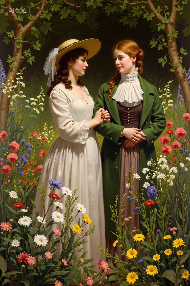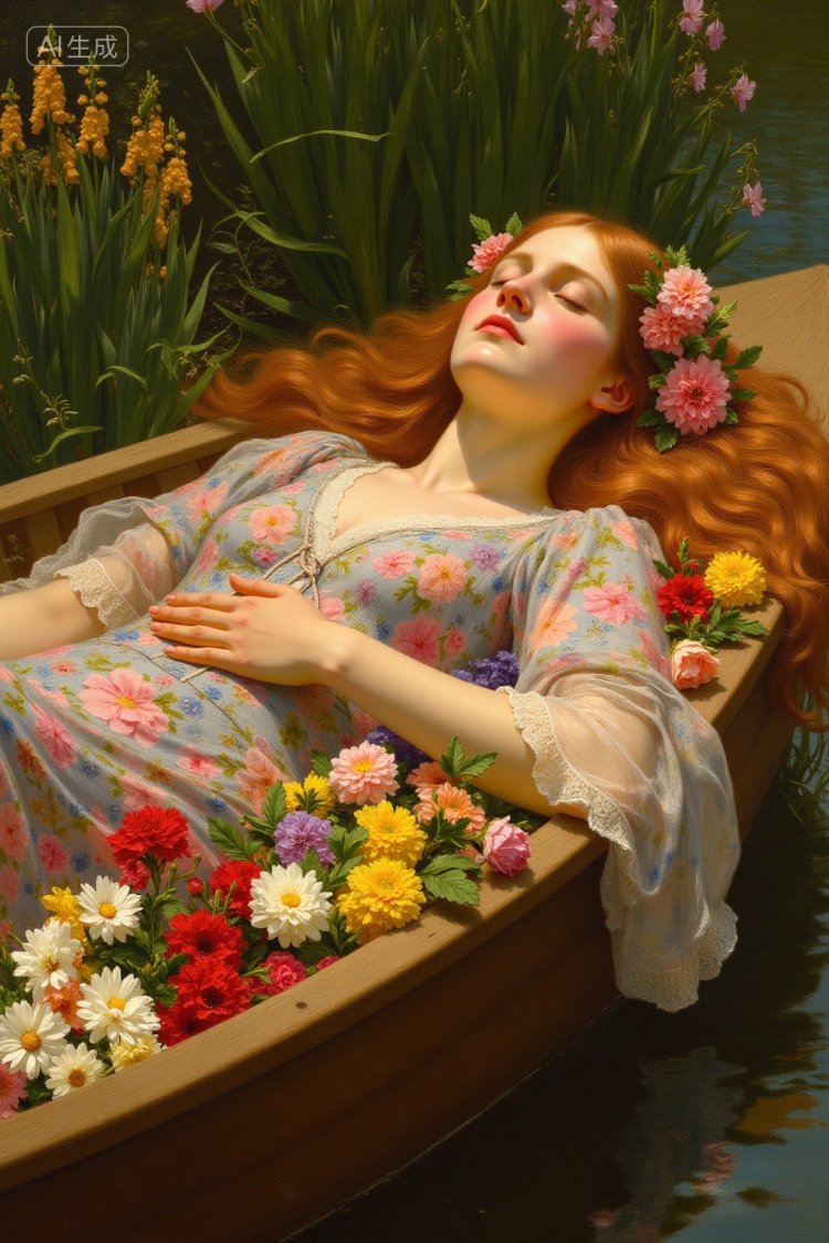 举例自然词汇如一幅细节逼真的油画,描绘了一位平静、皮肤白皙、长而飘逸的赤褐色头发、饰有鲜花的女子躺在一艘装满鲜花的木船里。她穿着碎花裙,闭着眼睛,沐浴在阳光明媚、郁郁葱葱的花园里,生成想要的油画。