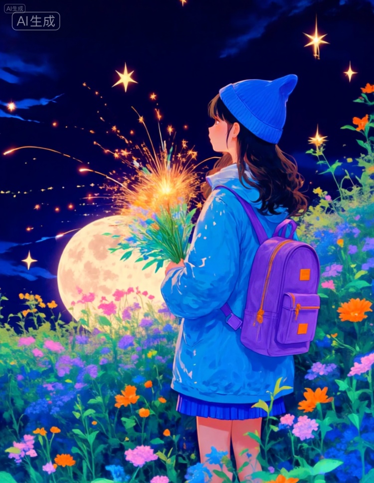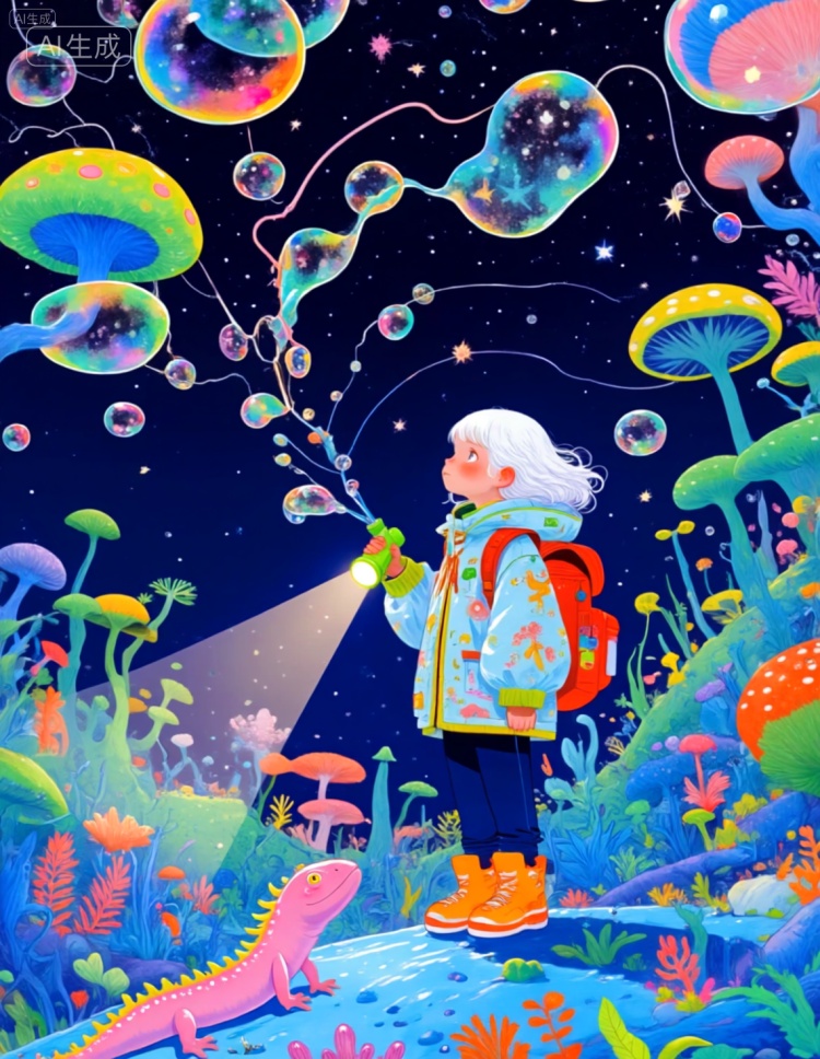 推荐自然词汇如: cxs,一位白发的小孩手持手电筒,站在一个充满奇幻色彩的异世界中,周围是形态各异,色彩斑斓的植物和生物,背景是一片星空,巨大的彩色气泡漂浮在空中,小孩穿着一件带有图案的夹克,背着红色背包,脚边有一只粉色的类似蝾螈的生物,整个场景充满了童趣和想象力,展现了探索未知世界的奇妙旅程,生成自己想要的画面。