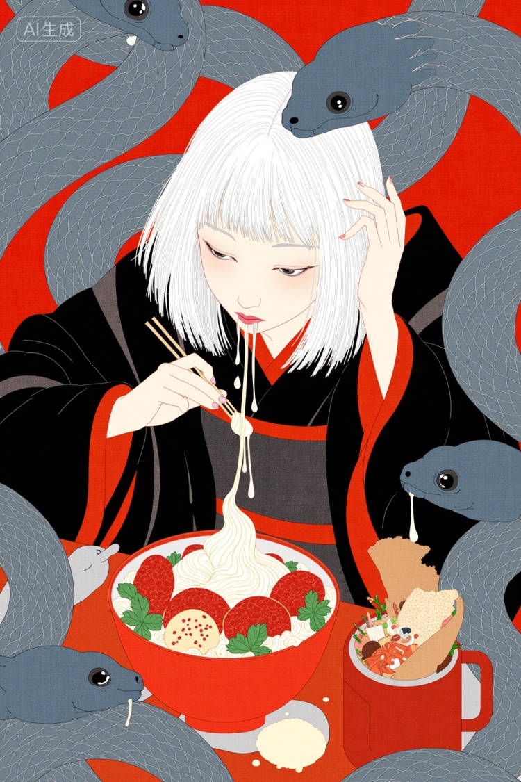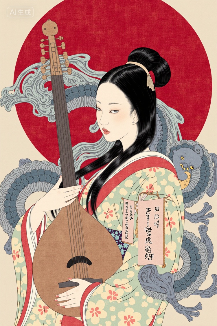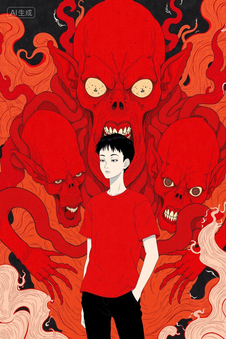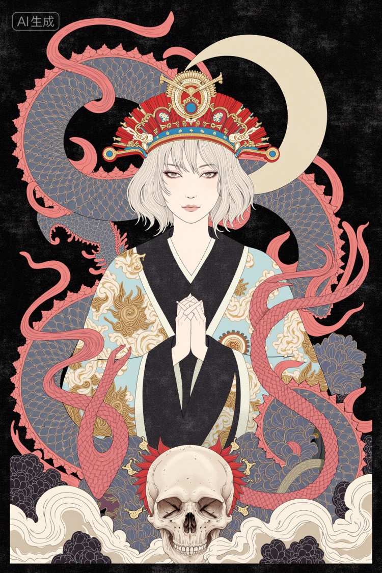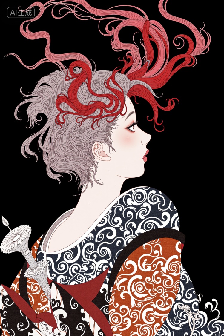 浮世绘复古艺术结合怪诞恐怖风格,丰富抽象的画面表现,氛围感强,突出主体,可适用于手机壁纸,动漫游戏概念,艺术插画视觉,纹身图案等方面...