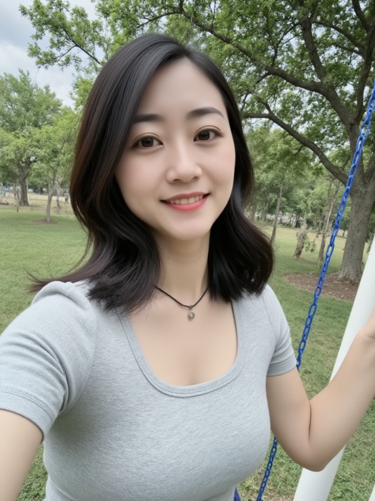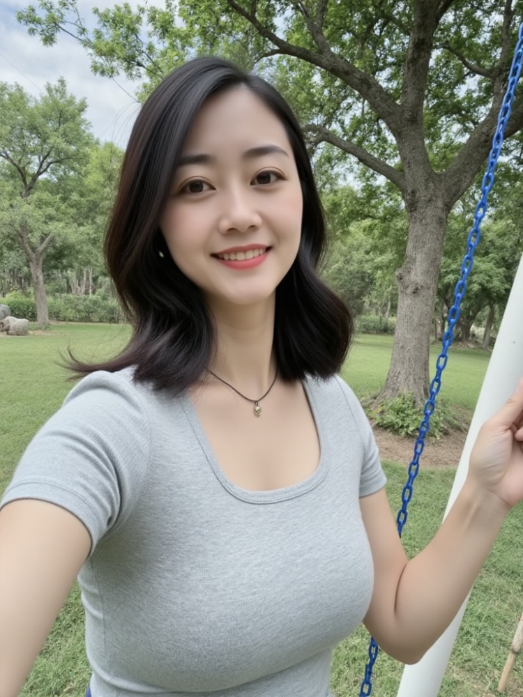 SkY, Garden, PeonY, 1 Girl, solo, Front Shot, Tilt Head, Toot Mouth, Long Hair, Looking at the Viewer, Smile, Black Hair, Hair decoration, embroidered cheongsam, brown eYes, jewellerY, standing, top half, flower, waist up, earrings, necklace, Chinese dress, realistic, selfie, Left hand ratio